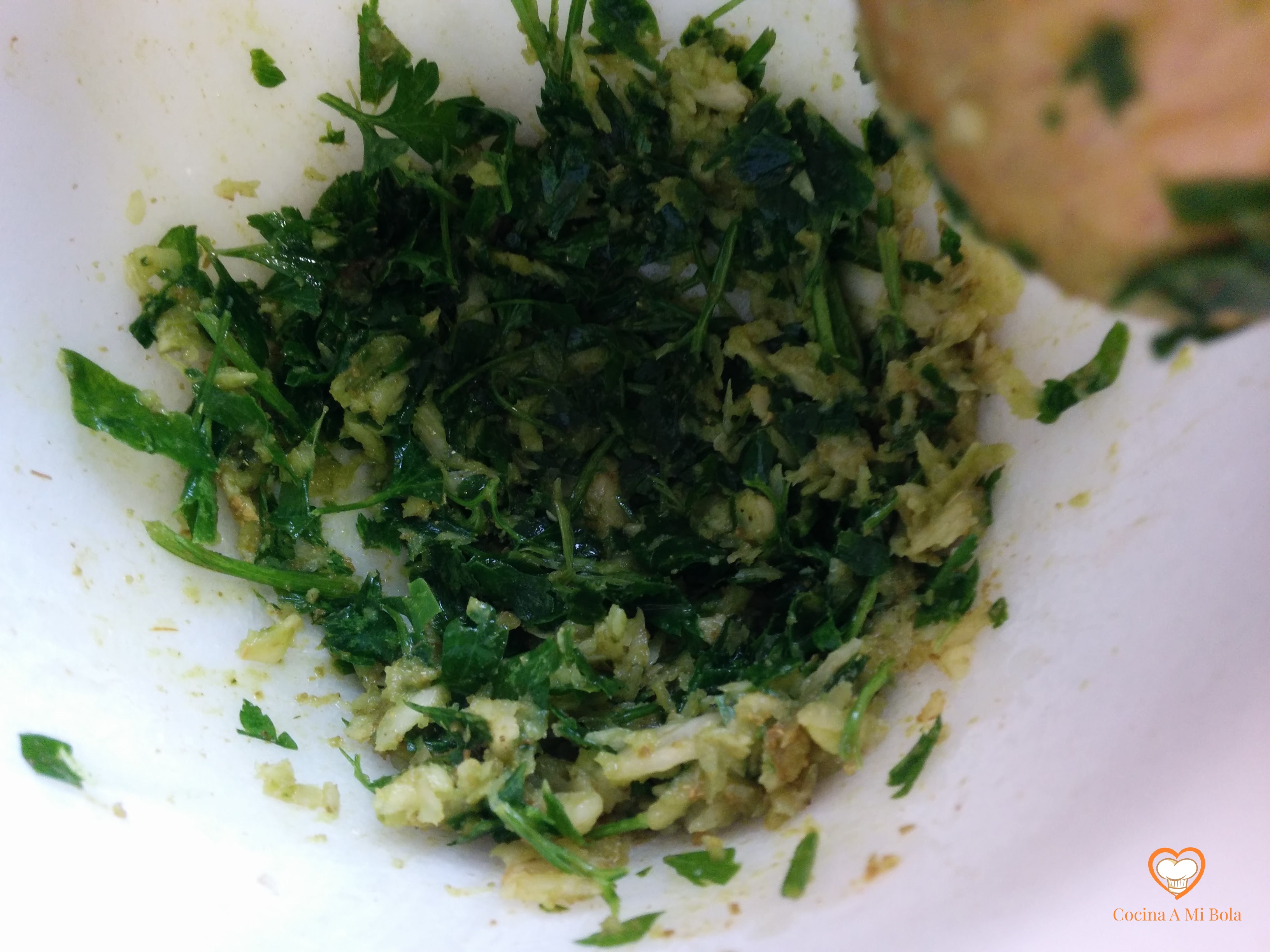 CUARTO.- Mientras tanto, echa en el mortero los 5 dientes de ajo que teníamos reservados junto con una pizca de sal (para que no resbalen), un puñado de perejil y media cucharadita de cominos. Májalo hasta que unifique todo; añade un chorrito de vinagre de manzana y de aceite de oliva virgen extra y mézclalo bien.