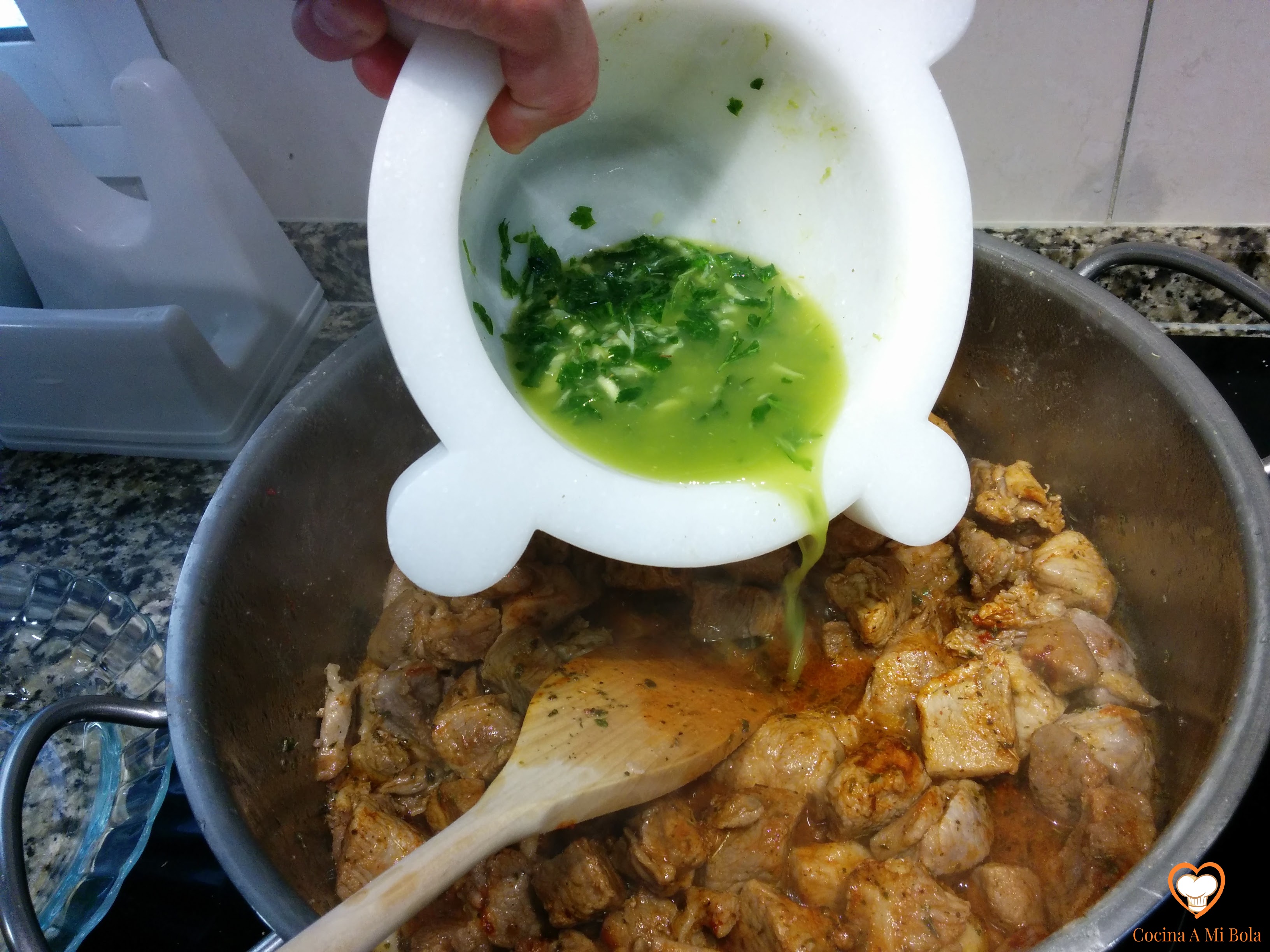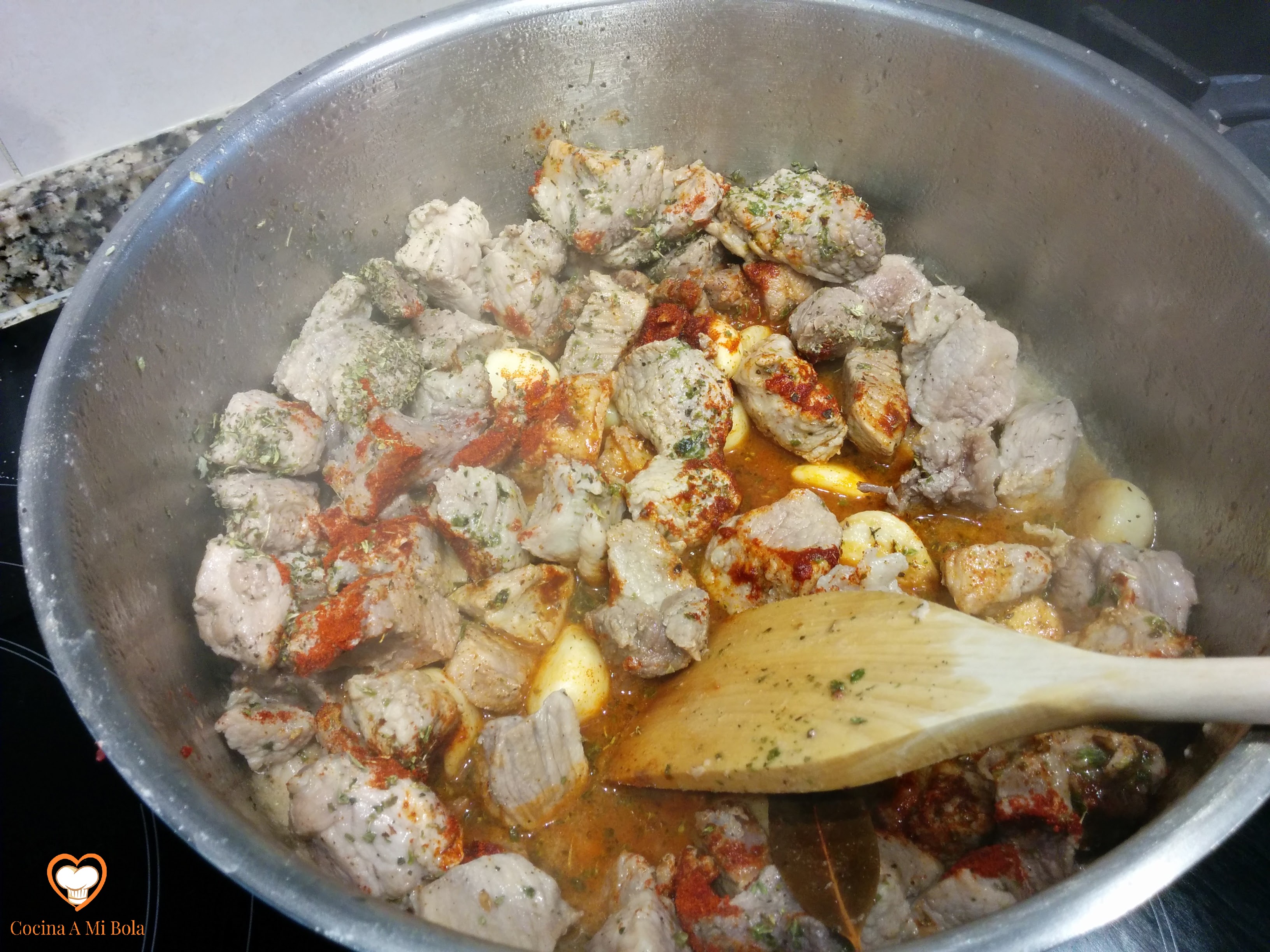 QUINTO.- Rehogada ya la carne, baja el fuego y echa sobre ella una cucharada sopera de pimentón dulce, removiendo bien para -inmediatamente- añadir el majado que tenemos en el mortero.  Rehoga un minutillo más pero vigila para que no se queme el pimentón.