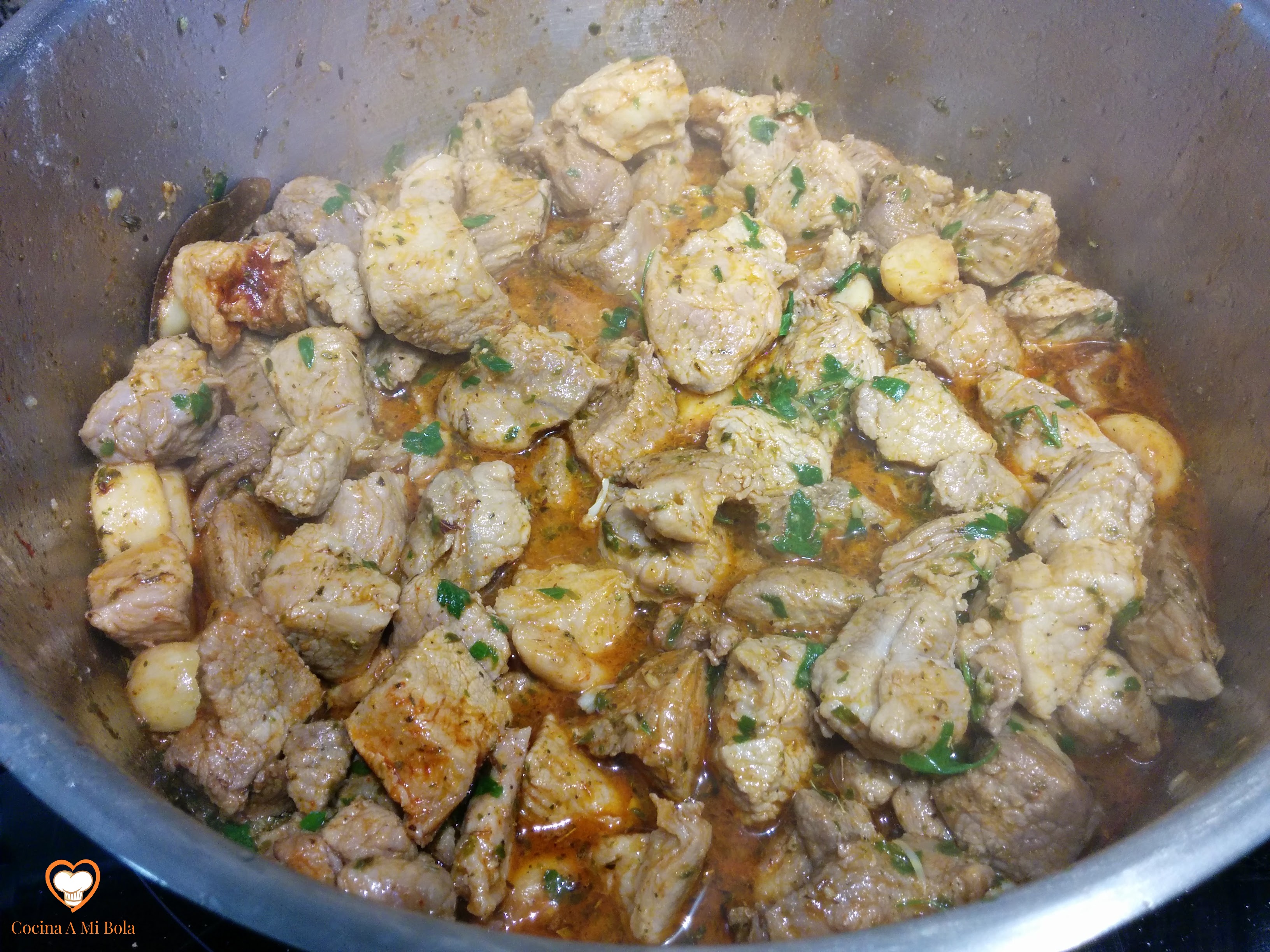 SEXTO.- Echa 300 cc de vinagre de manzana, sube el fuego y remueve bien. Tenlo así otro minuto desde que hierva y añade ahora agua hasta que cubra la carne. Quizá algo menos, es decir, que asome mínimamente por encima del agua. Fuego intenso durante tres minutos y luego lo bajamos al mínimo dejándolo cocer y reducir hasta que la carne esté tierna removiendo de cuando en cuando. Será como media hora a olla abierta. El magro de cerdo hay que tenerlo cociendo hasta que esté blando porque aunque cortes un trozo por la mitad y veas que ya no está crudo por dentro, estará bastante durillo y eso sólo se arregla con tiempo de cocción lenta. Prueba y rectifica de sal.