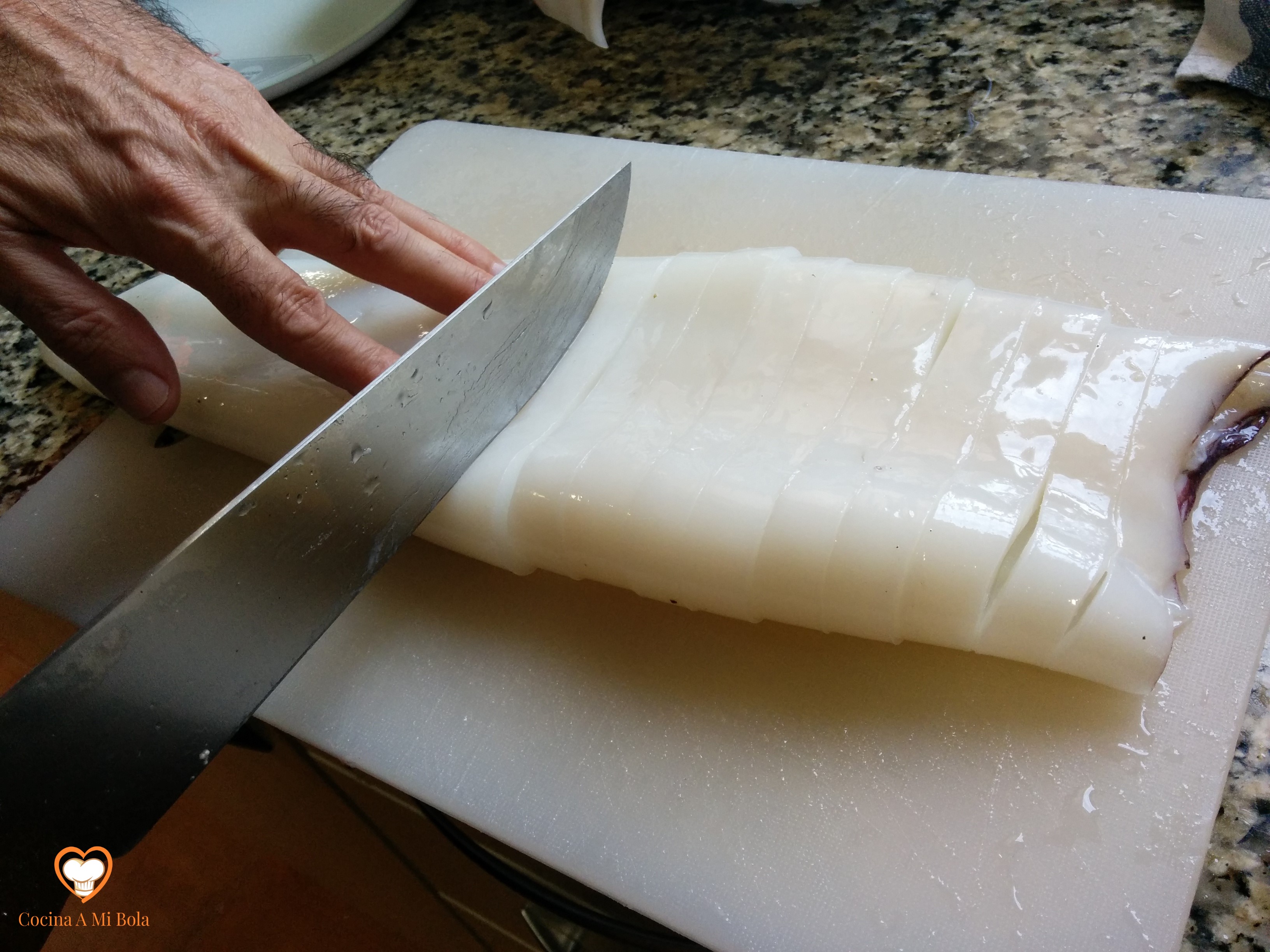 OCTAVO.- Y volvemos con el calamar. Colócalo ya limpio sobre una tabla y con un cuchillo grande y bien afilado hazle unos cortes transversales de forma que sólo alcancen a la parte de arriba sin llegar a seccionarlo entero pues se separarían las anillas y nosotros queremos que siga de una pieza.