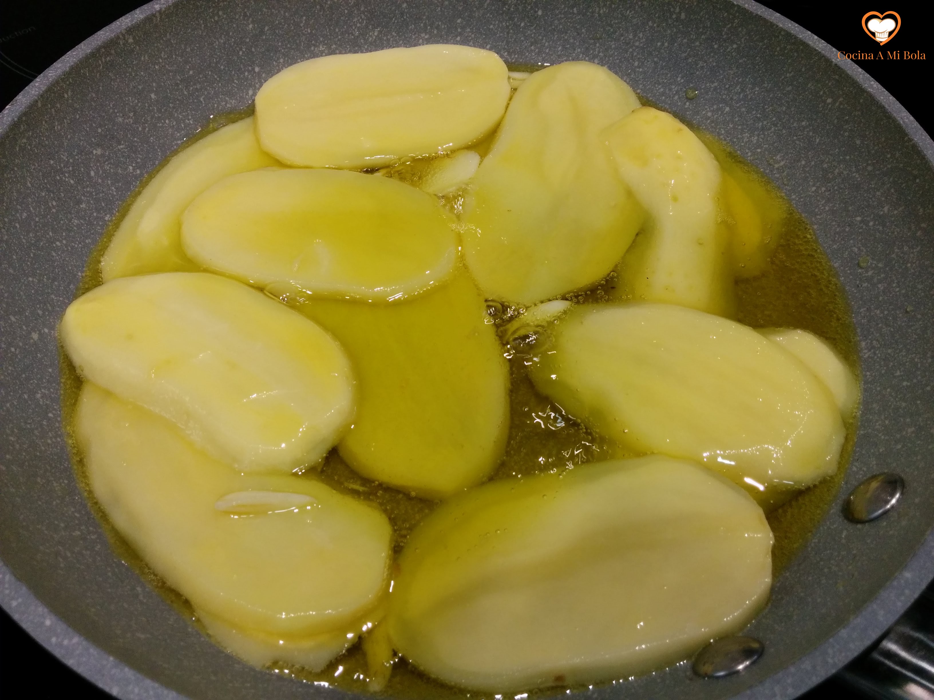 PRIMERO.- En realidad se trata de tres tortillas diferentes con una cobertura de bechamel. Lo primero, pela las patatas y córtalas en rodajas de un grosor más tirando a fino que a muy grueso. Ponlas a freír en aceite de oliva. Ponles una pizca de sal.