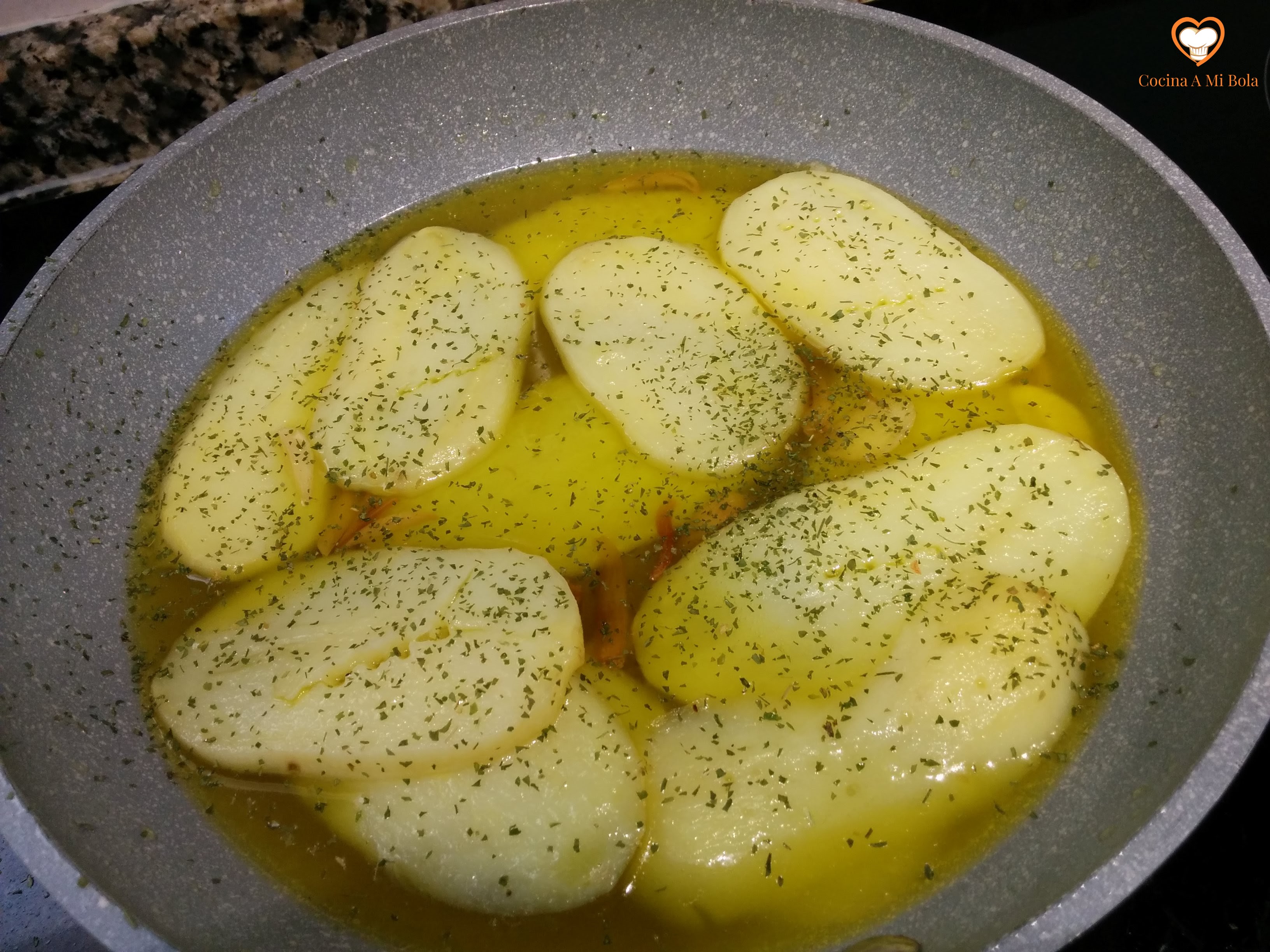 SÉPTIMO.- Haz un alto para hacer la patata de guarnición, ya que tardará un ratillo en hacerse. Pela la patata y córtala en rodajas de un grosor aproximado de 1 cm, y ponlas en una sartén con aceite de oliva a confitar junto con 3 dientes de ajo previamente aplastados con la parte plana de la hoja de un cuchillo. Confitar no es freír, sino cocer lentamente en aceite a baja temperatura hasta que estén tiernas. Y conserva ese aceite con aroma de ajo, porque será genial para otros usos ya que no ha sido sometido a altas temperaturas y aún conservará muchas de sus propiedades, además de su sabor.