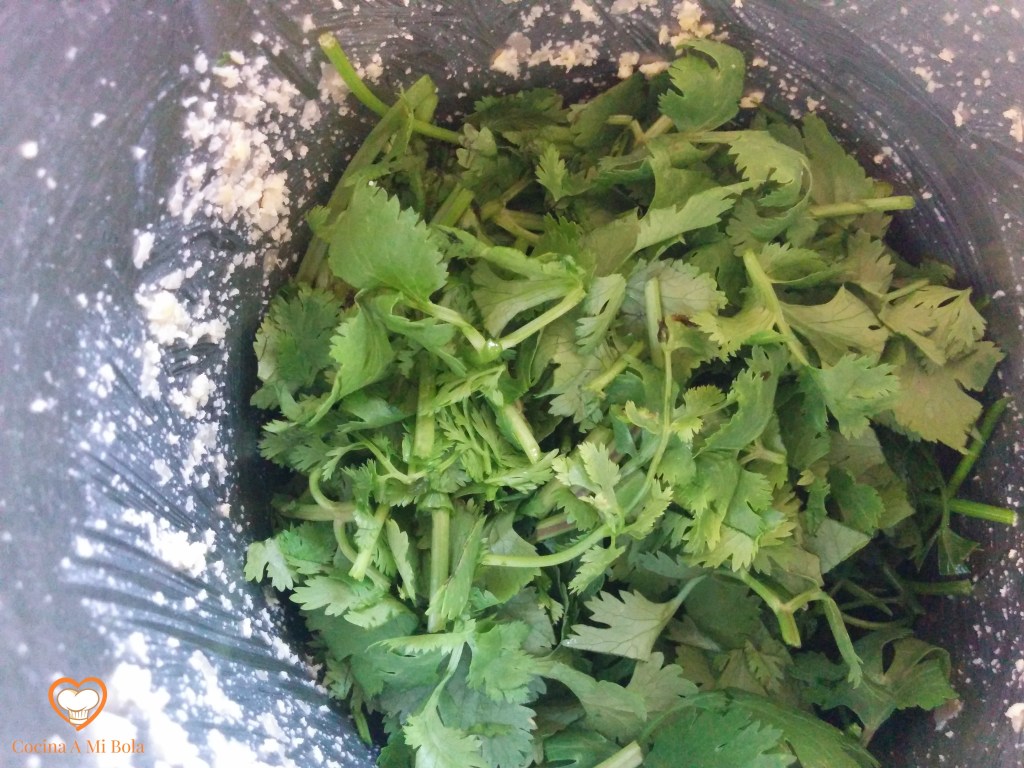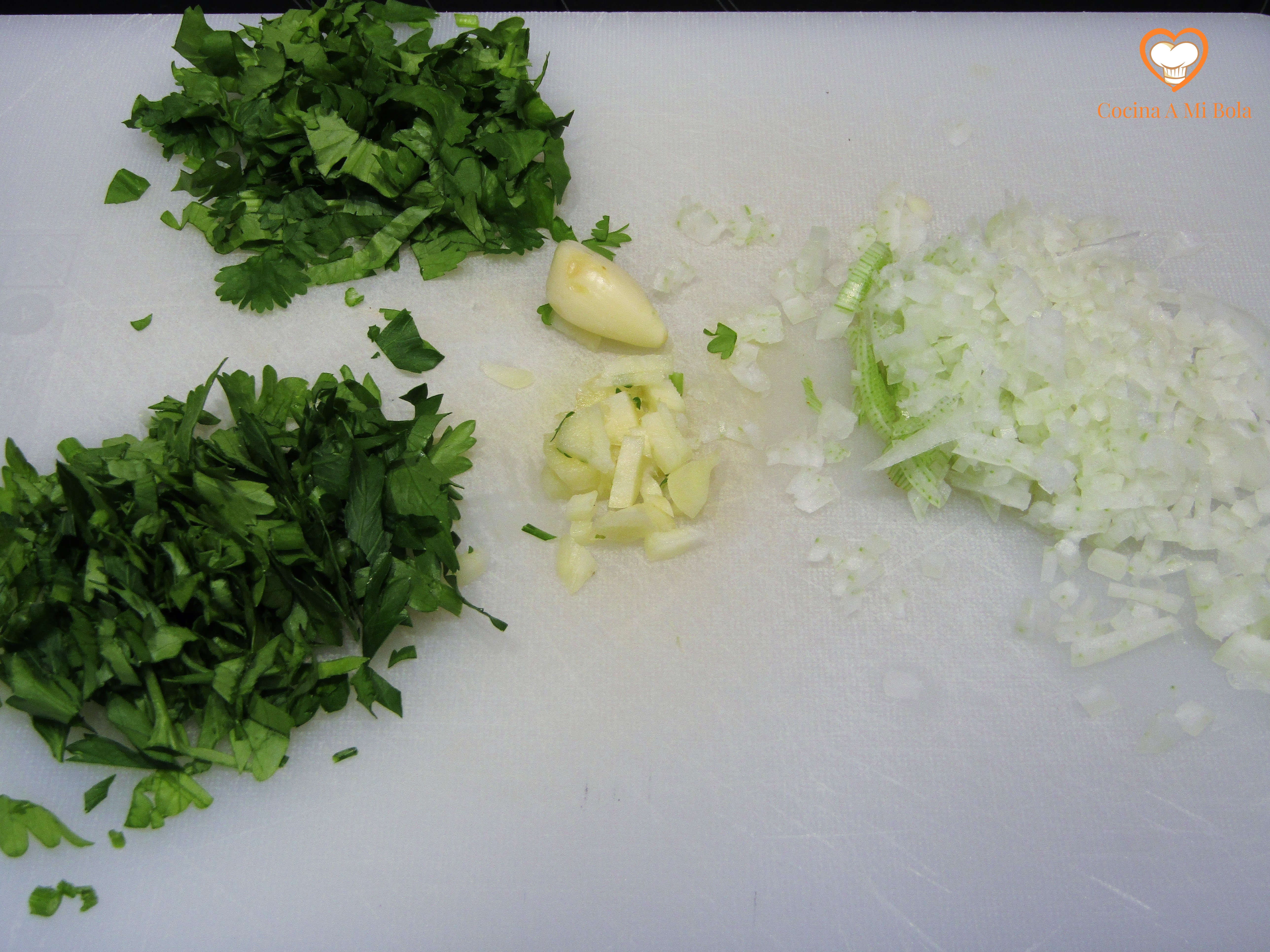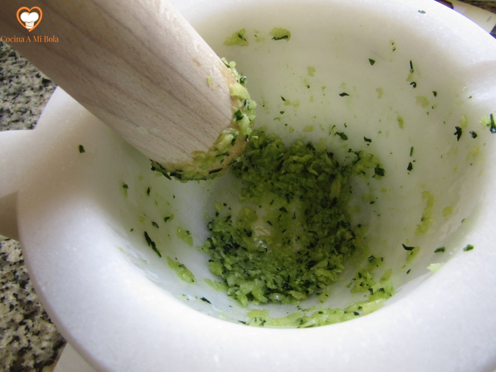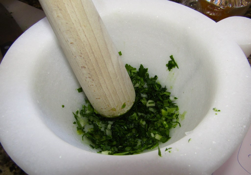 TERCERO.- Pica los ajos, el cilantro y perejil frescos y vuélcalo en el mortero con un pellizco de sal. Májalo con fuerza para que quede lo más fino posible y échalo todo a un bol.