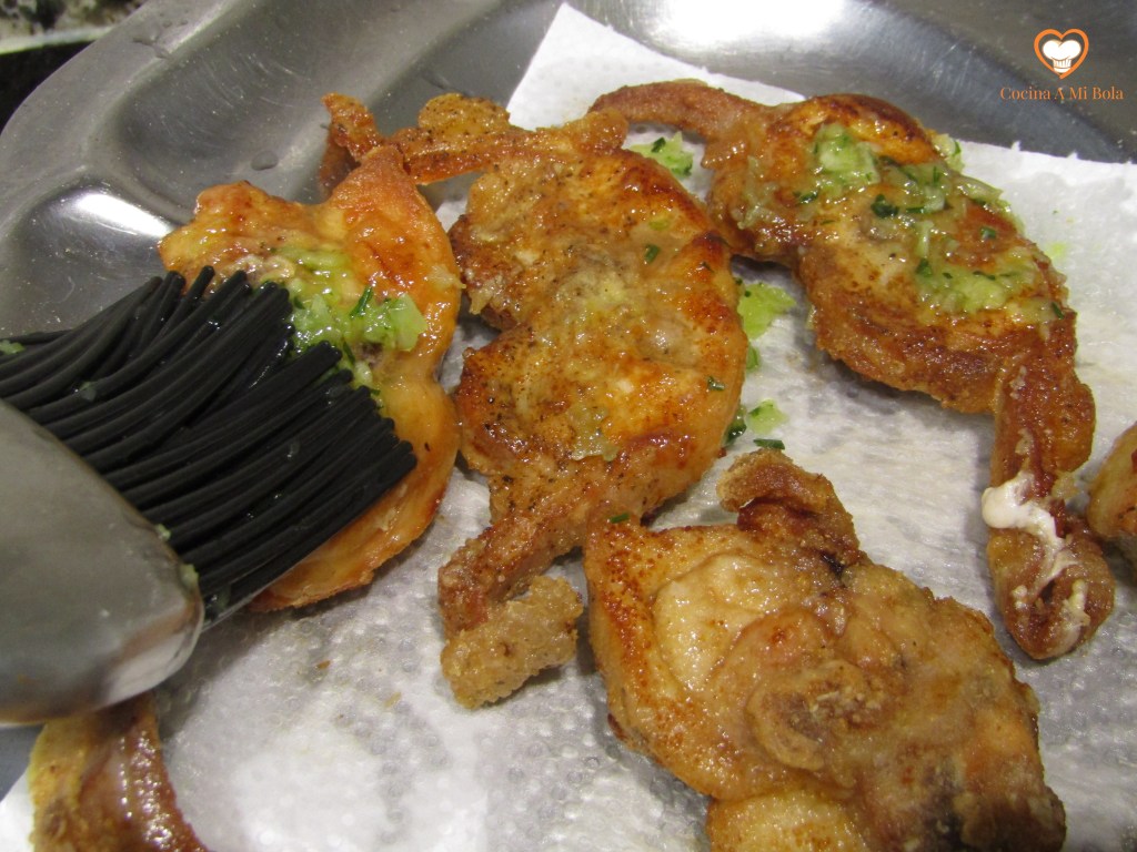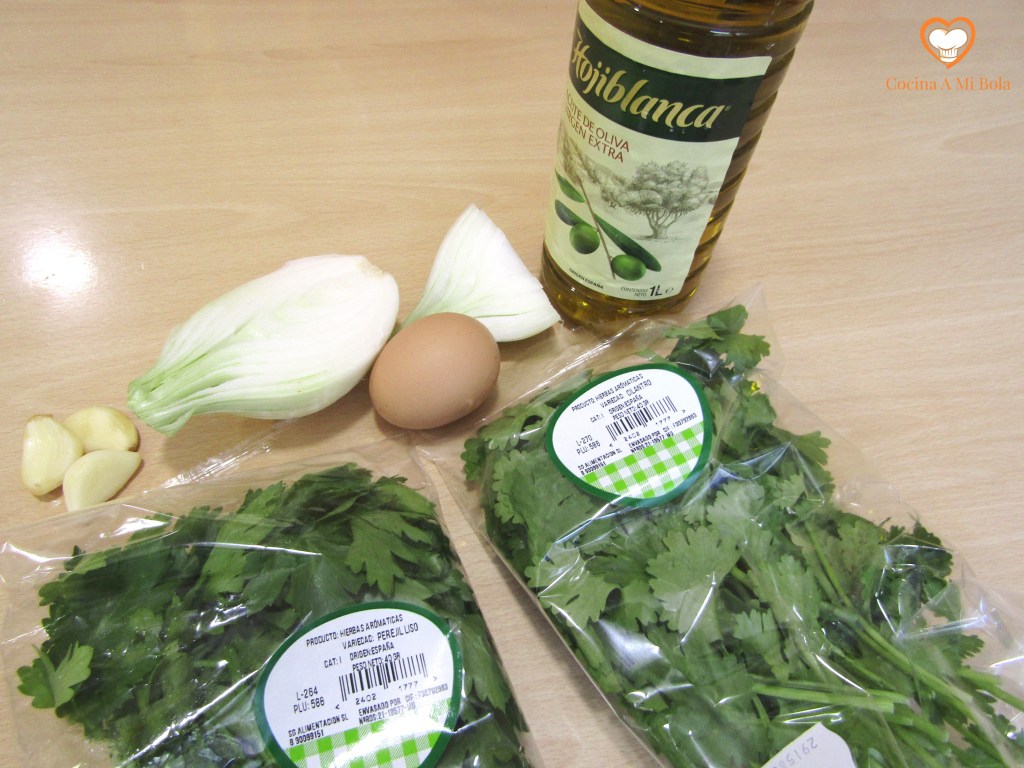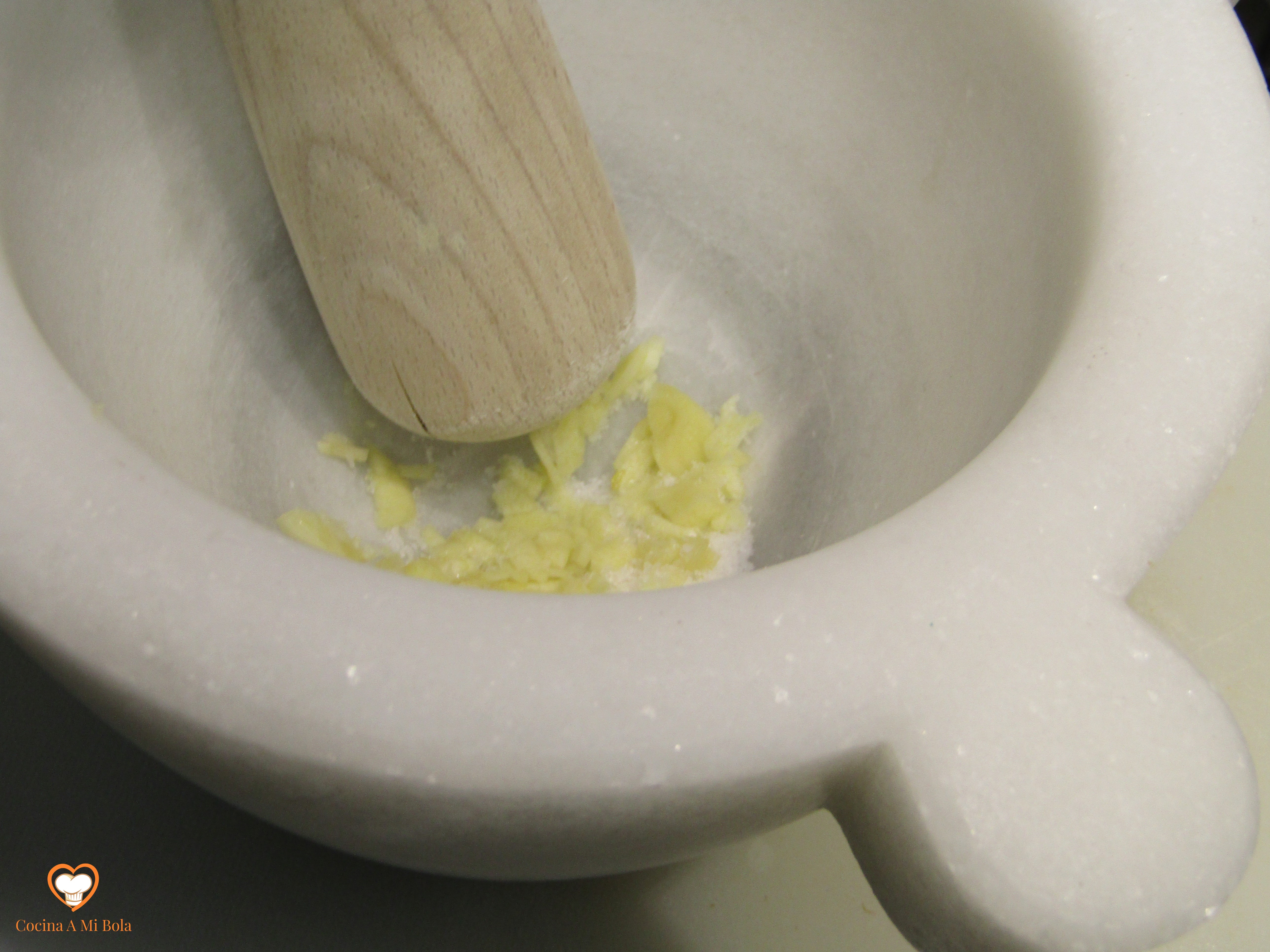 TERCERO.- Pica los ajos, el cilantro y perejil frescos y vuélcalo en el mortero con un pellizco de sal. Májalo con fuerza para que quede lo más fino posible y échalo todo a un bol.