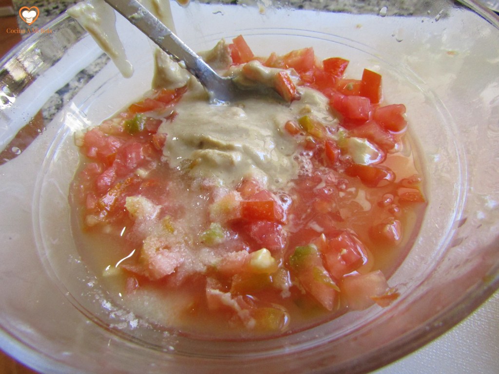 CUARTO.- En el mismo bol ponemos un huevo y lo movemos todo con la varilla o con la misma mano del mortero.