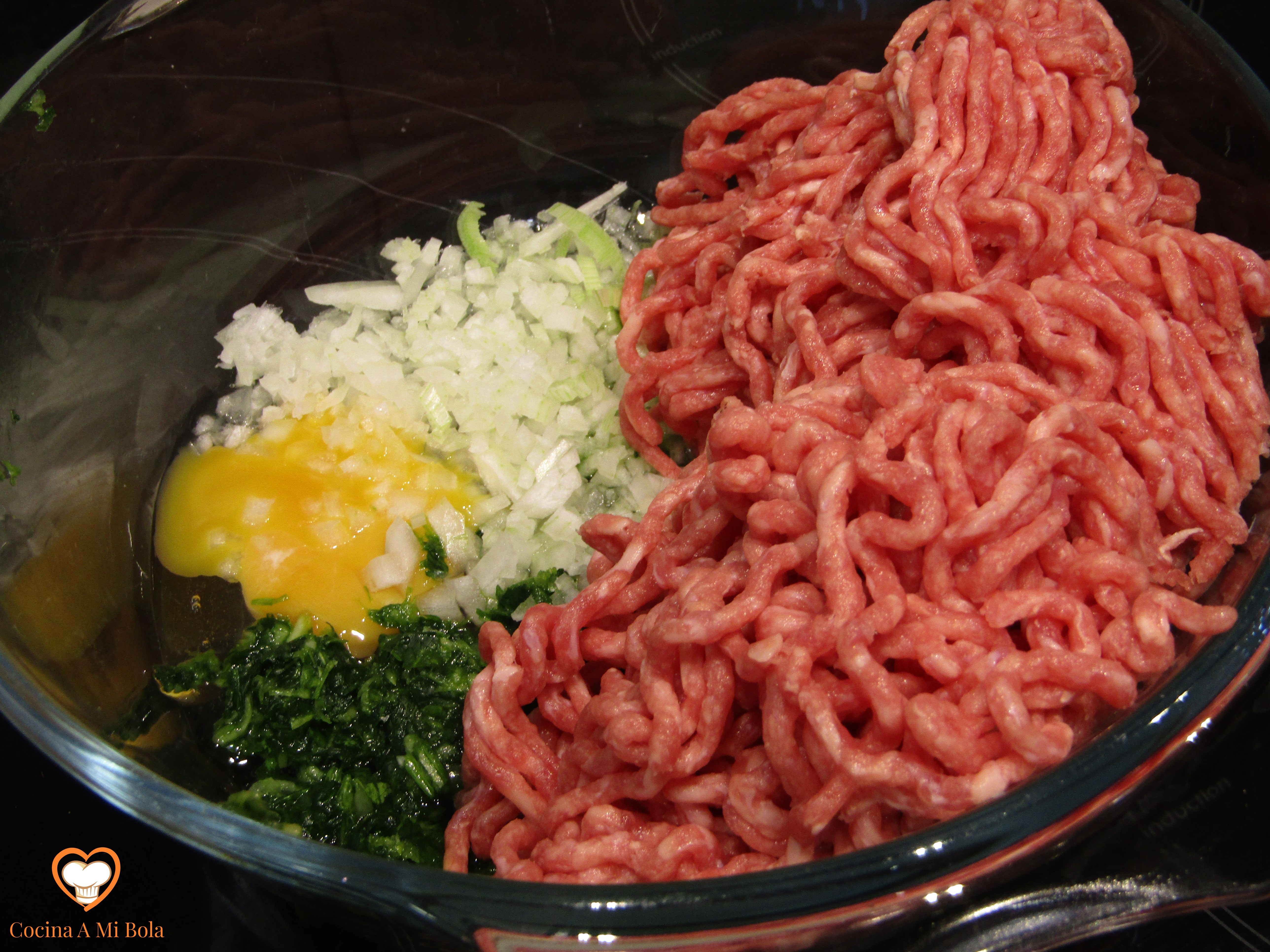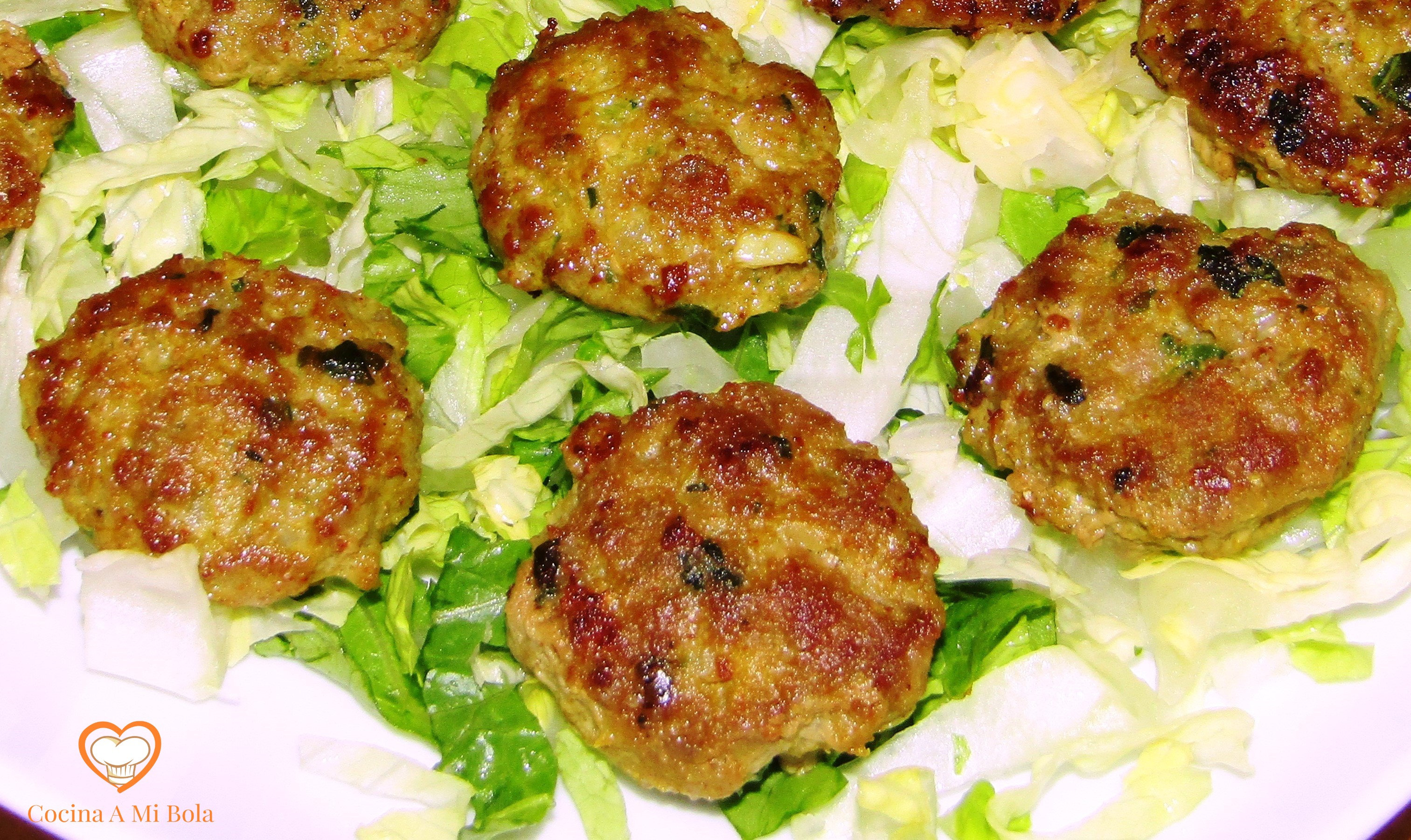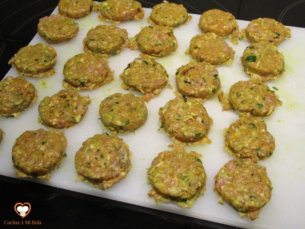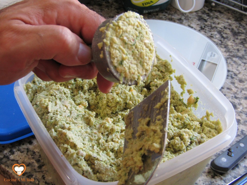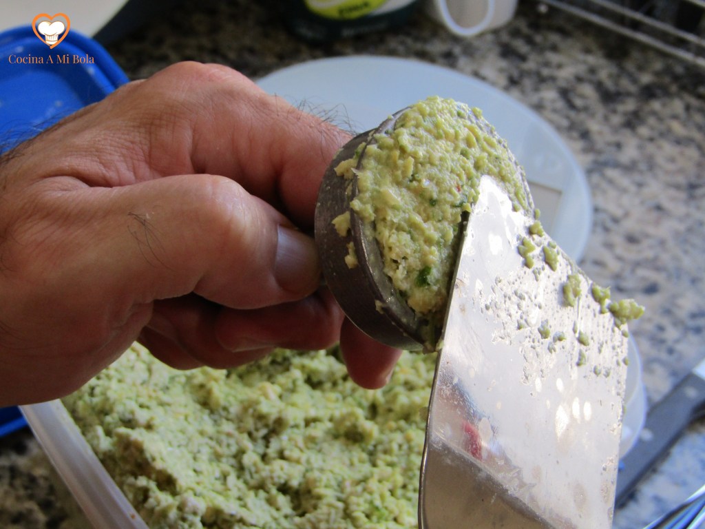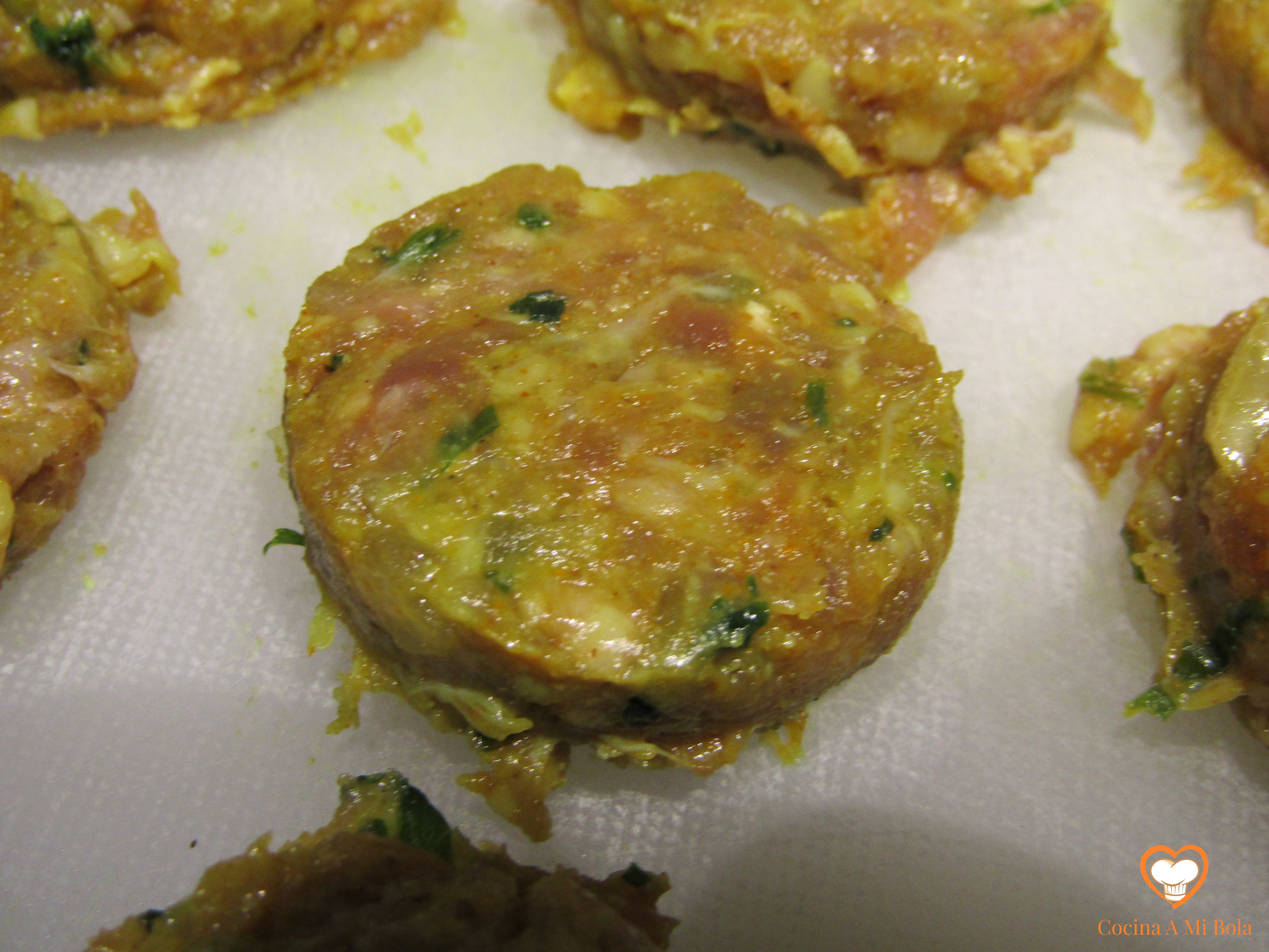 SEPTIMO.- Con la mano ligeramente aceitada, haz pequeñas bolas de carne y aplástalas para darle forma de hamburguesa. Puedes valerte como yo hago del cucharón para hacer falafel, si lo tienes; y si no, pues a mano como toda la vida.
