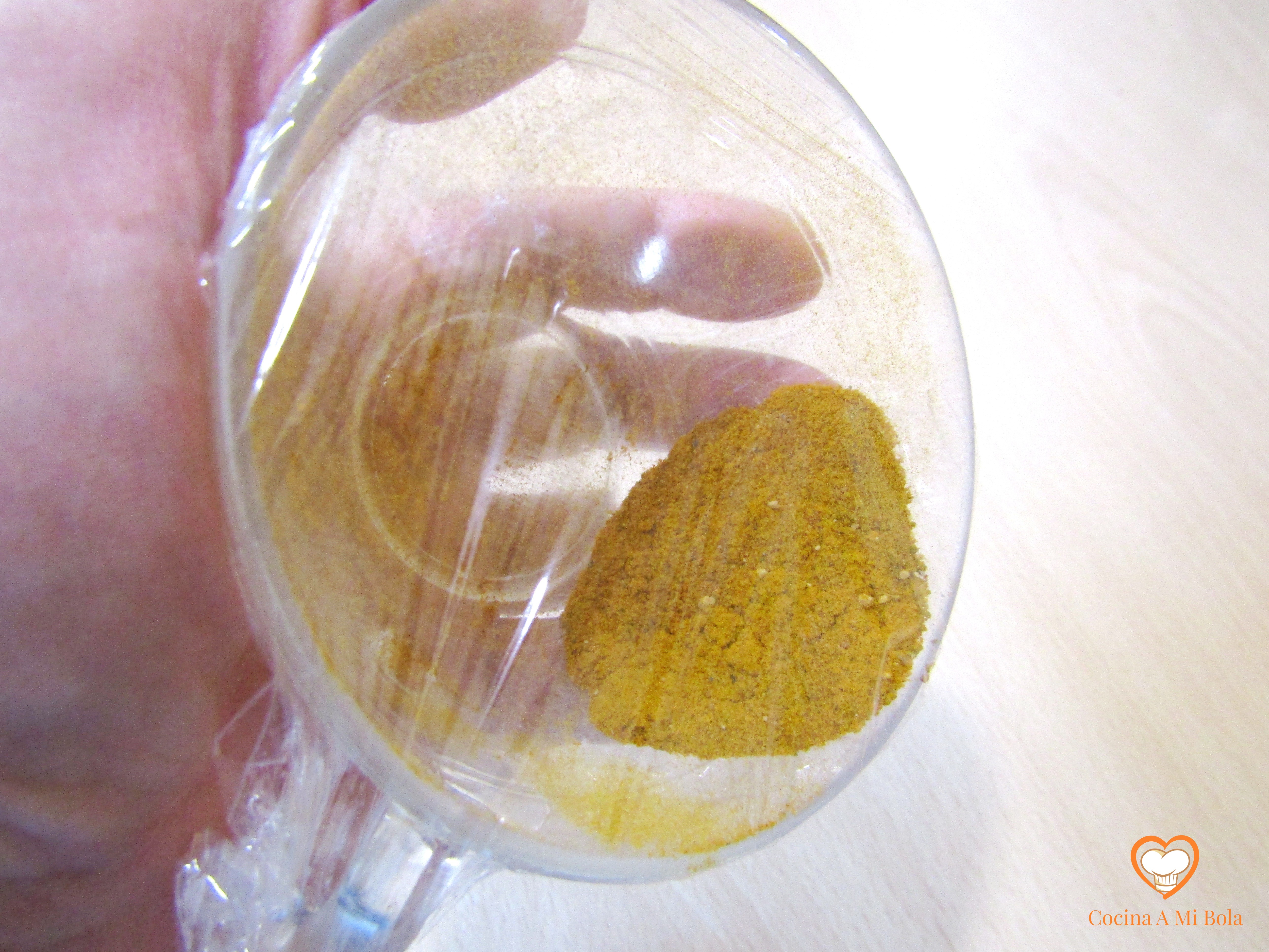 PRIMERO.- Para hacer el Ras el Hanout yo echo cúrcuma y comino molido en una taza como base principal de la mezcla. Digamos que una cucharada de postre de la primera y un 75% de la cantidad de cúrcuma, para la segunda. Y sobre esta base, añado pizcas de pimentón dulce, pimentón picante (no te pases), jengibre, pimienta negra molida, nuez moscada y canela. Cubre la taza con film de cocina para que quede bien cerrado y agítalo para que se mezcle todo bien. Insisto en esto porque aunque no lo parezca, se apelmazan los polvos y no terminan de mezclarse. Déjalo tapado y reserva.