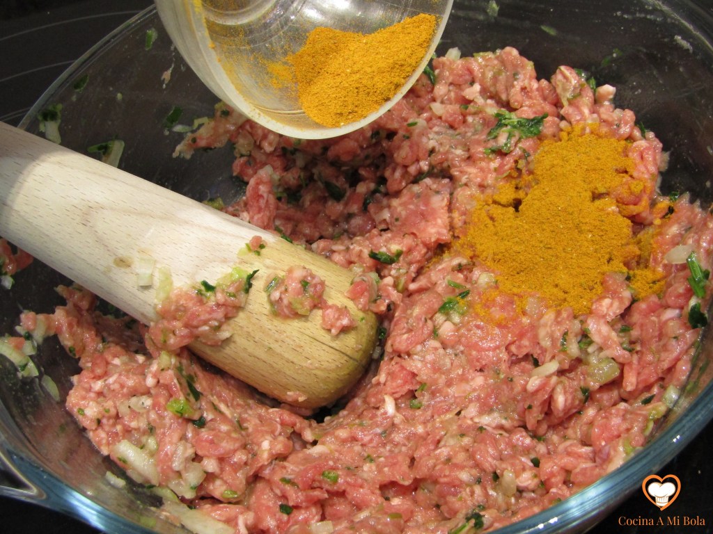 INGREDIENTES:(Para 2/3 personas) ½ kg carne picada de ternera, ½ cebolleta, 2 dientes de ajo, cilantro fresco, perejil fresco, 1 huevo, 2 cucharaditas de Ras el Hanout, aceite de oliva virgen extra y sal. (Para el Ras el Hanout: cúrcuma, jengibre, pimentón dulce y picante, comino molido, pimienta negra molida, nuez moscada y canela molida.)