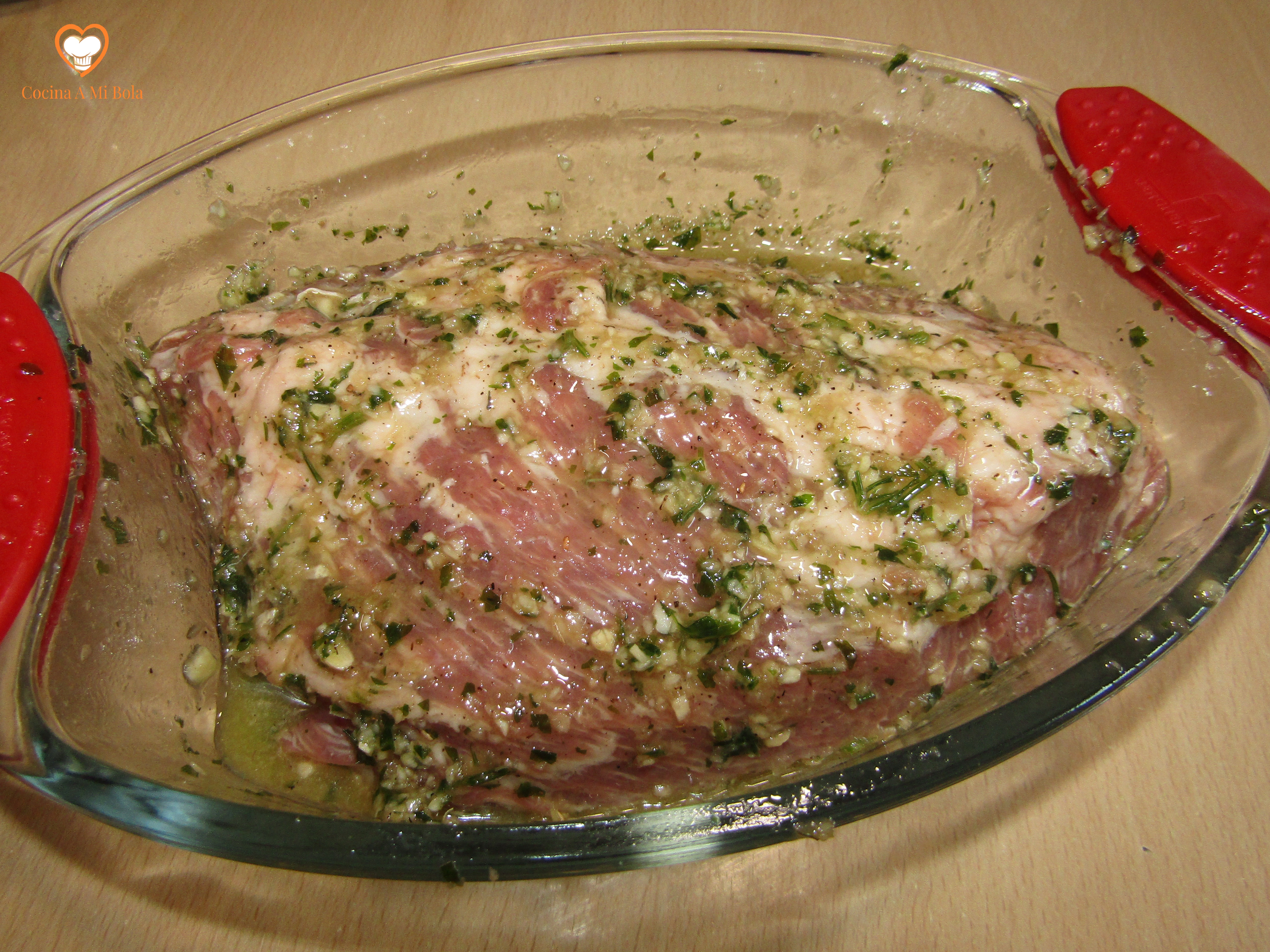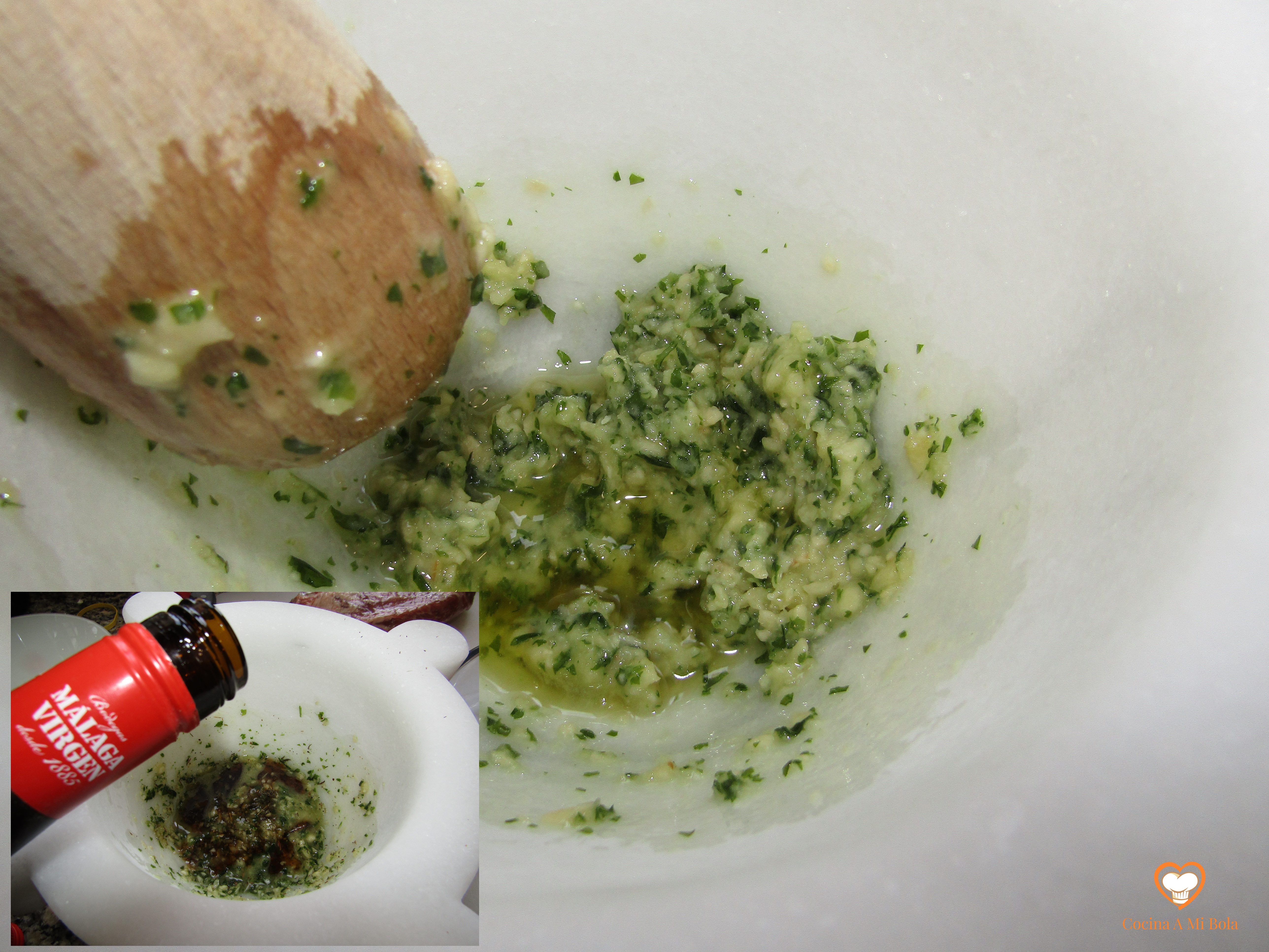 SEGUNDO.- Durante ese tiempo de “espera” haz el aliño picando primero el ajo y el perejil en una picadora para que quede fino y, a continuación, pásalo todo al mortero y machaca bien para que se haga casi una pasta. Echa unas tres cucharadas de aceite de oliva y mezcla con la mano del mortero. Añade un poco de pimienta negra (recién molida, a poder ser) y una cucharadita de Málaga Virgen. Extiéndelo sobre la carne a mano, procurando que quede la pieza entera bien impregnada del aliño y déjalo así el tiempo que te reste de ese par de horas que dijimos antes.
