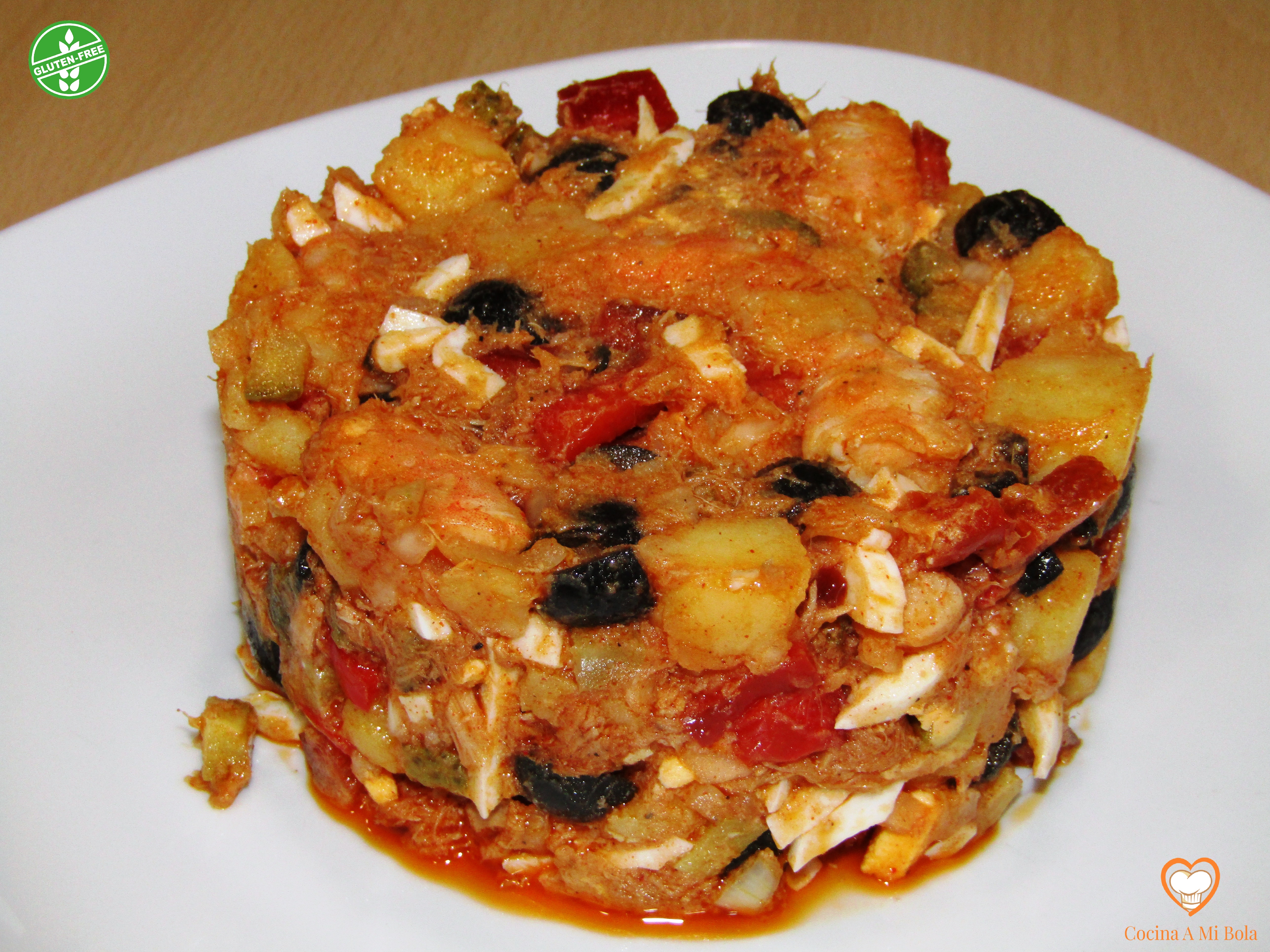 El hecho de moverlo todo tantas veces es para que se mezclen bien los sabores y para que la patata se impregne de todos ellos, al tiempo que las partes de ella que se hayan deshecho, sirvan de aglutinante. Ya está lista. Enfríala bien y a la mesa. Receta apta para celiacos por no contener