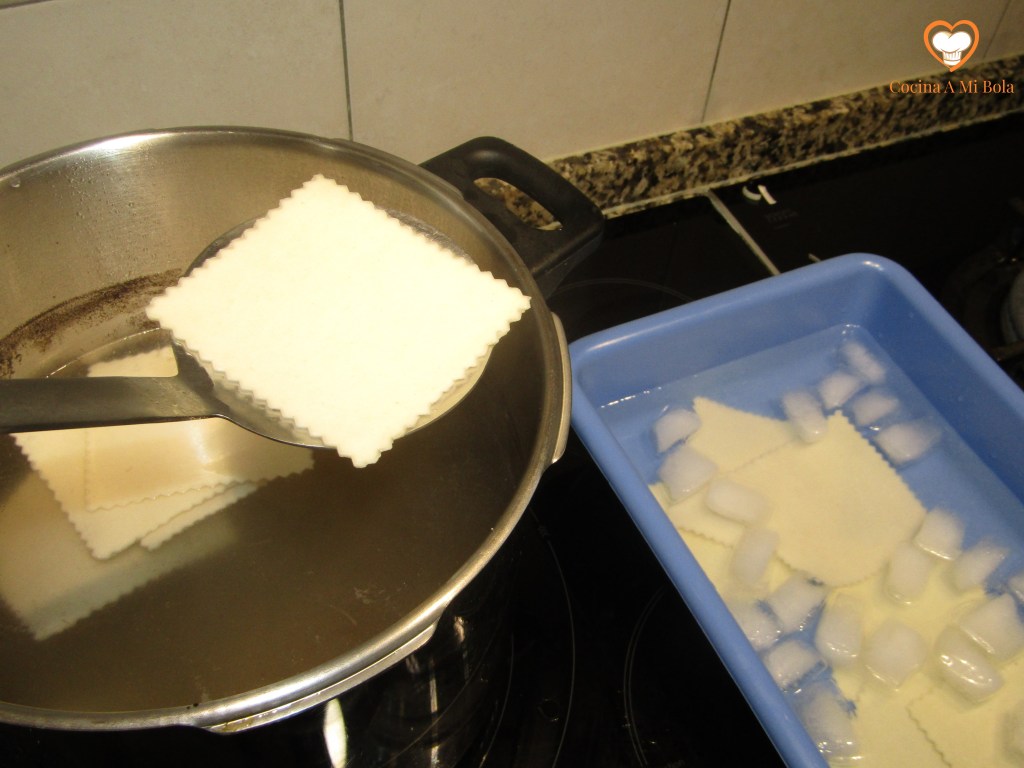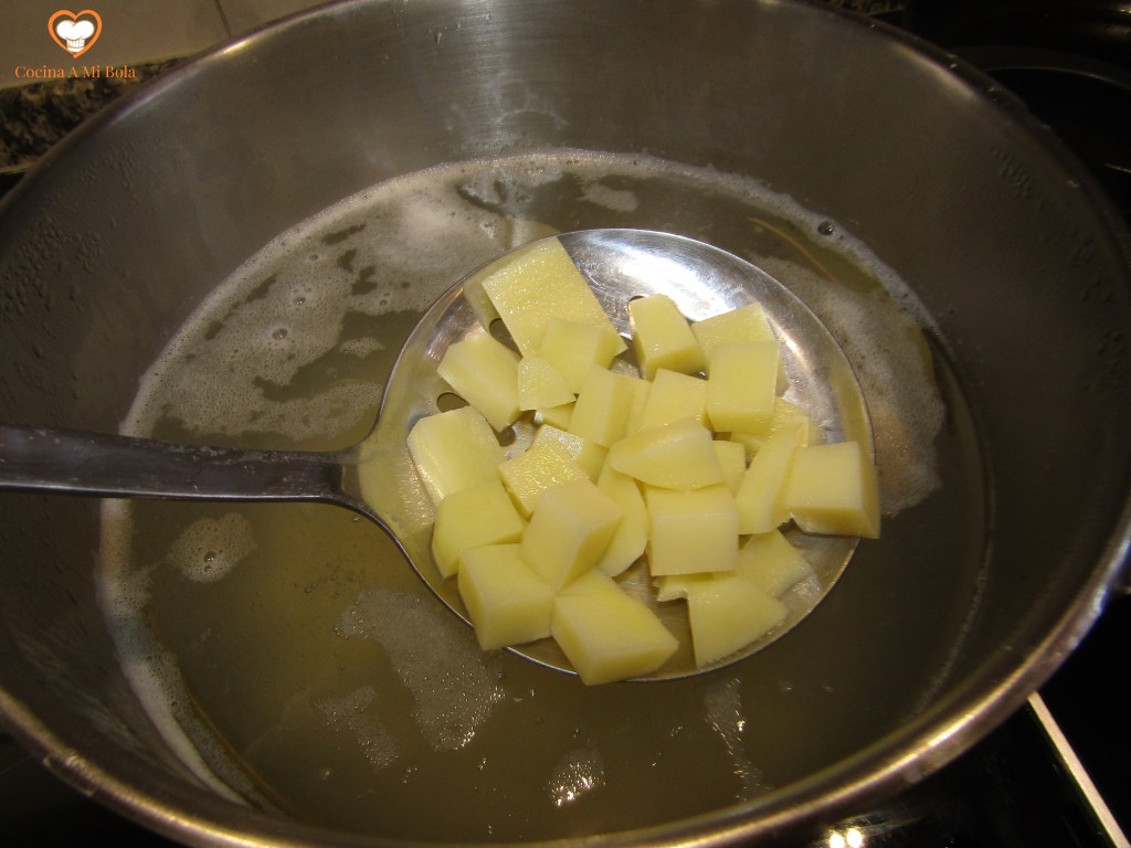 PRIMERO.- Pela la patata y córtala en cuadradillos pequeños. Pon agua a calentar con sal y el laurel. Cuando rompa a hervir, mantenlo así un par de minutos para que el laurel infusione y echa luego la patata. Verás que tomará un aroma e incluso sabor añadidos muy agradables. Cuando esté la patata blanda sácala para que no se deshaga demasiado, y si te has pasado un poco, enfríala en agua con hielo para cortar la cocción. Reserva y deja que temple.