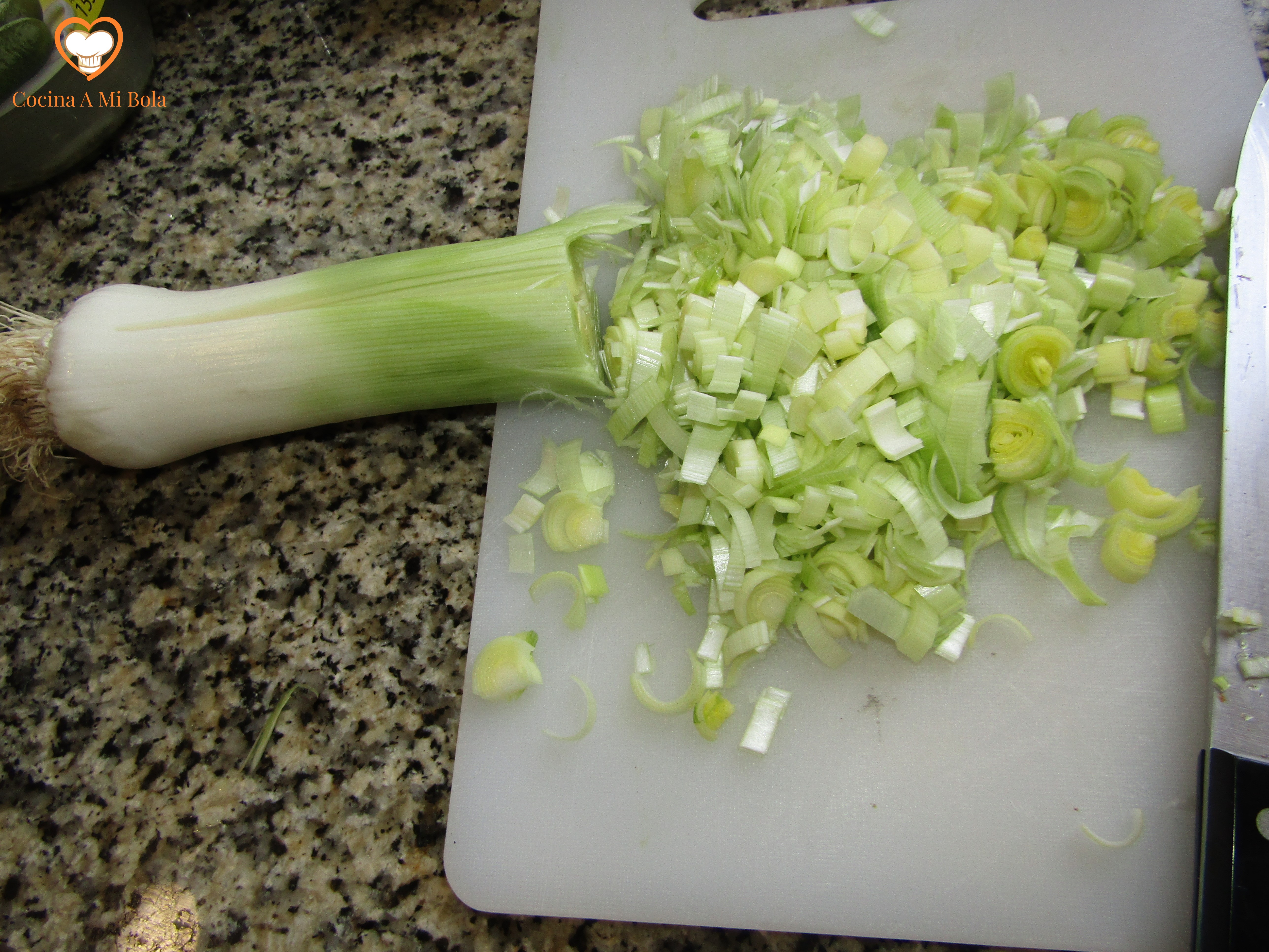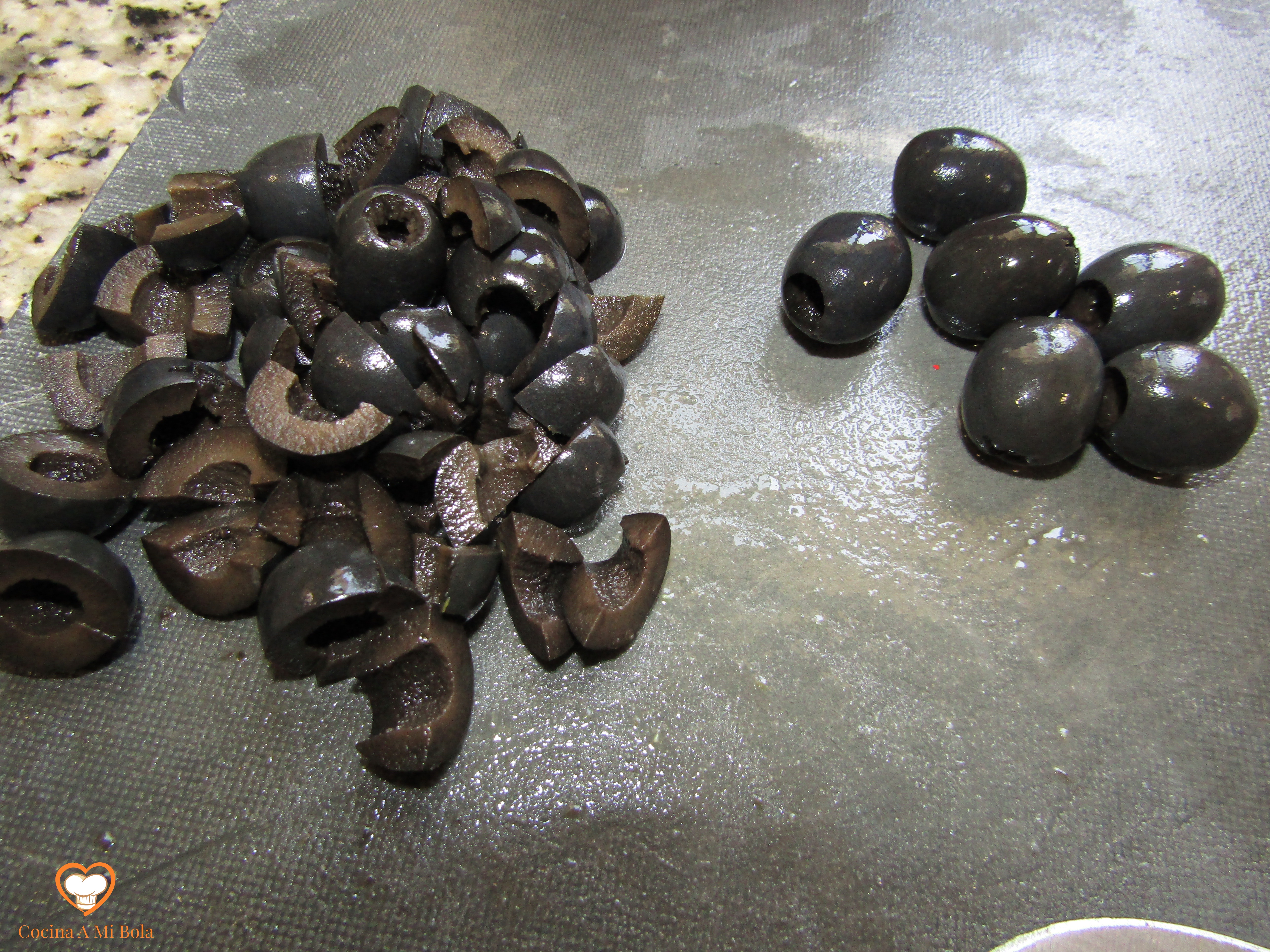 TERCERO.- Pica muy fino la media cebolla y el pimiento algo más grueso. Las aceitunas las cortas en cuatro y el pepinillo en trocitos como la cebolla más o menos. Reserva.