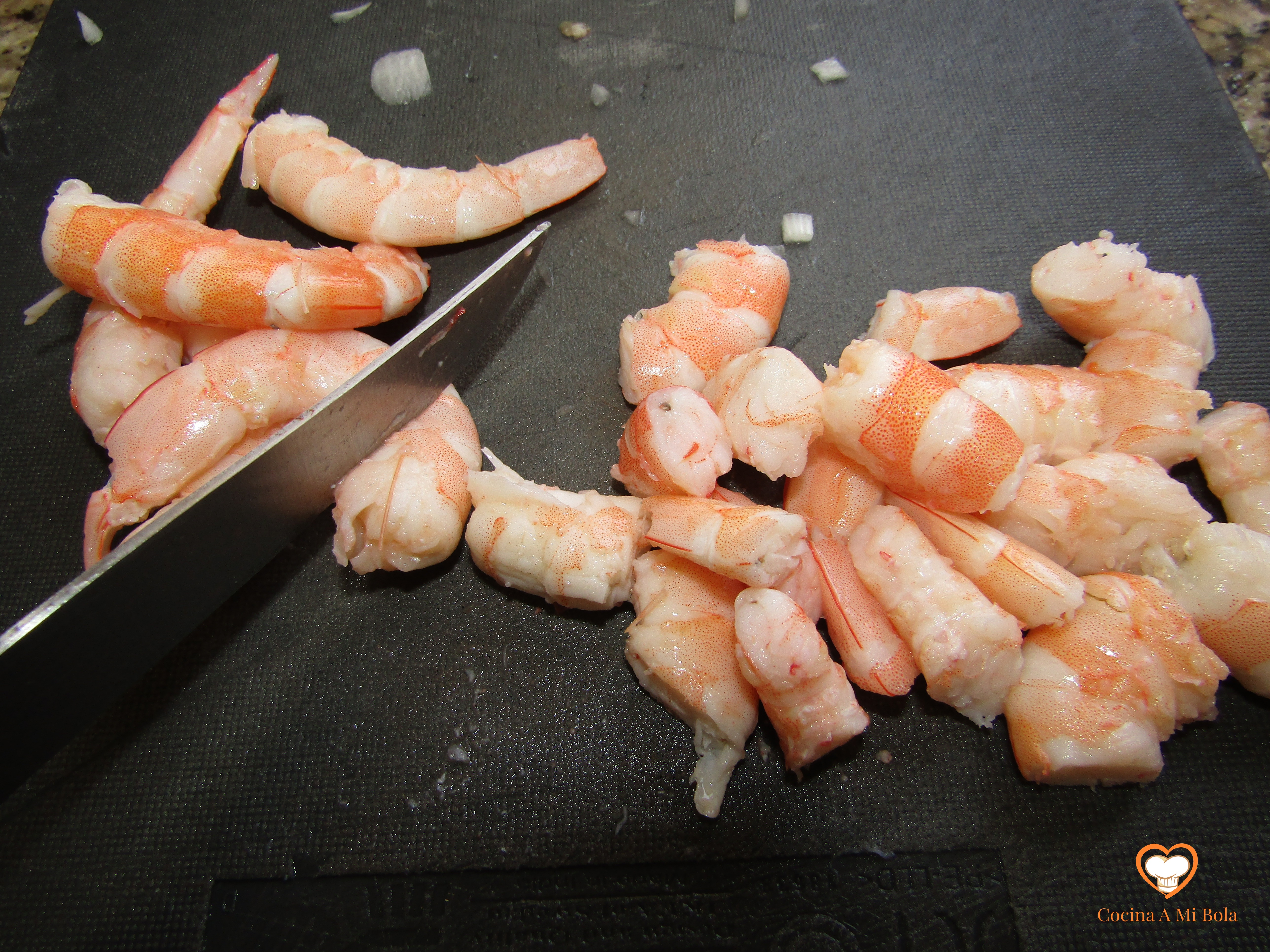 QUINTO.- Pela los langostinos y córtalos en tres. Pica el huevo duro en trocitos pequeños.