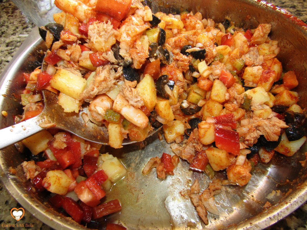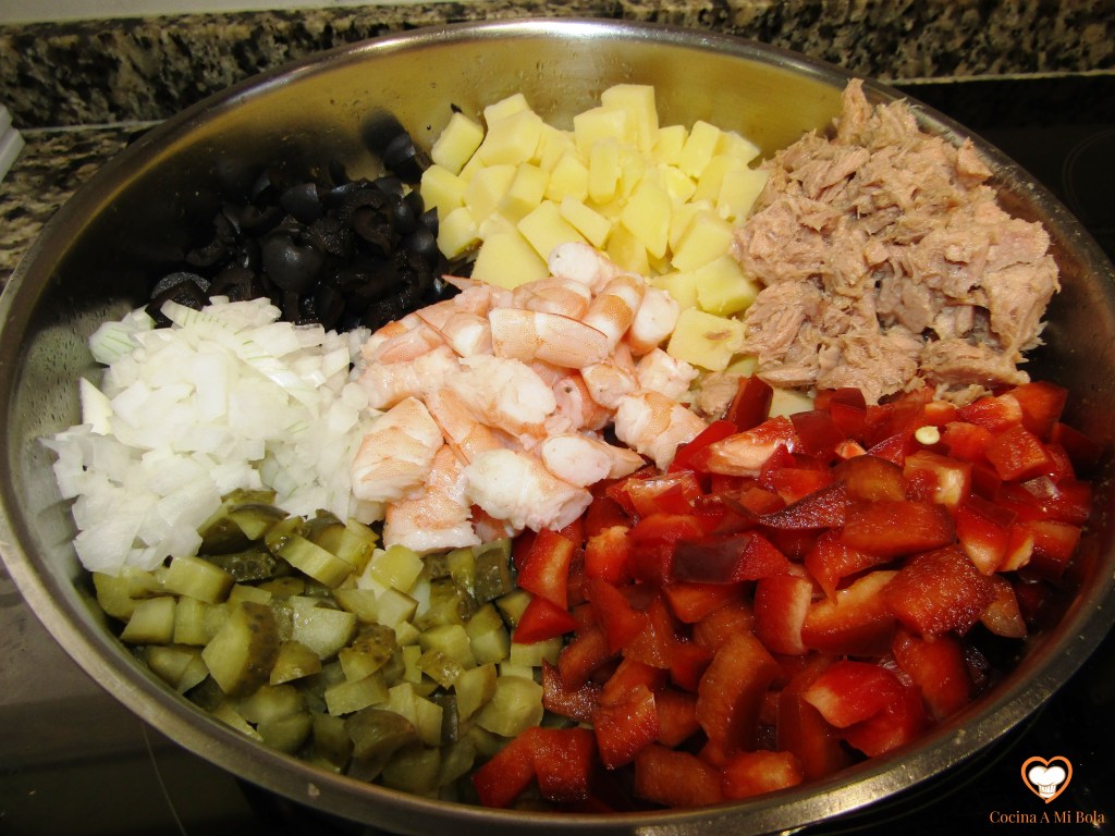 SEXTO.- Vuelca todo en un bol, y mezcla bien con un par de cucharas o incluso a mano. Salpimenta teniendo en cuenta que las aceitunas, los pepinillos, y el atún ya vienen salados. Mezcla bien con cuidado para no romper mucho la patata.