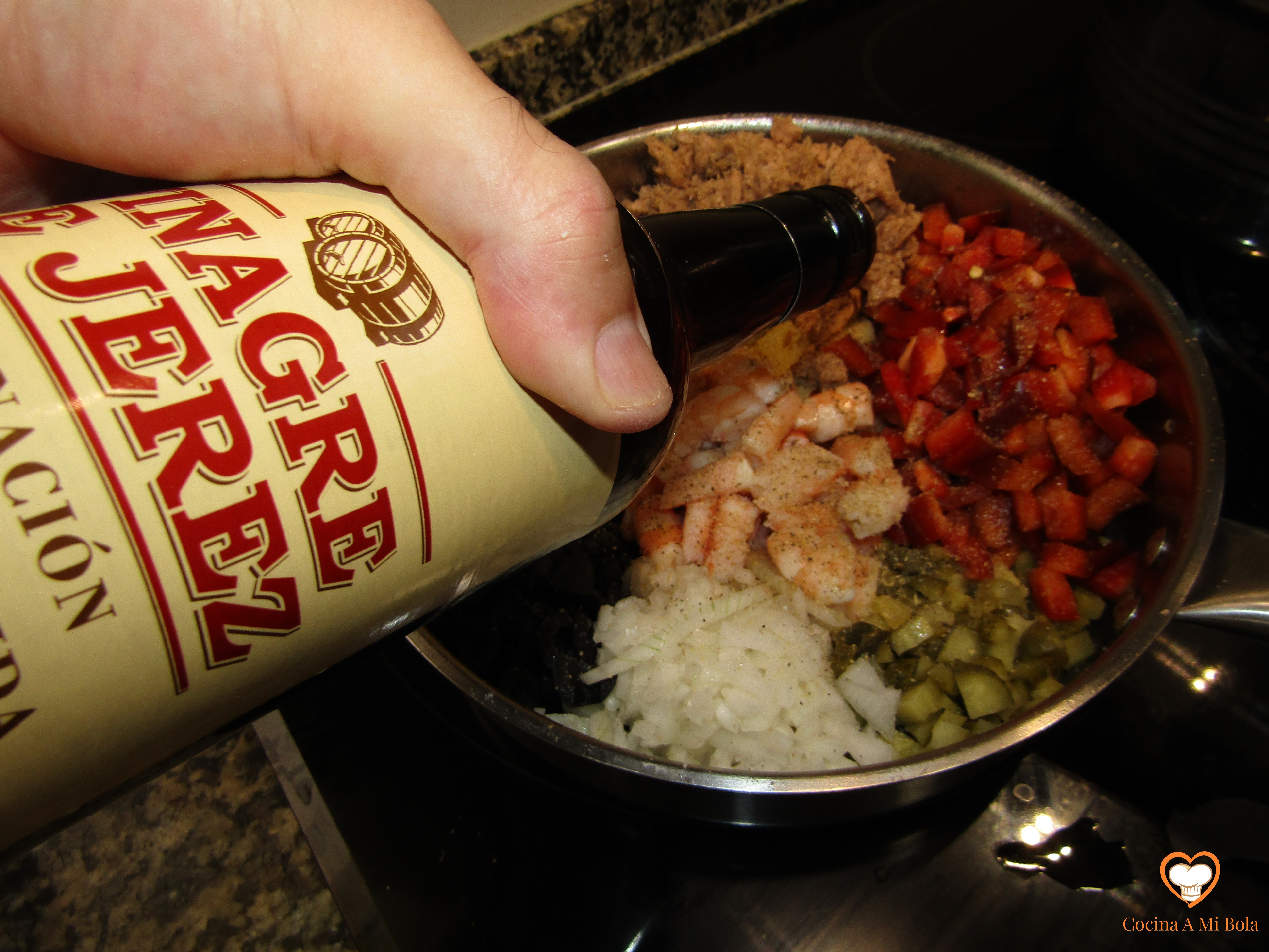 SEPTIMO.- Riégalo con vinagre al gusto (de Jerez, a ser posible) y aceite de oliva virgen extra en una cantidad moderada. Lo justo para que se impregne todo pero no demasiado. Ten en cuenta que la patata va a absorber en gran cantidad y puede resultar excesivo. Mezcla bien.
