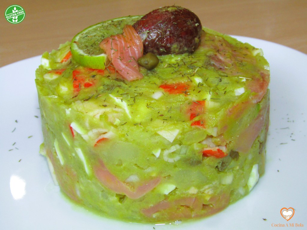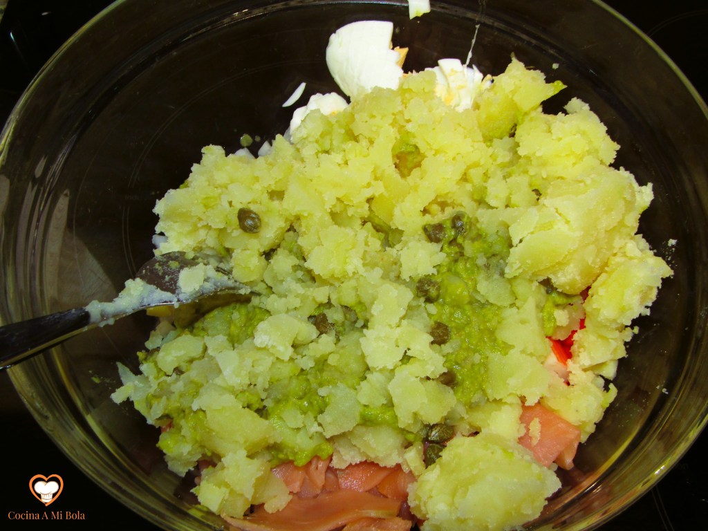 PREVIO.- Yo siempre he procurado cocinar lo más sano posible, eliminando grasas prescindibles de los platos. Pero en estos últimos tiempos, entre los médicos que me presionan y tantos amigos que se han convertido en una mezcla no muy proporcionada de ortoréxicos y vigoréxicos, empiezo a plantearme dar un paso más e inventar recetas más hipocalóricas. No obstante lo anterior, me niego a hacer una cocina insípida… así que este es un ejemplo de lo que digo. Esta ensaladilla tiene patata, pero sólo cocida; tiene aguacate; ttiene salmón, con su grasa, pero ni una sola gota de aceite… Además, es apta para