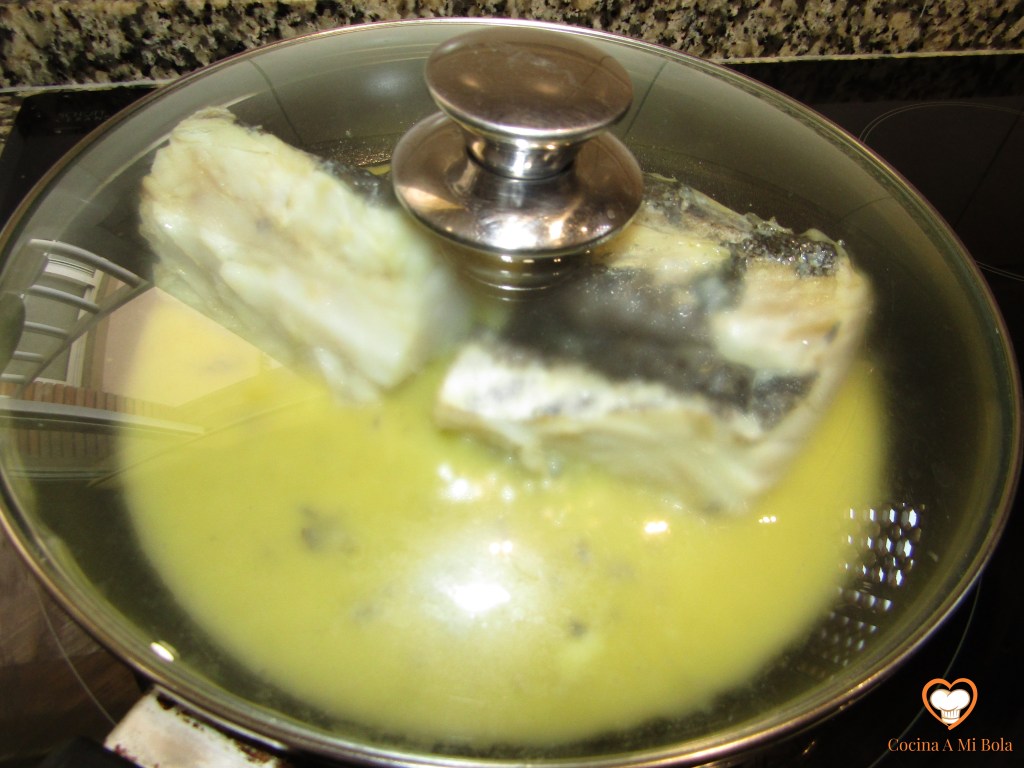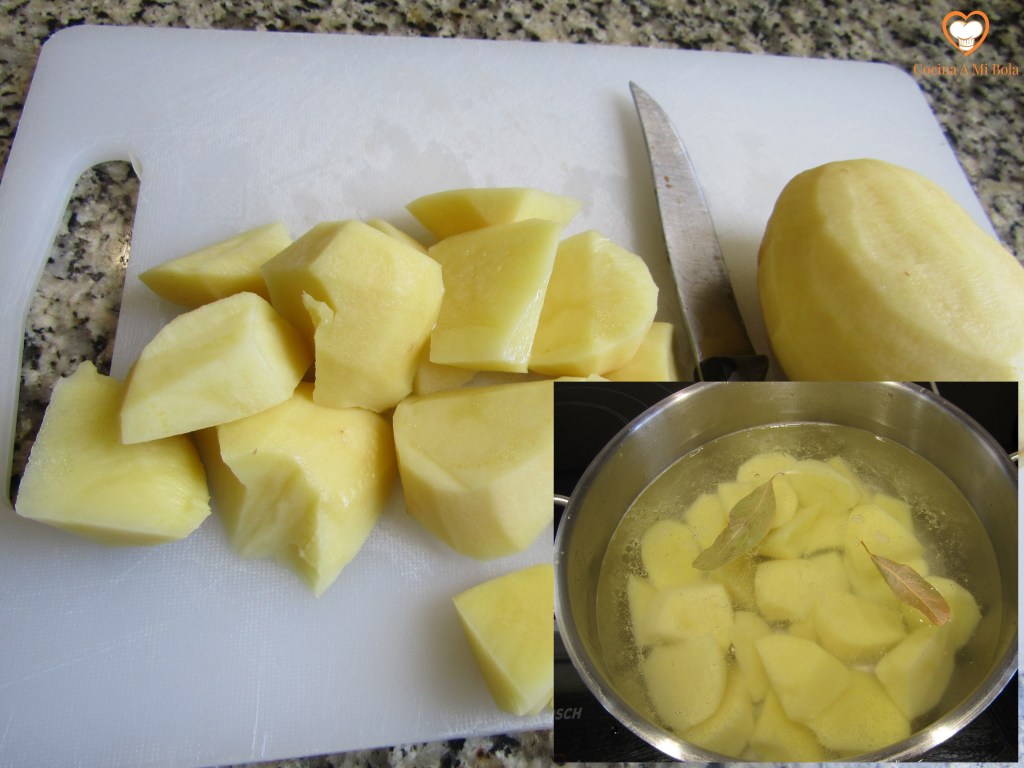 SEGUNDO.- Pela las patatas, trocéalas y ponlas a cocer en agua con un poco de sal y laurel. Busca un punto de cocción tal que nos permita aplastar la patata con un tenedor sin esfuerzo. Es fácil porque lo hacemos a olla abierta, así que pincha la patata de vez en cuando y cuando la atravieses con un tenedor sin resistencia, estará hecha. Retira la cazuela y ponla bajo el grifo de agua fría. Reserva mientras se templa. Cuece 2 huevos durante diez minutos y enfríalos también.