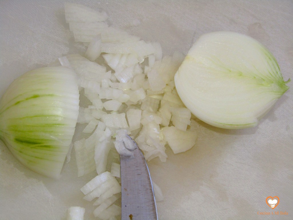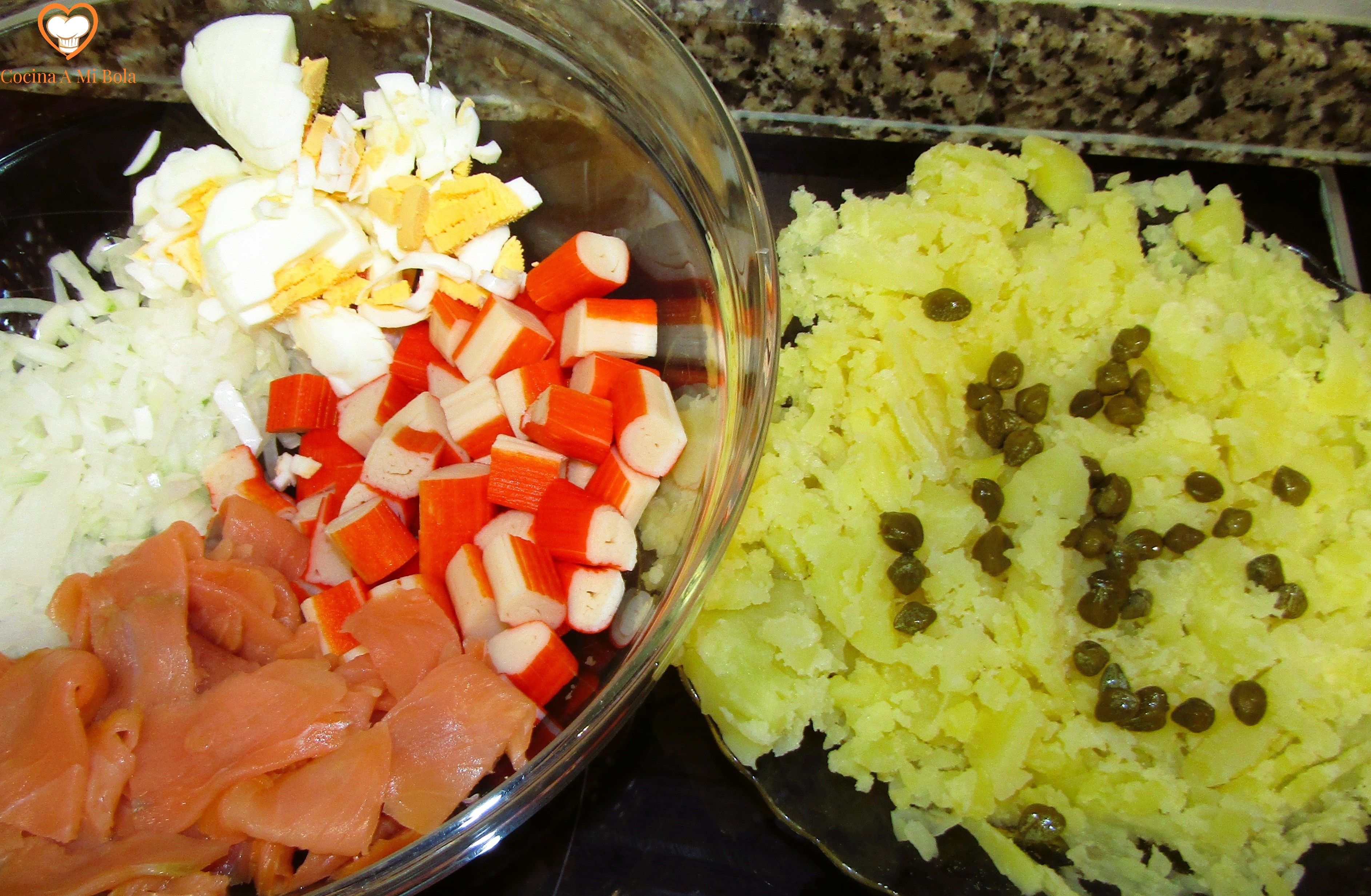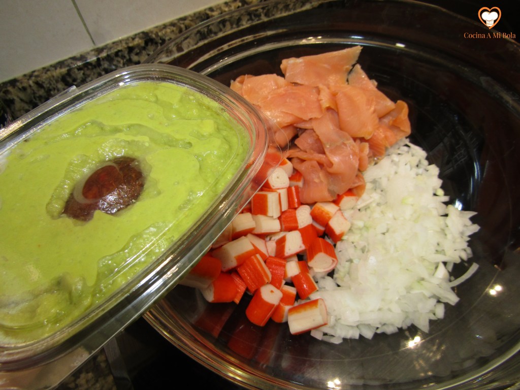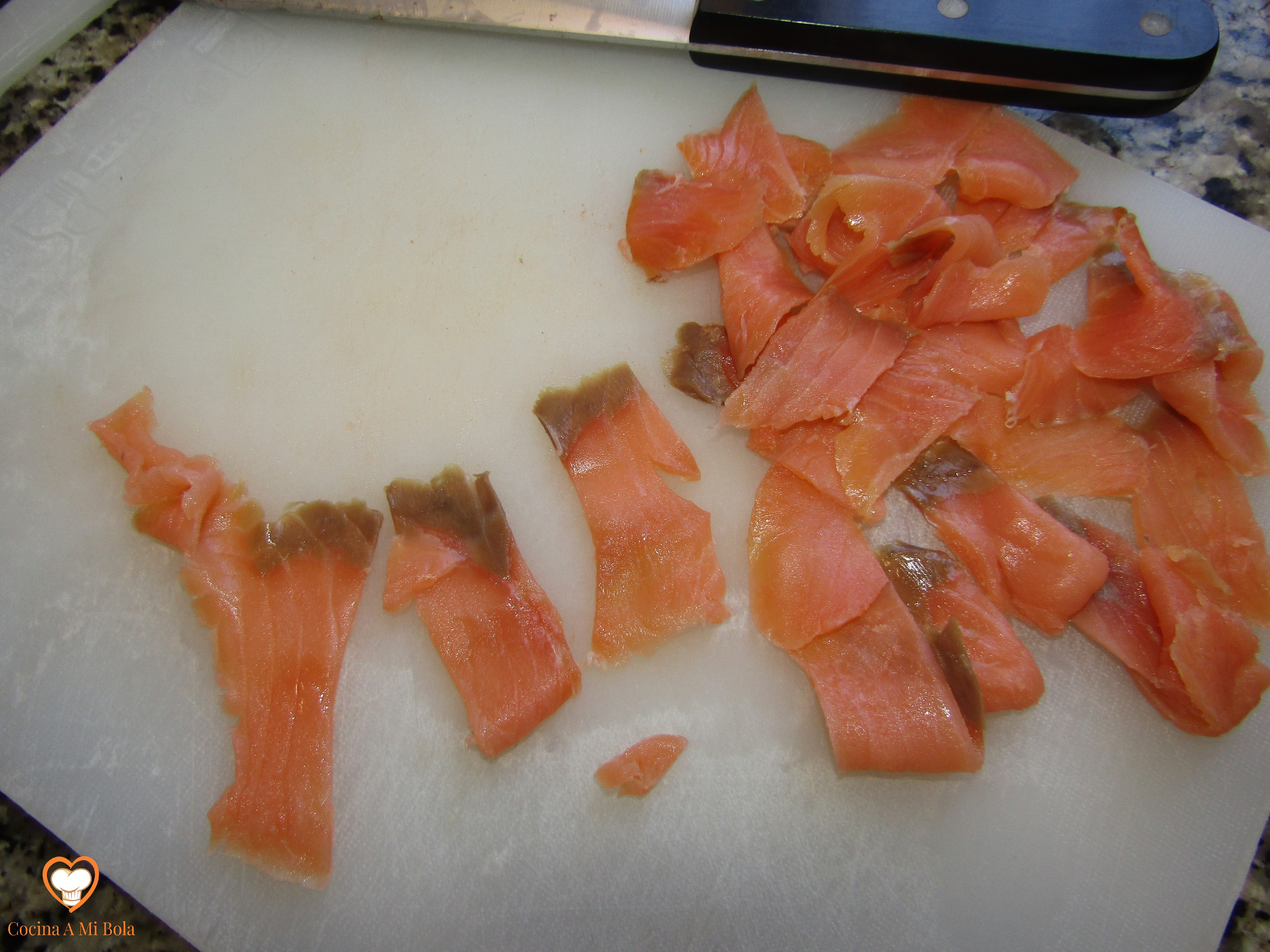 TERCERO.- Pica muy fino la cebolla; trocea el surimi más bien grueso para que sea perceptible; los pepinillos en trocitos algo más pequeños y las lonchas de salmón en piezas de unos 2×2 cm. No dejes el salmón muy pequeño porque es importante “encontrártelo” y percibir su sabor.