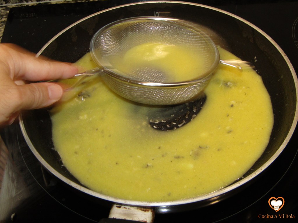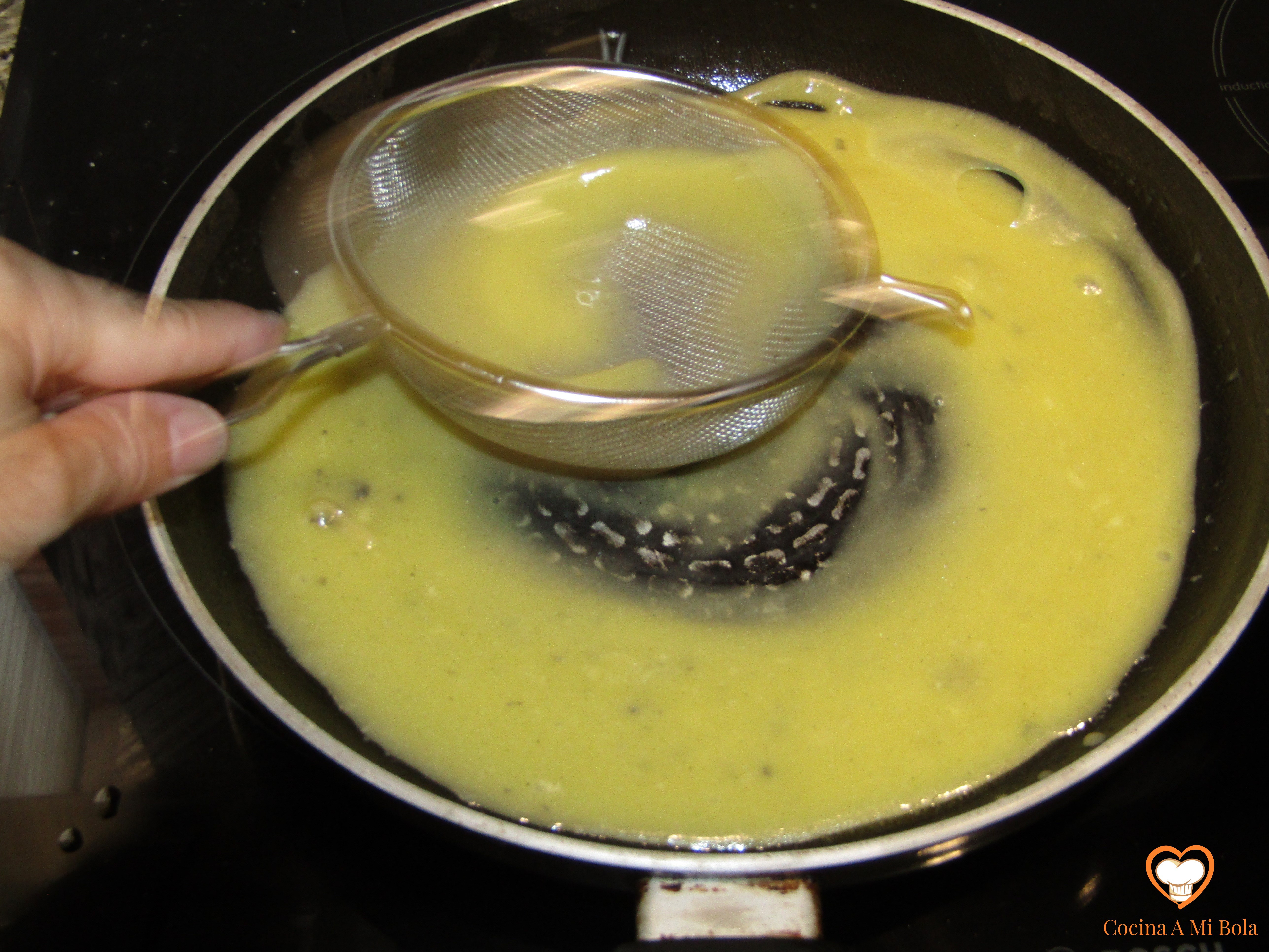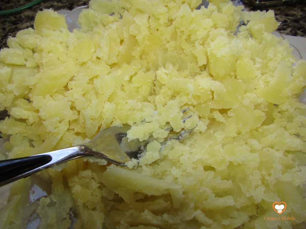 CUARTO.- Una vez haya templado la patata, aplástala con un tenedor pero de un modo grueso; que no te importe que queden trocitos porque es esa la textura que buscamos, y no la de un puré. Mira la foto.