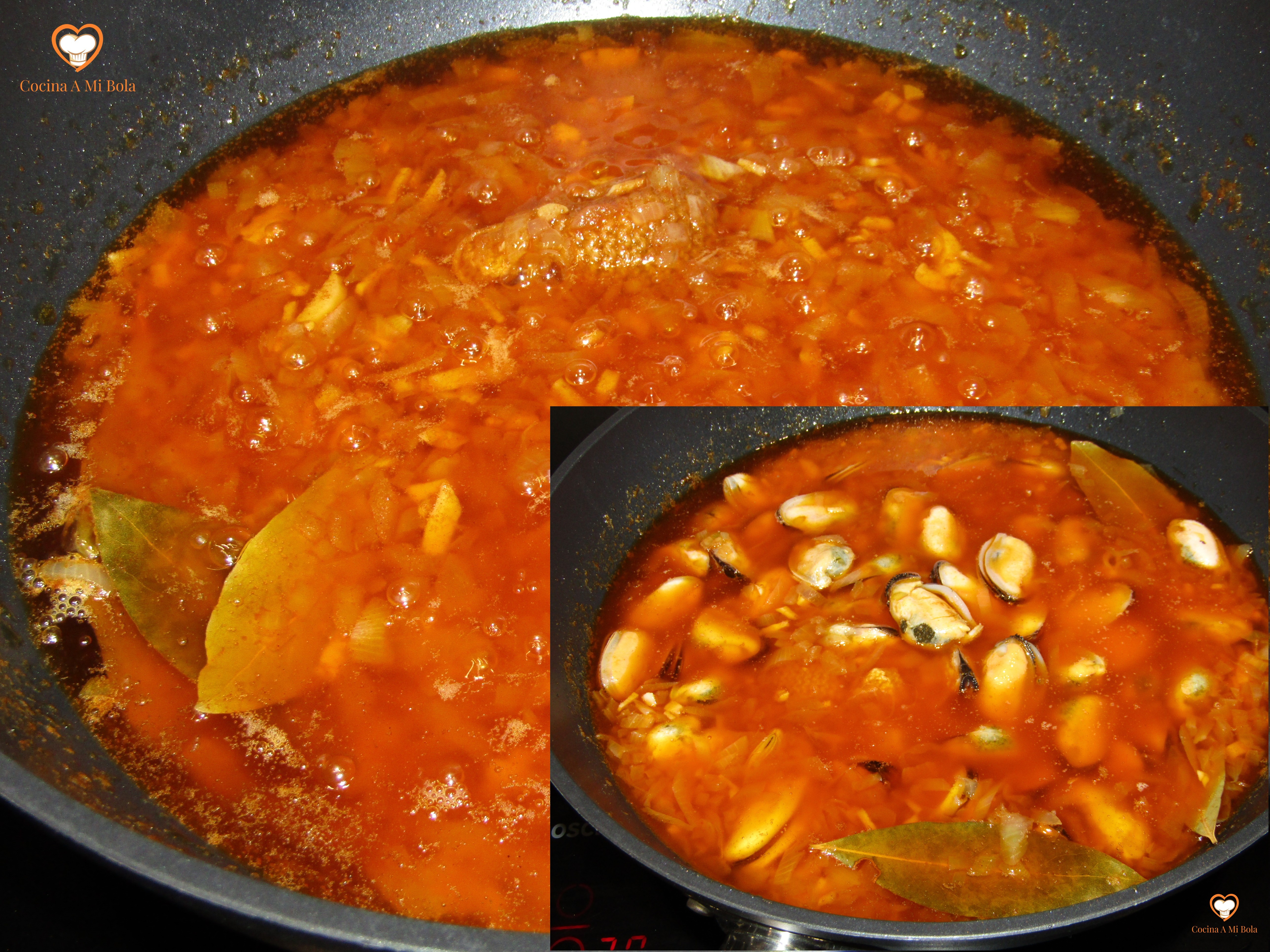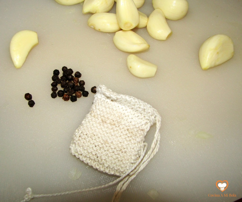 PRIMERO.- Con un par de días de antelación (como mínimo) cocinaremos los mejillones para que tomen sabor del escabeche. Sigue los pasos de la receta “Mejillones en escabeche” que encontrarás en la sección de pescados y mariscos. Sólo dos diferencias y un matiz entre esa receta y lo que debes hacer ahora: una; las cantidades especialmente la de mejillones, ya que para que nos salga suficiente cantidad para cubrir la empanada necesitaremos 2 kilos con su concha para que nos queden unos 700 gramos netos de carne de mejillón ya cocinado al vapor. Y dos; que queremos la cebolla y el ajo no tan picados. Necesitamos trozos más gruesos, como los de un sofrito normal, para que podamos notarlo en la empanada. Y el matiz: usa una pequeña red si te es posible para echar los granos de pimienta al guiso y poder eliminarlos luego de una sola vez en lugar de tener que “pescarlos” uno a uno. Yo tengo una bolsita hecha como la de los garbanzos, pero muy pequeña, que encargué con esta idea a mi proveedora de ganchillo, mi querida suegra. Os pongo algunas fotos del proceso, pero mira la receta de los mejillones en escabeche. Una vez hechos, tápalos bien y mételos en el frigorífico un par de días procurando que todos ellos estén completamente sumergidos en el escabeche.