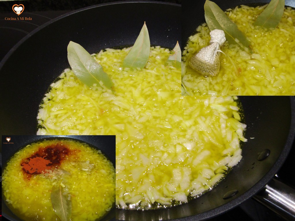 QUINTO.- Cuando la cebolla vaya tomando un tono dorado y esté pochada, subiremos el calor y echaremos el brandy. Remueve bien, fuego medio y deja que evapore el alcohol un par de minutos.