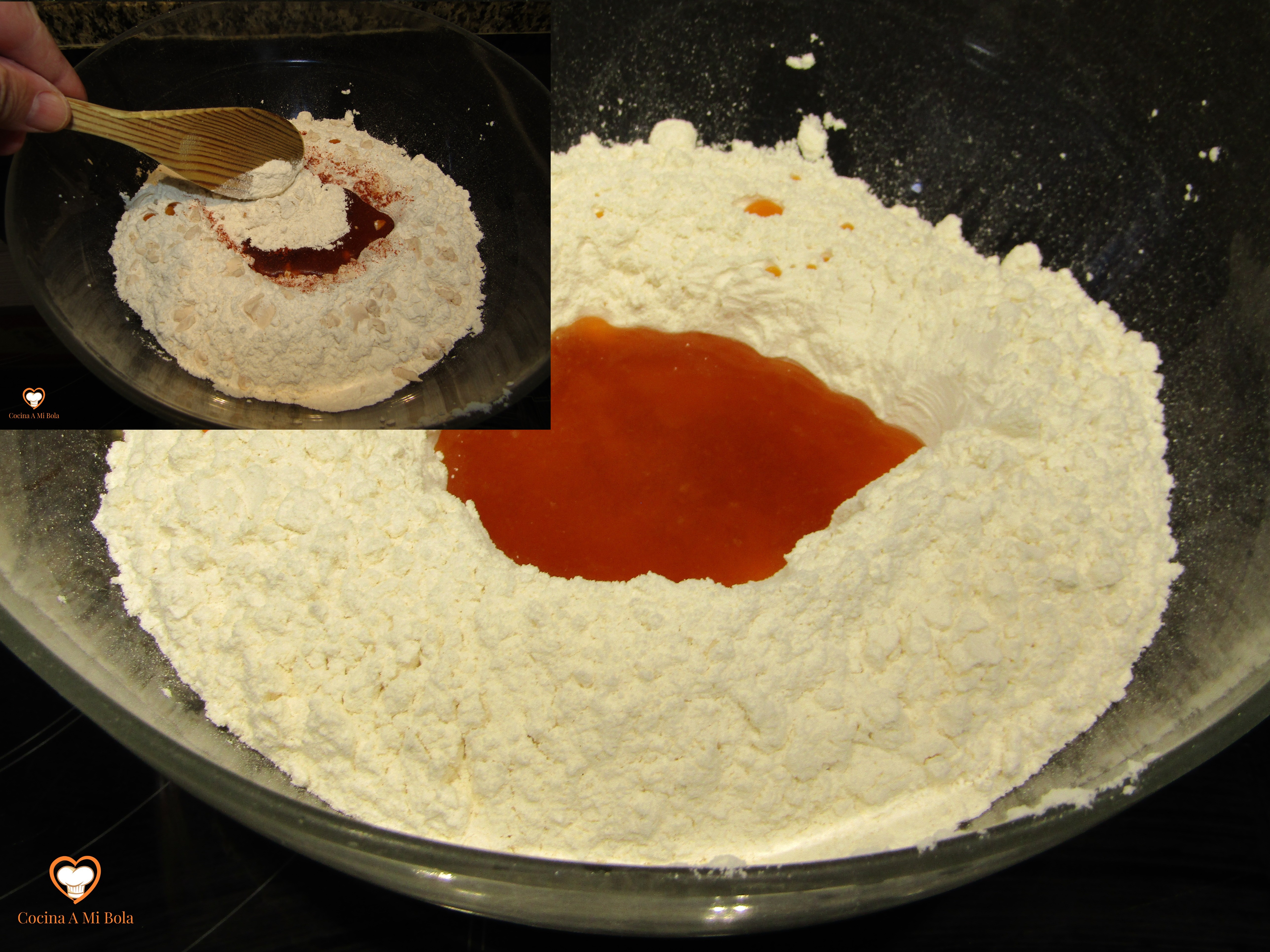 TERCERO.- Y mientas tanto, vamos con la masa. Usa un bol grande y echa la harina haciendo una especie de cráter en el medio como si fuera un volcán y pon en él la levadura bien desmenuzada, la sal, el pimentón, las 15 cucharadas del escabeche, procurando tomarlas de la superficie para que en su mayoría sea aceite del guiso. Casi inevitablemente, caerán también pequeños trozos de cebolla, pero no te preocupes porque formarán parte de la masa aportando sabor.