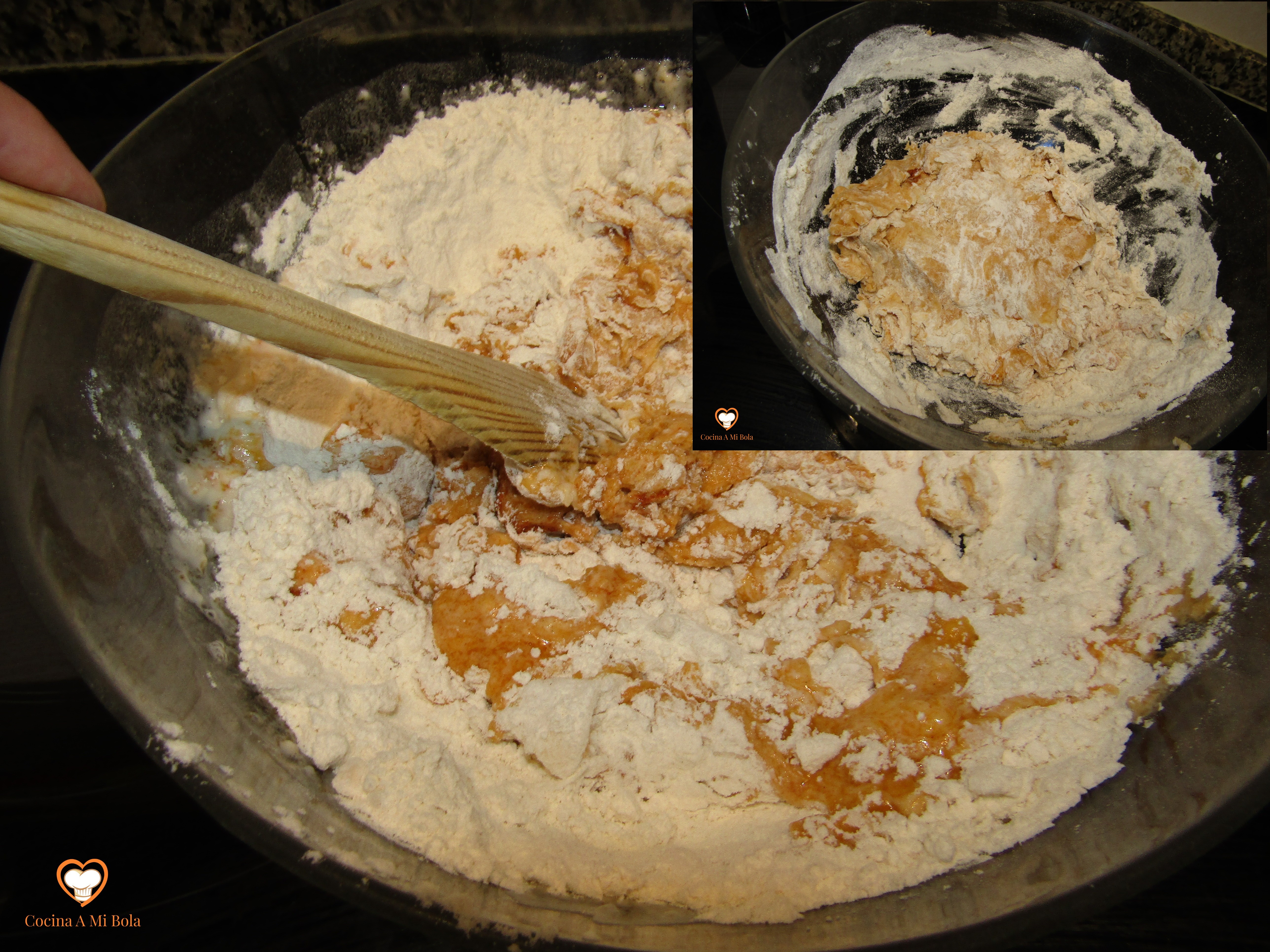 CUARTO.- Con una cuchara de cocina empieza a echar harina desde el borde exterior sobre el cráter que contiene el resto de ingredientes. Mezcla y amasa dentro del bol todo lo que te sea posible porque de momento será una masa muy pegajosa.