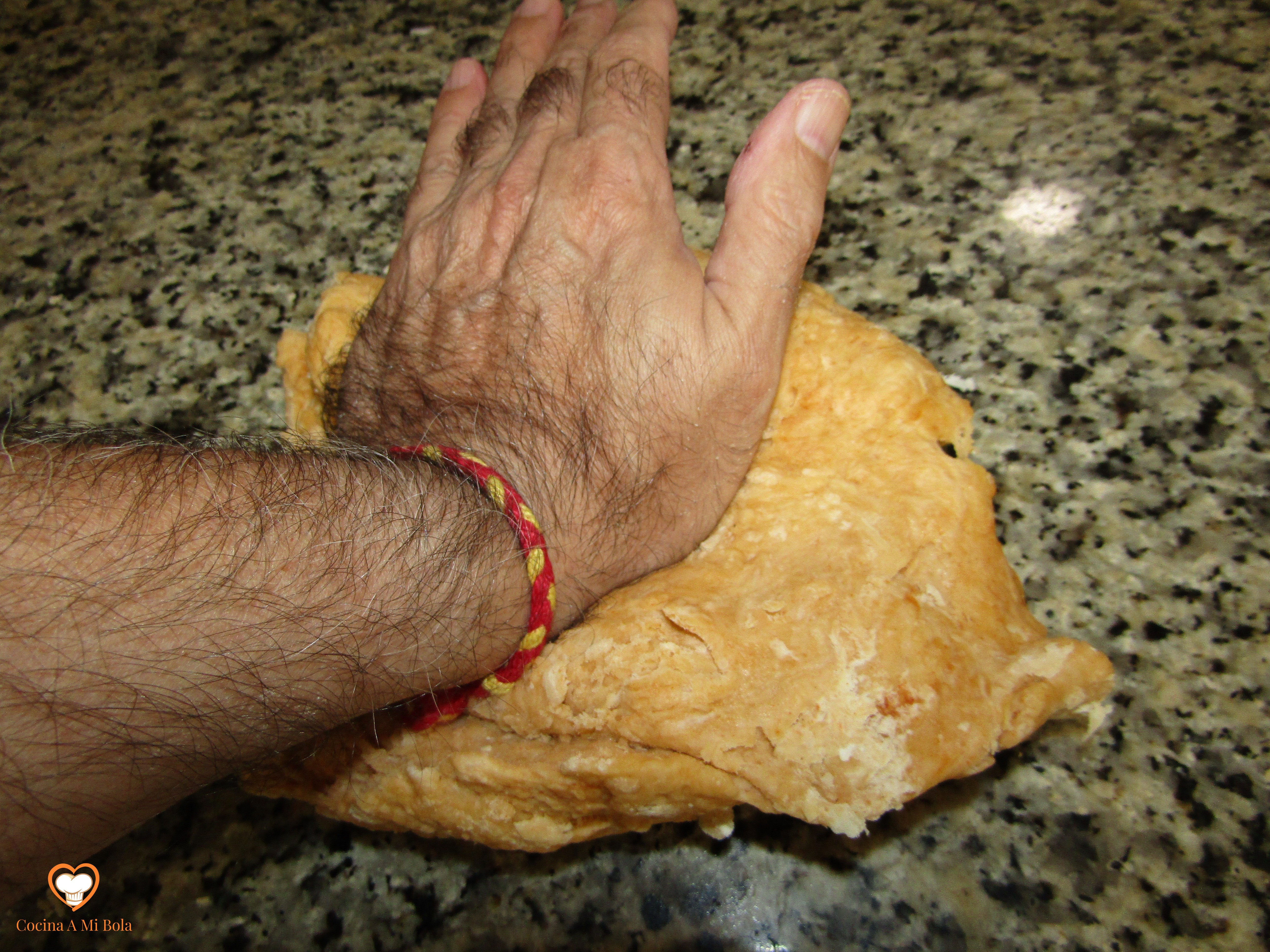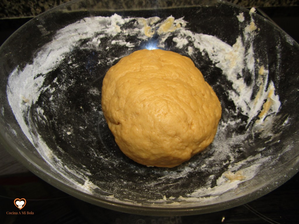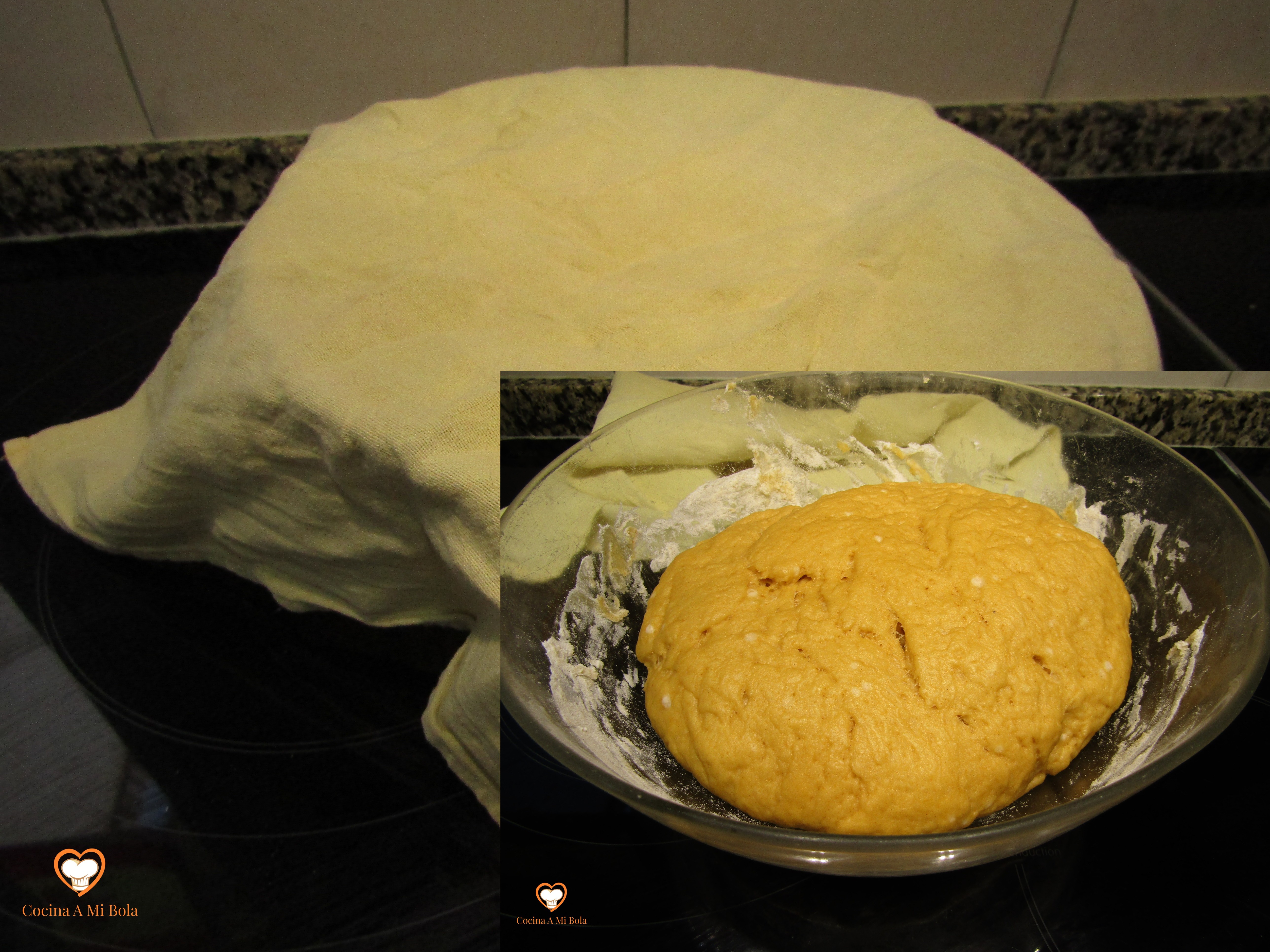 QUINTO.- Continúa amasando ya sobre la mesa de trabajo. No hace falta que enharines la superficie ya que la grasa que contiene la masa impedirá que se pegue. Trabájatela bien, con ganas durante un ratillo hasta que se integren todos los ingredientes y adquiera una consistencia compacta, uniforme y elástica. Si lo has hecho bien y has amasado durante al menos 5-7 minutos seguidos, no necesitará nada más, pero si no, necesitará algo más de harina o agua si quedó pegajosa o seca, respectivamente. Dale forma esférica, déjala de nuevo en el bol y cúbrela con un paño para que repose durante unos 40 minutos aproximadamente. En ese tiempo habrá duplicado su volumen (más o menos… tampoco te agobies si no crece tanto).