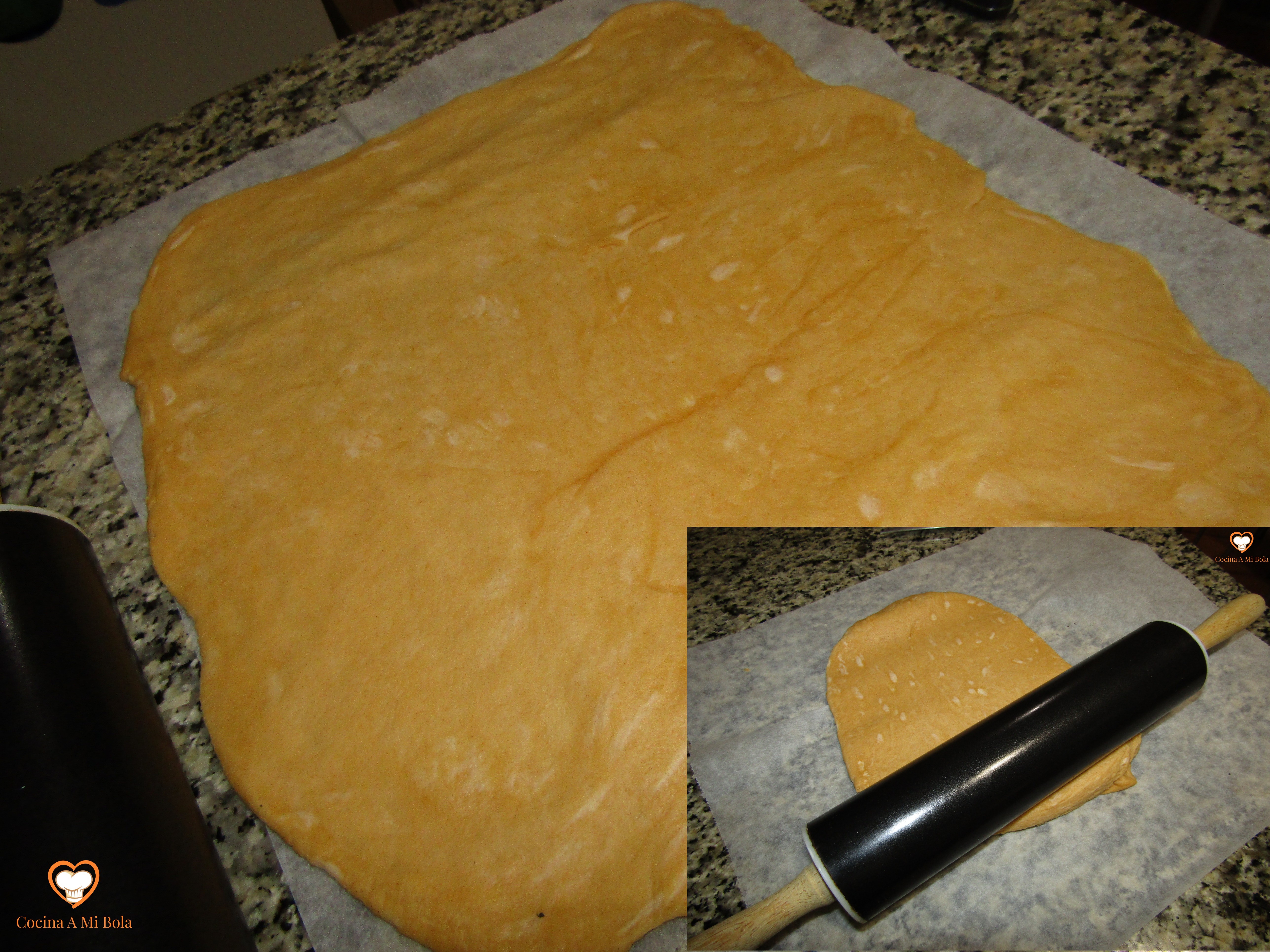 SEXTO.- Y vamos al lío: corta la masa en dos partes iguales y vamos a estirar una de ellas. Para que te sea más fácil de manejar, hazlo con rodillo y sobre un papel de horno extendido. Estírala y dale forma rectangular hasta que quede de un grosor de unos 4 milímetros aproximadamente. Si la dejamos muy gruesa, crecerá en el horno y será demasiado pan. Verás que tras estirarla, tenderá a encoger y volver a su ser. Eso te dirá que tiene la textura adecuada. Insiste con el rodillo hasta que quede bien estirada. Tomándola por el papel de horno pásala a la bandeja del horno (con papel y todo).