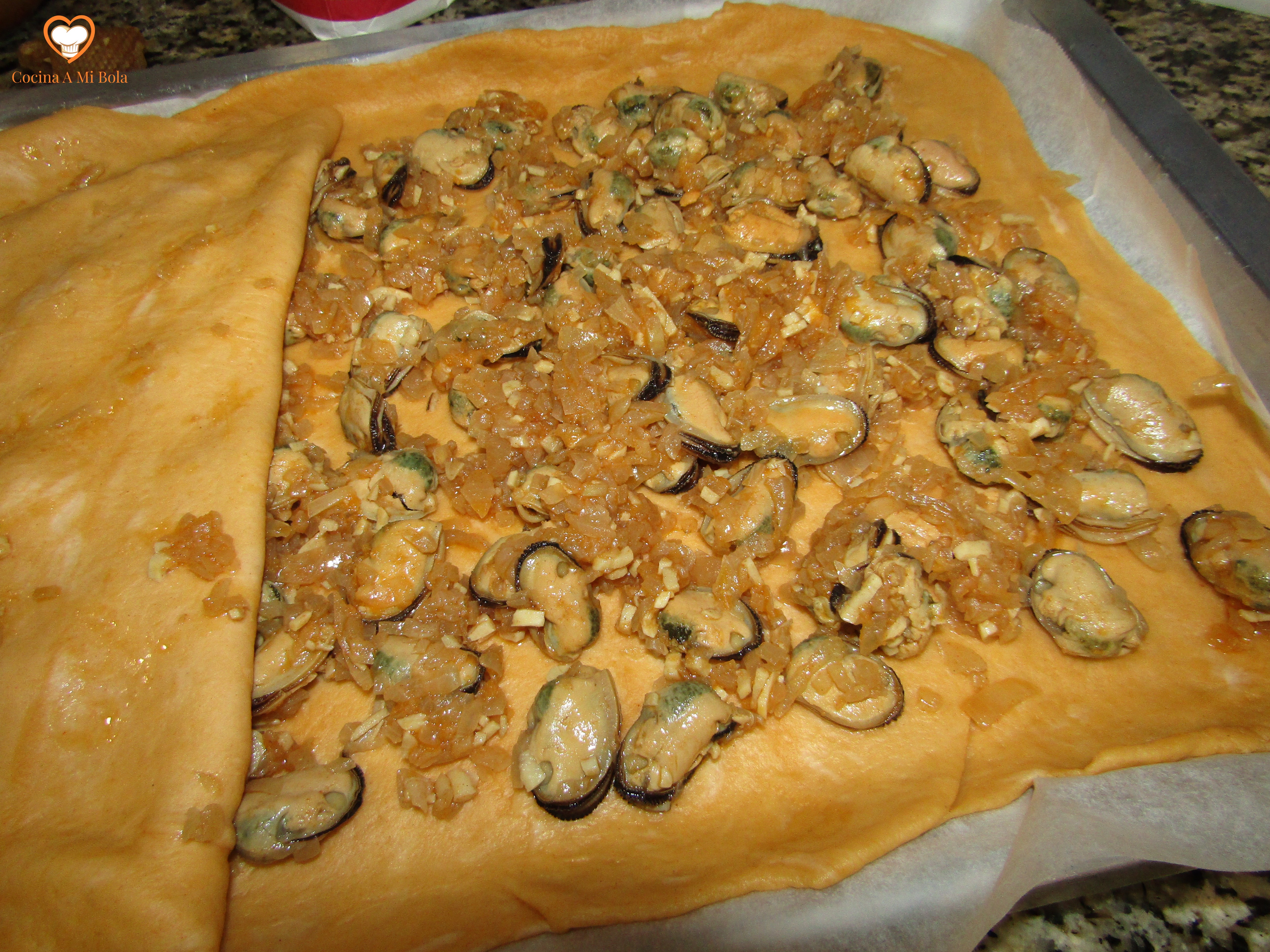 SÉPTIMO.- Ahora reparte por toda la superficie los mejillones, cebolla y ajo del escabeche, respetando un mínimo de perímetro exterior para que no se engrase y se una bien a la parte de arriba cuando cerremos. Como la mayoría del líquido se habrá escurrido, que no te importe que caiga algo sobre la masa, pero no añadas.
