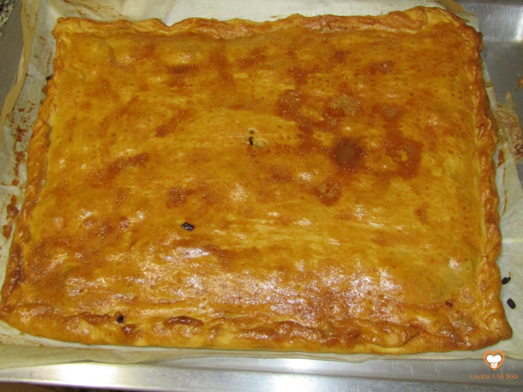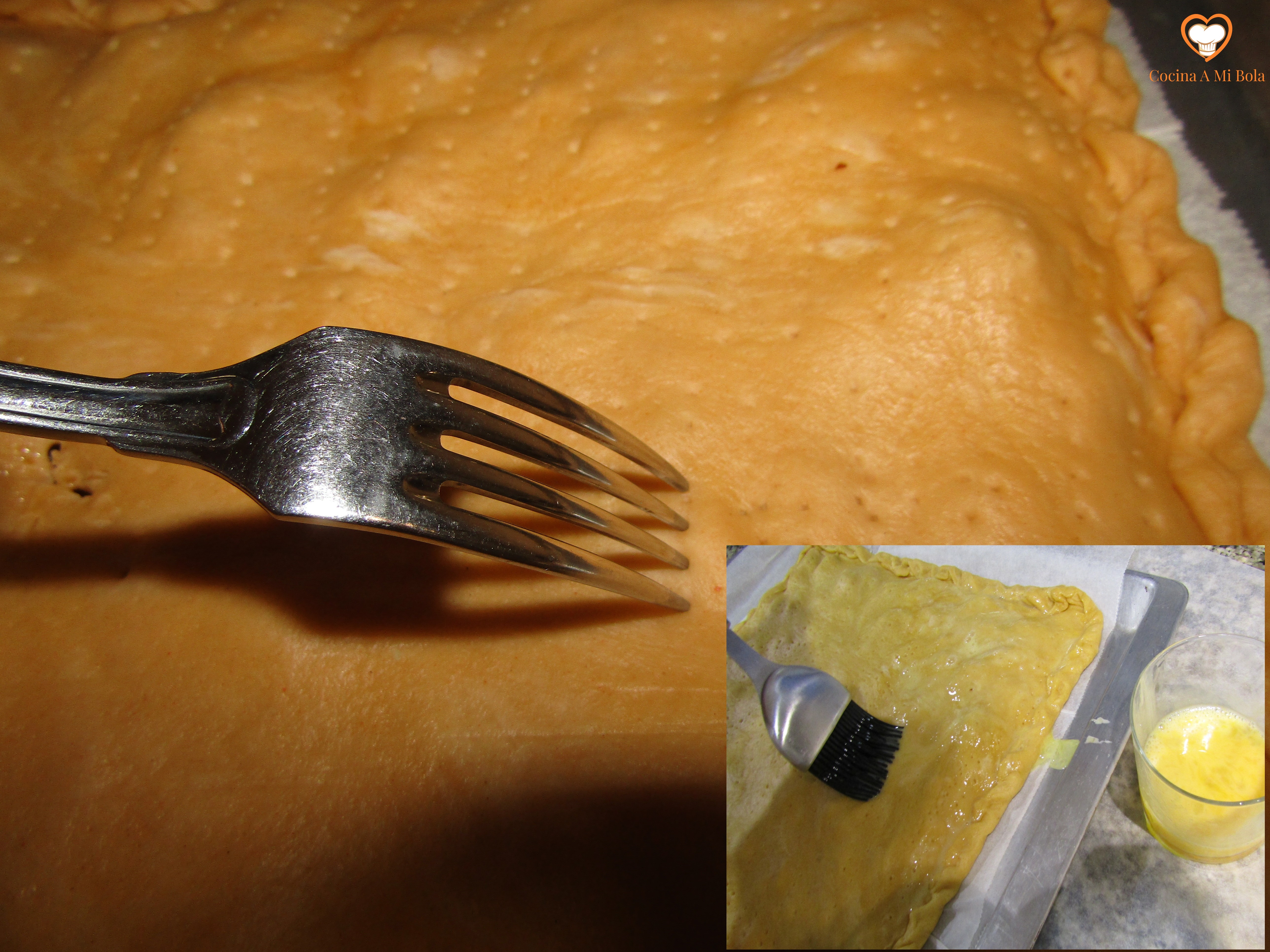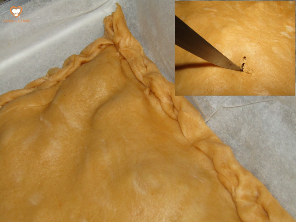 OCTAVO.- Haz la misma operación con la otra mitad de la masa y cuando esté bien estirada utiliza el papel de horno para cogerla y volcarla sobre la parte de abajo. Retira el papel y procura casar la tapa con la parte de abajo uniendo los bordes, apretándolos y dando un giro como si fuera un pellizco. Pon cuidado en que quede bien cerrada por todas partes y que no se manche con la grasa del relleno ya que podría abrirse en el horno.