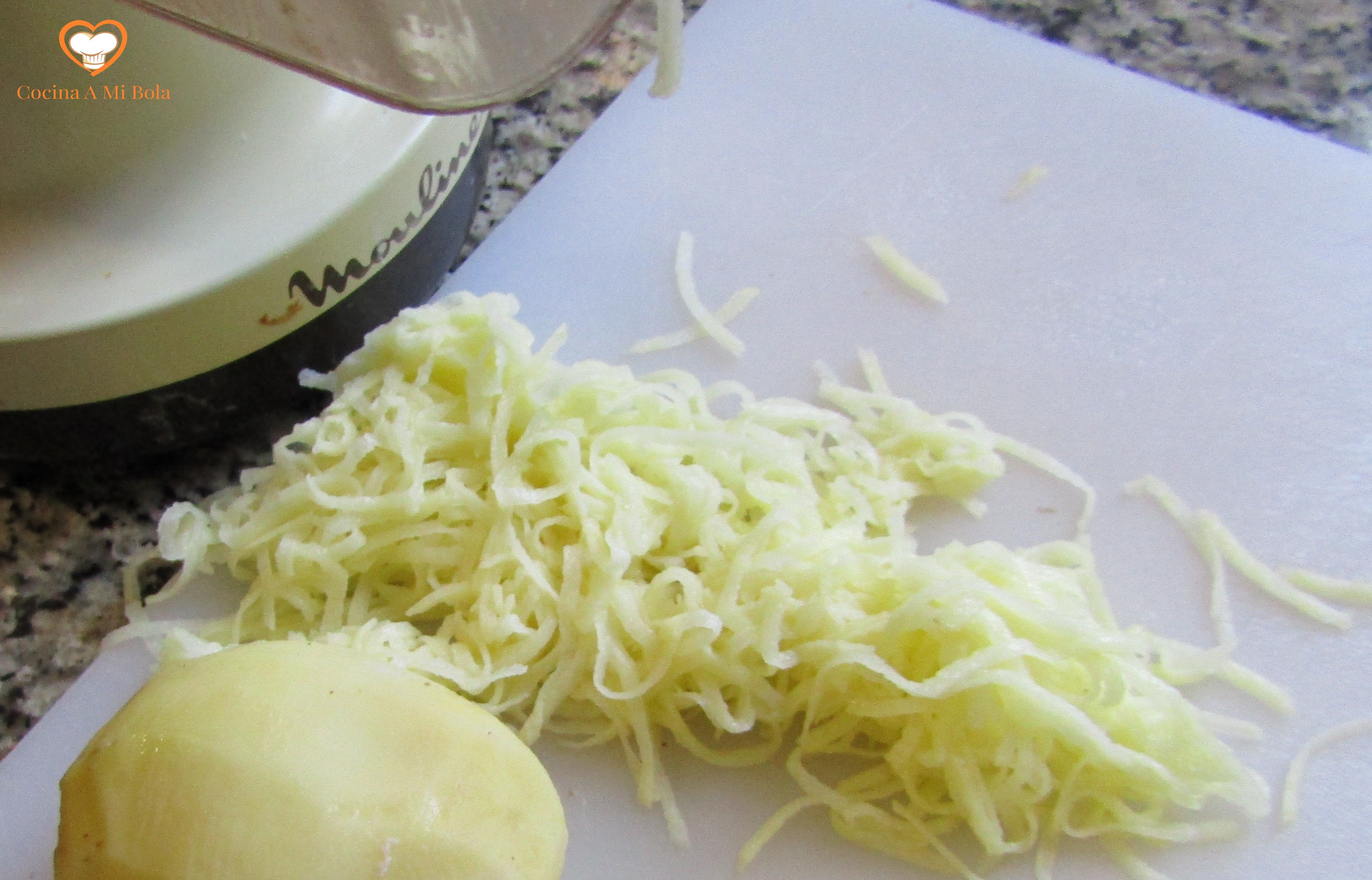 PRIMERO.- Pela la patata y rállala en virutas pequeñas con el robot de cocina o con una mandolina en su accesorio más fino. Salar muy moderadamente.