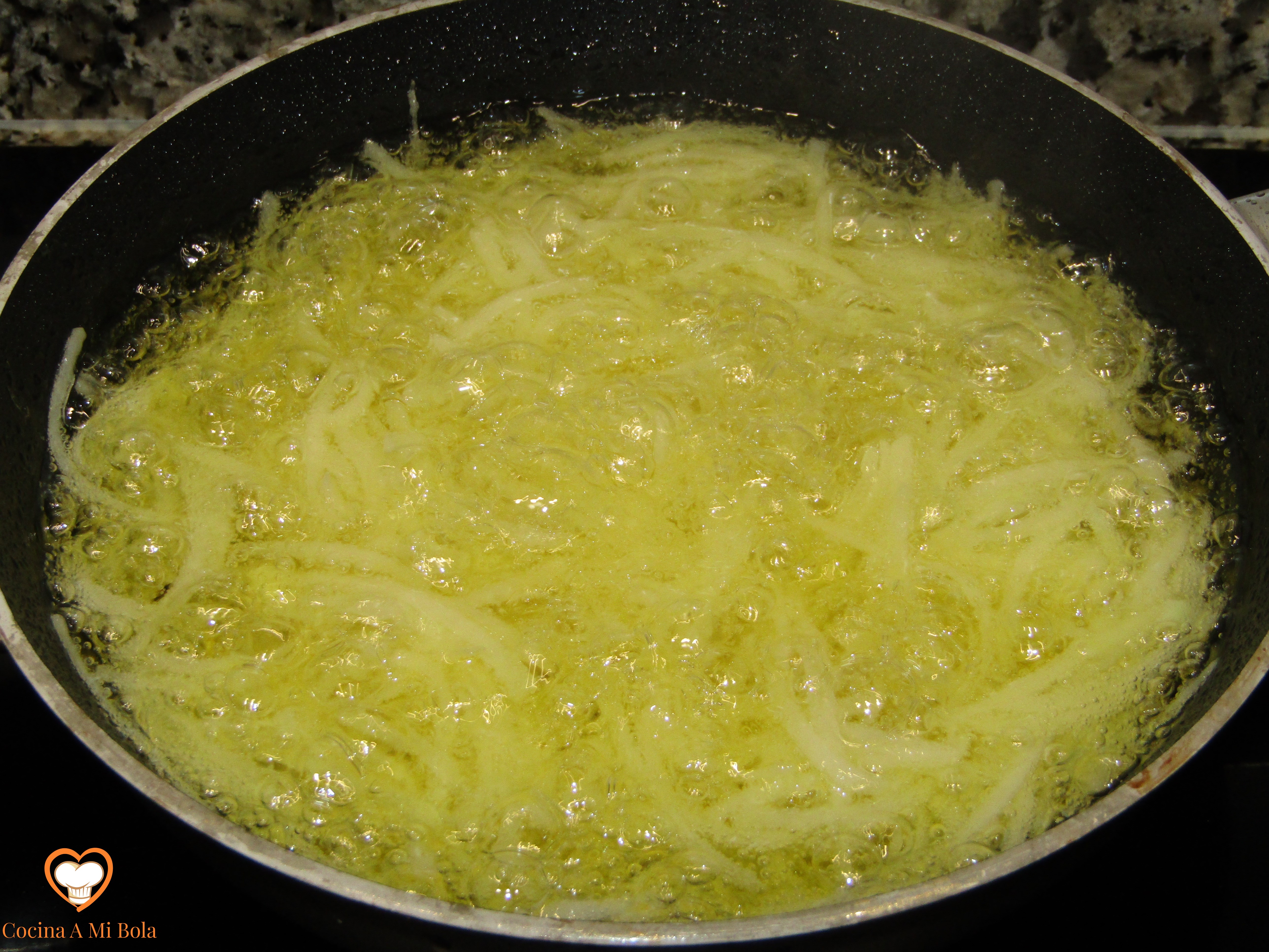 SEGUNDO.- Usa una sartén antiadherente que tenga un diámetro en su fondo de no más de 15 cm. Echa aceite abundante y fríe las patatas a fuego medio alto. Procura que queden distribuidas de forma regular por todo el fondo y que no tenga un grosor de más de 2 cm.