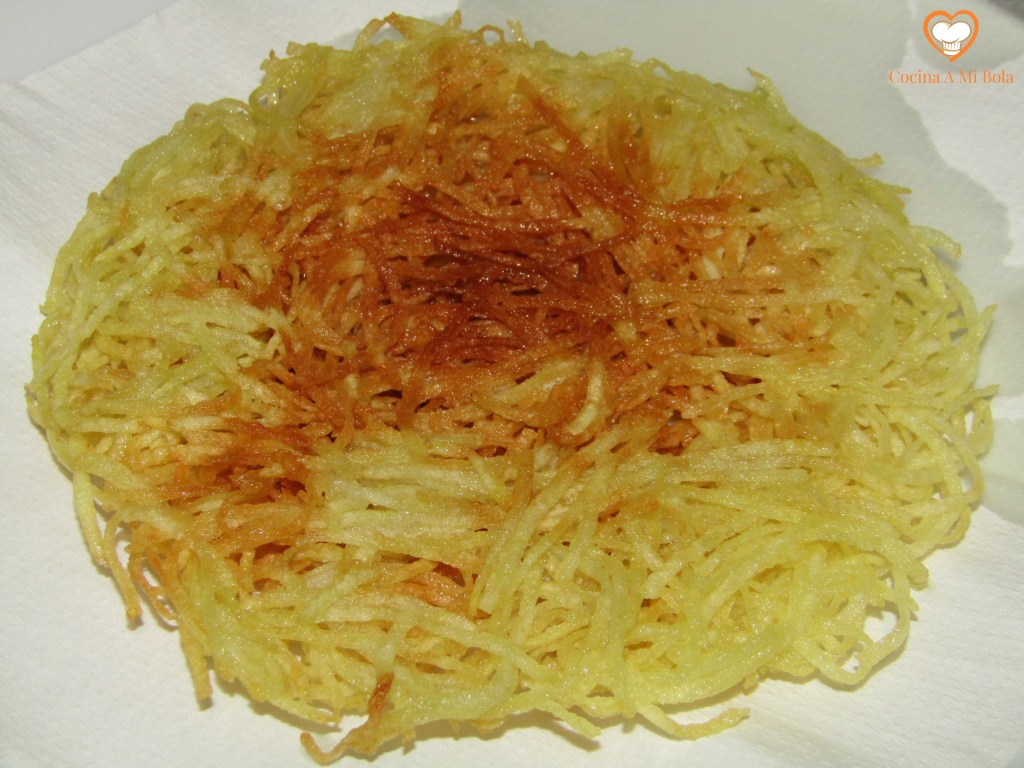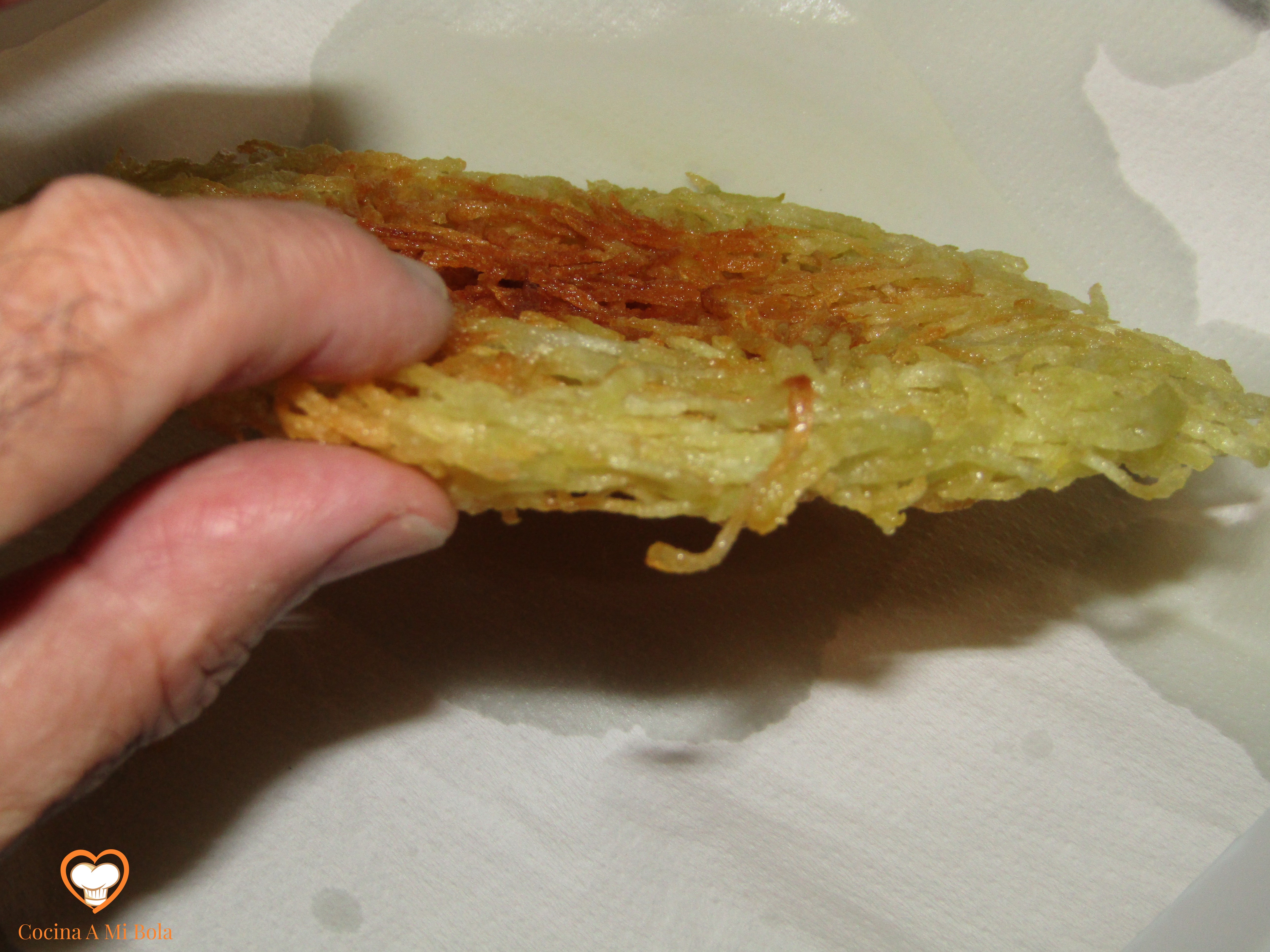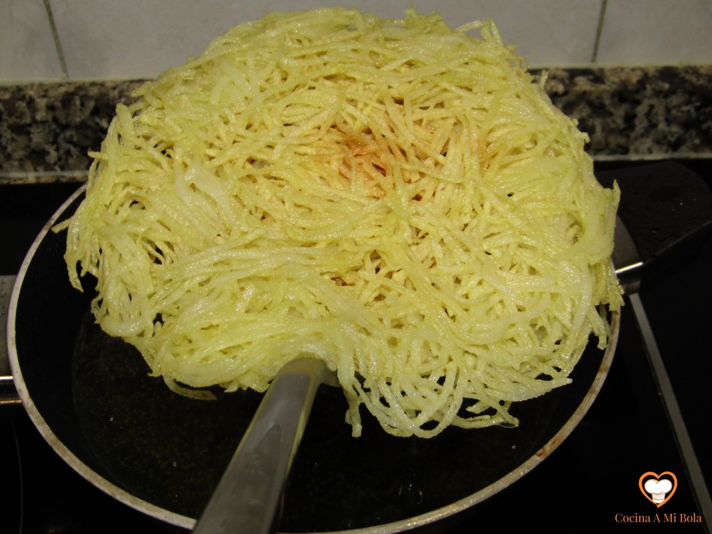 TERCERO.- Pretendemos que los hilos de patata se entrelacen entre ellos, apelmazándose ligeramente. Repito: sólo ligeramente. La idea es que la fritura haga un todo con el contenido de la sartén formando una sola pieza y podamos darlo la vuelta como si fuera una tortilla. Que se dore ligeramente, pero que no se arrebate porque se quedaría muy duro. Sácalo a un plato con papel absorbente para que escurra bien el aceite.