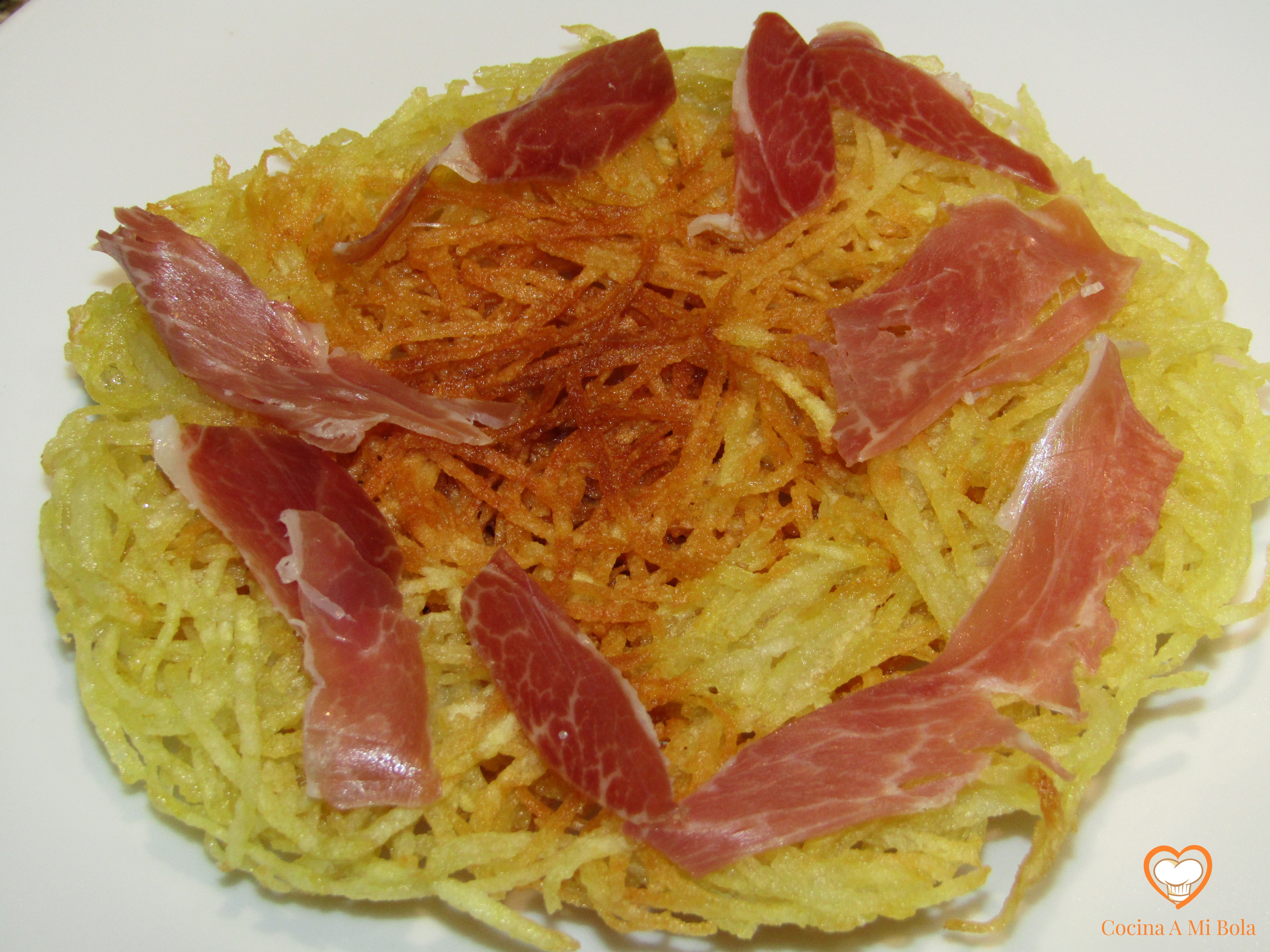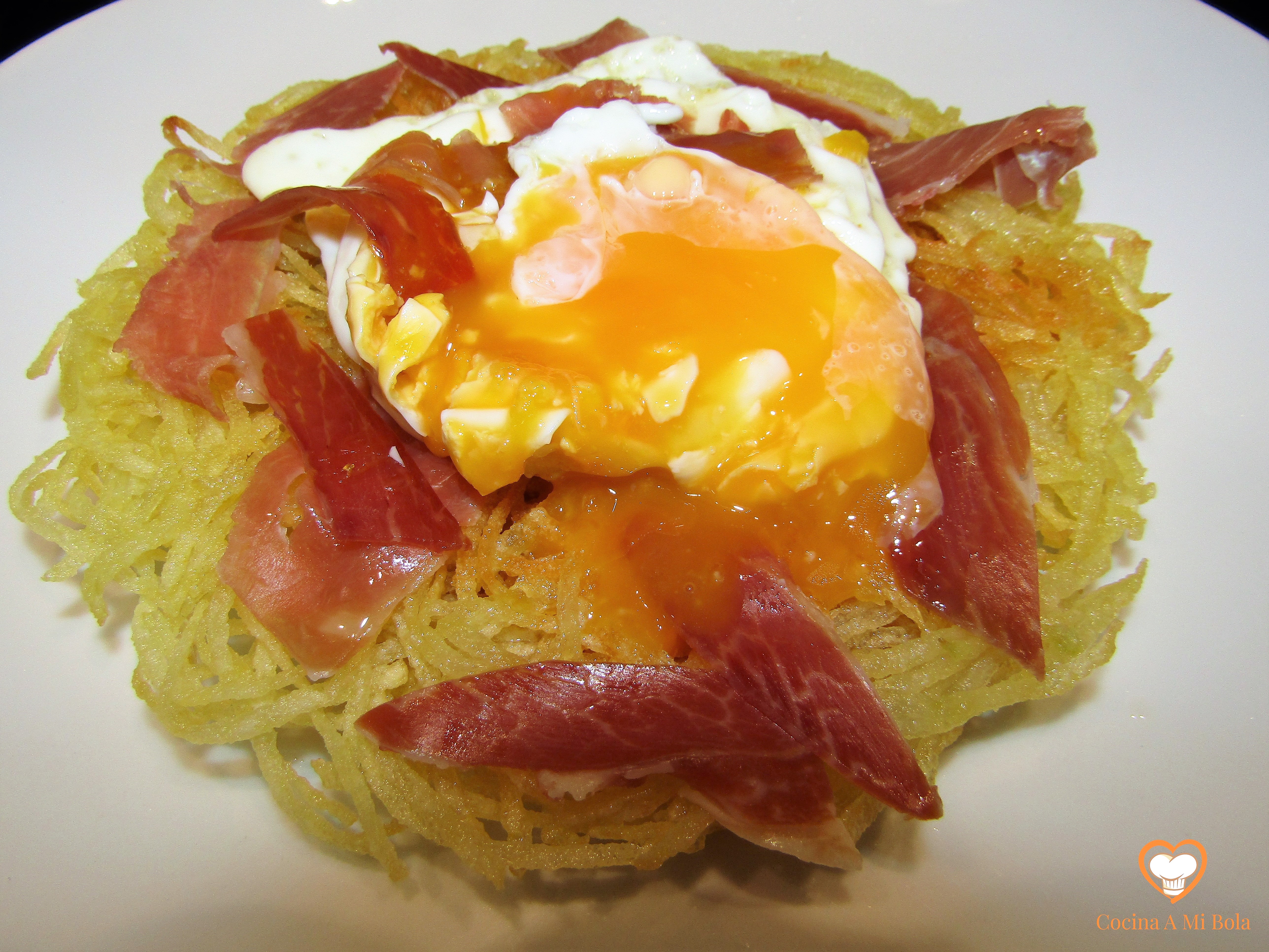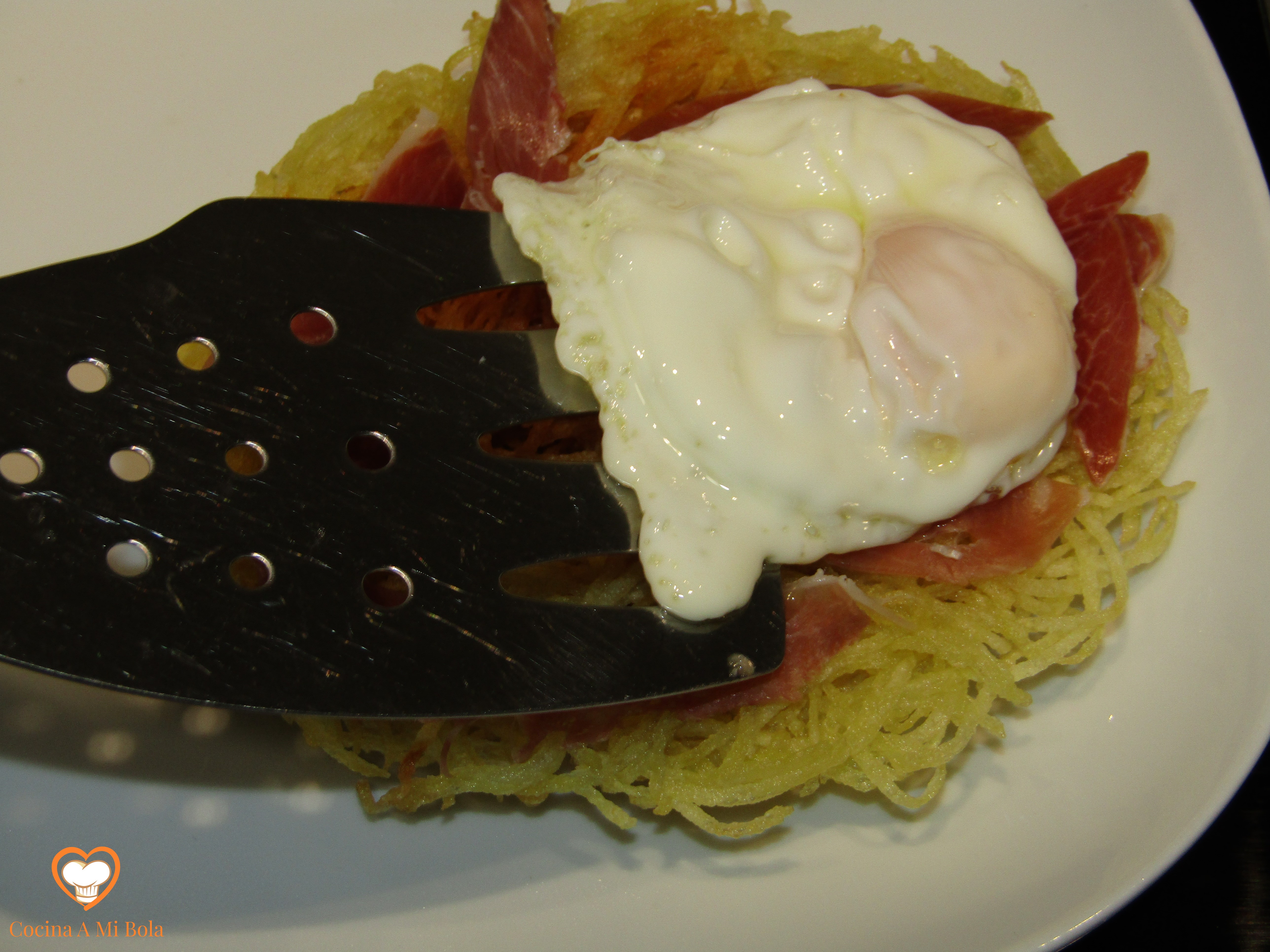 SEXTO.- Colócalo con cuidado sobre el nido de patata rallada, pon más jamón por encima y llévalo a la mesa.