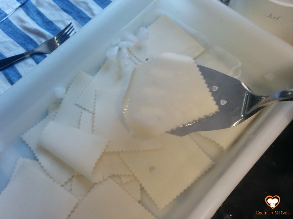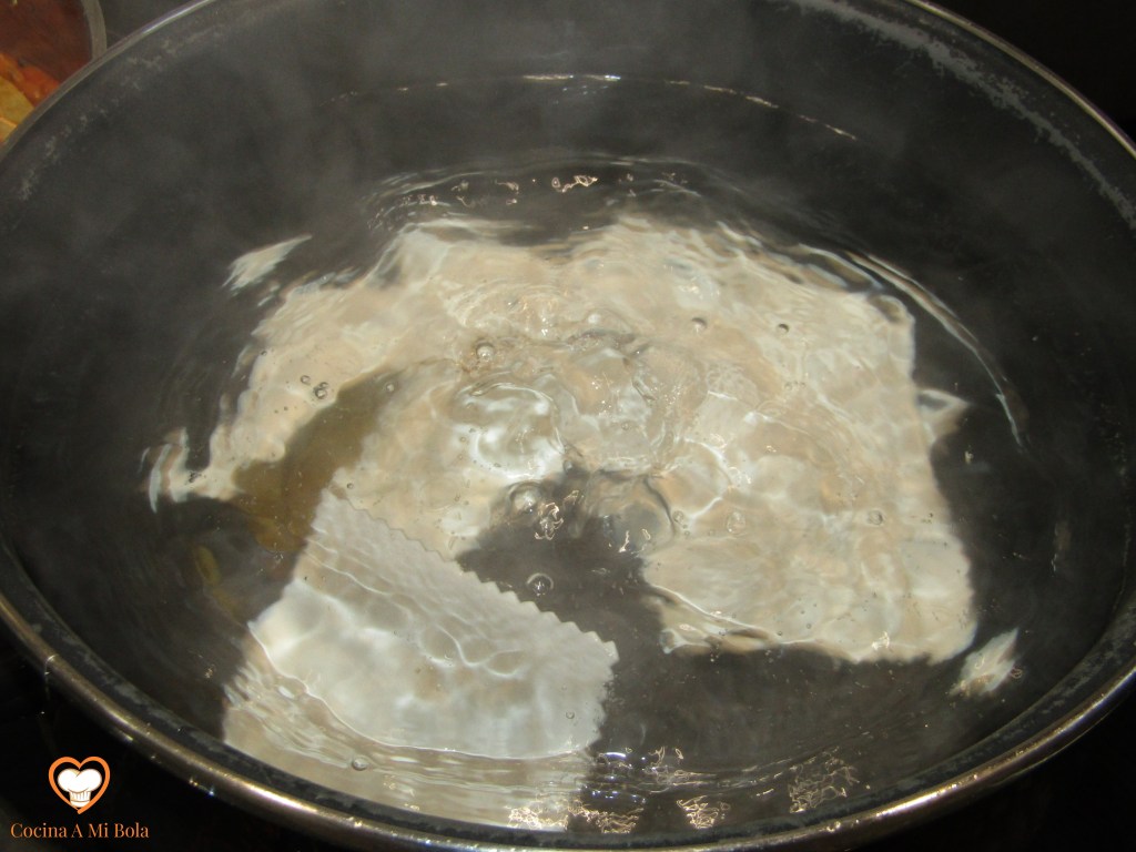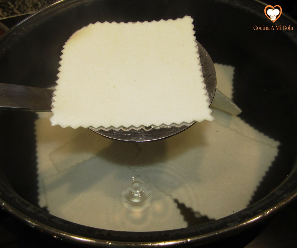 TERCERO.- Pon a cocer una cazuela con abundante agua, una hoja de laurel y un puñado de sal. Deja que hierva a borbotones para que el laurel infusione y la sal se haya diluya, tras lo cual cuece las placas de canelón con mucho mimo para que ni se rompan, ni se peguen entre ellas. Cuando haya transcurrido el tiempo que marca el fabricante, o incluso algo más, usa una espumadera para ir sacándolas una a una y echándolas en un recipiente con agua fría y hielo.