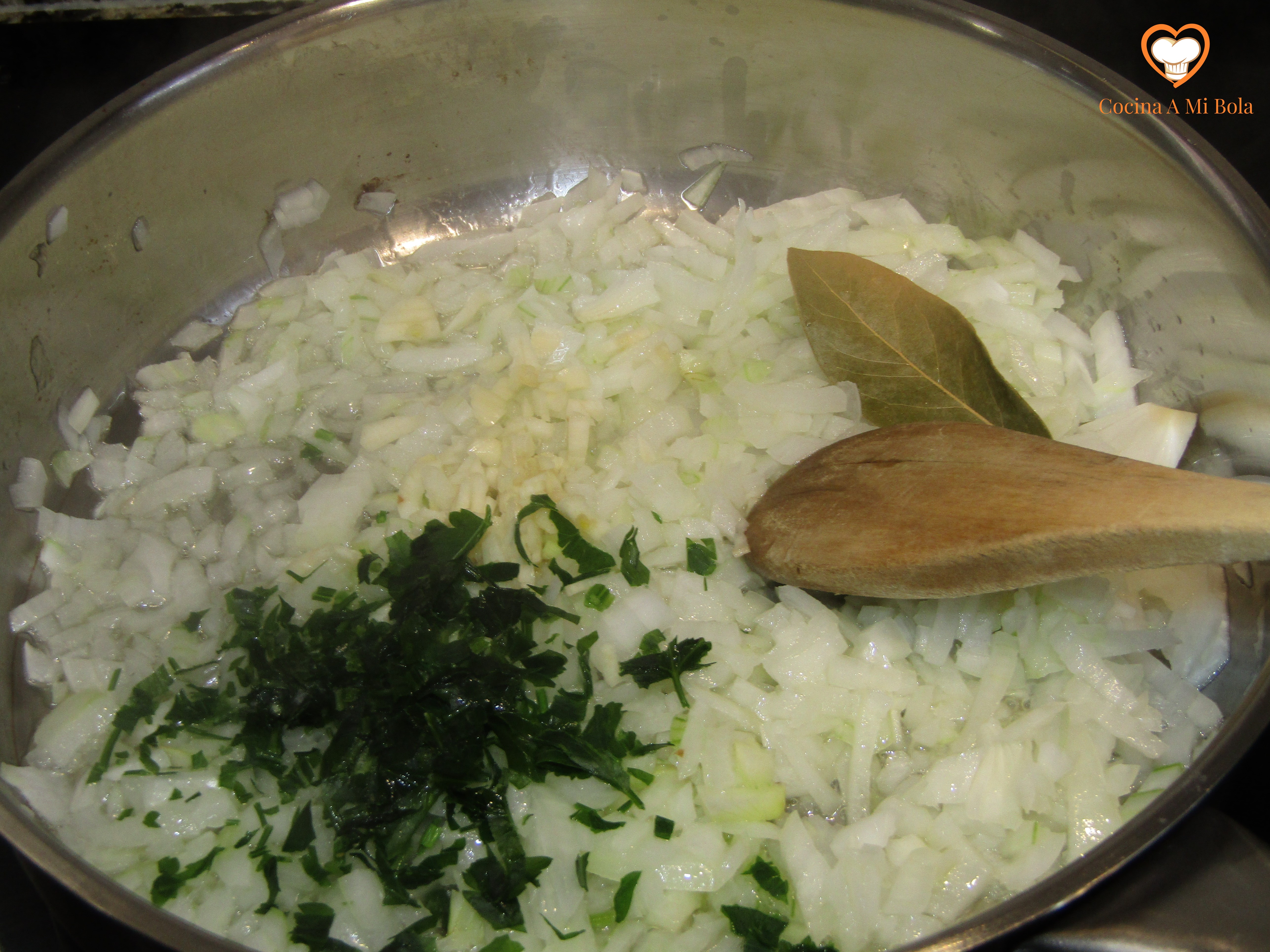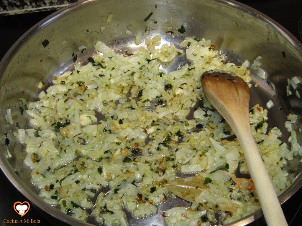 PRIMERO.- Pica la cebolla y el ajo y ponlo a pochar en una sartén con un poco de aceite de oliva virgen extra y una hoja de laurel a fuego medio y enseguida lo bajamos. Al cabo de unos cinco minutos, agregar el perejil picado. Salpimentar.