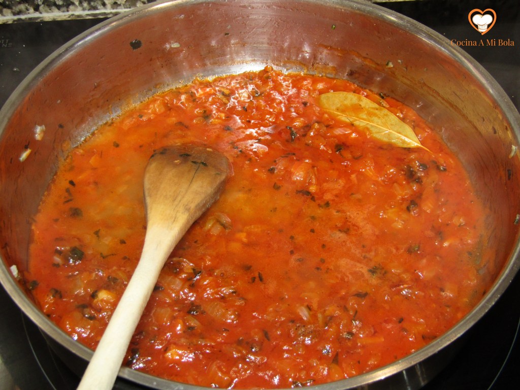 SEGUNDO.- Una vez pochada la cebolla y el ajo, subiremos un poco el fuego y agregaremos medio vaso de vino blanco. Tras remover y rehogar un par de minutos para que evapore el alcohol, echaremos el tomate frito. Removeremos bien y dejaremos enfriar.