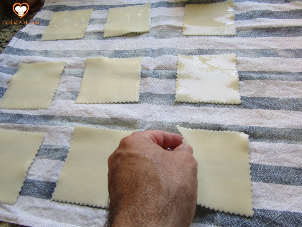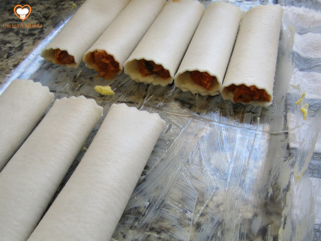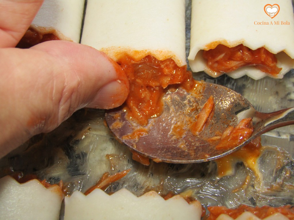 SEXTO.- Usa una fuente de horno ligeramente aceitada en su fondo y ve colocando los canelones ordenados uno a uno, procurando que el extremo final quede boca abajo. De ese modo no se nos desharán. Tal vez te ha sobrado relleno o tal vez te han quedado muy vacíos. Bien, toma una cucharilla y ve introduciendo más relleno por los extremos, poco a poco hasta que estén llenos.