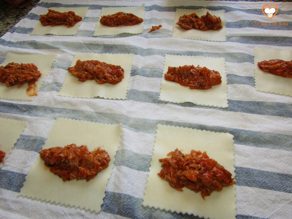 QUINTO.- Pon una cucharada de relleno de atún en cada una de las placas y enróllalas con cuidado.