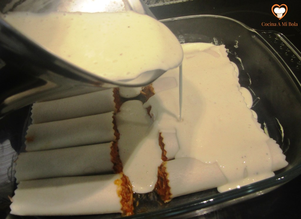 SÉPTIMO.- Ya sólo nos queda hacer una buena salsa bechamel tal y como te explico aquí. En cuanto la tengas, viértela sobre los canelones procurando cubrirlos por todas partes.