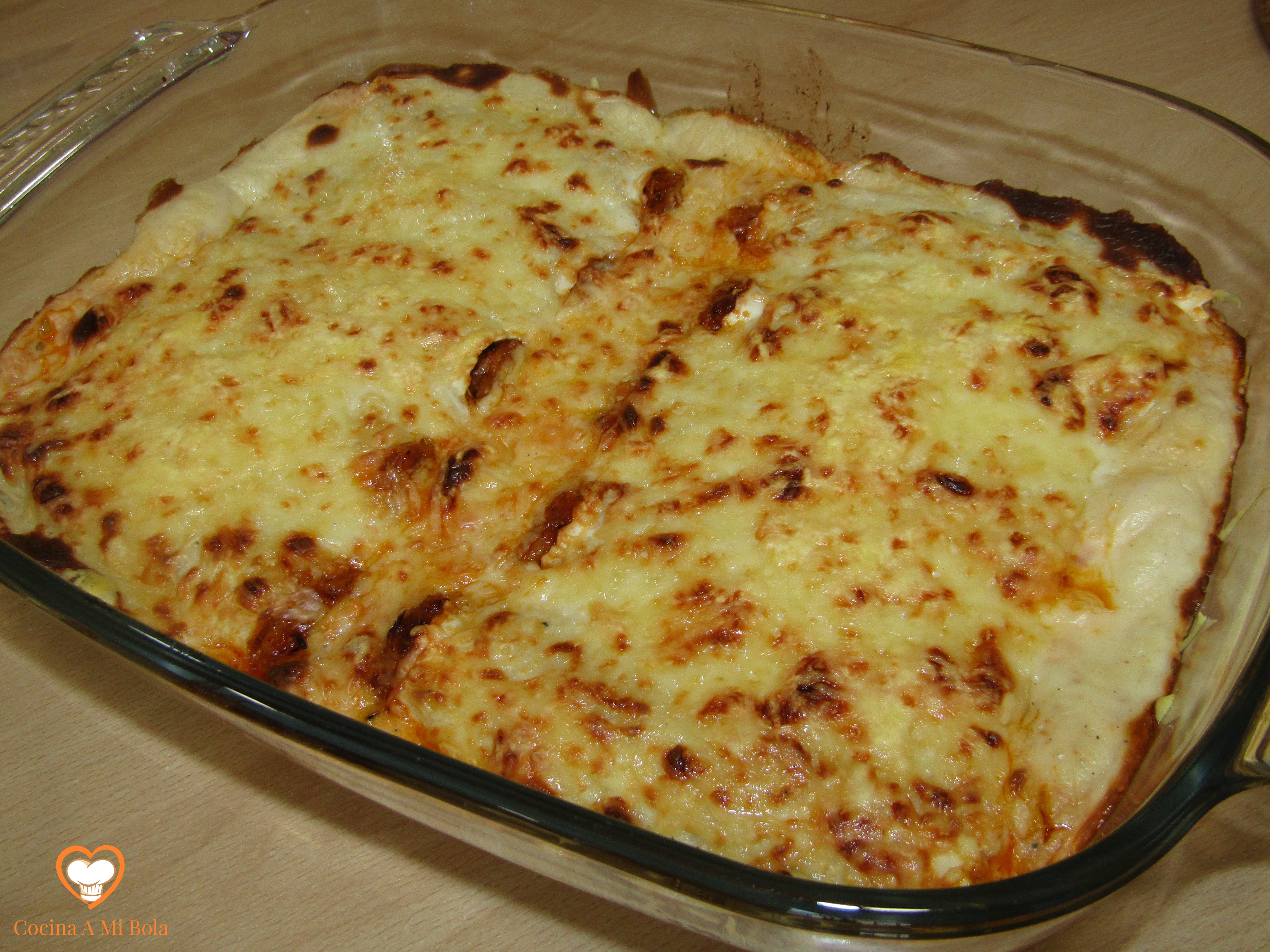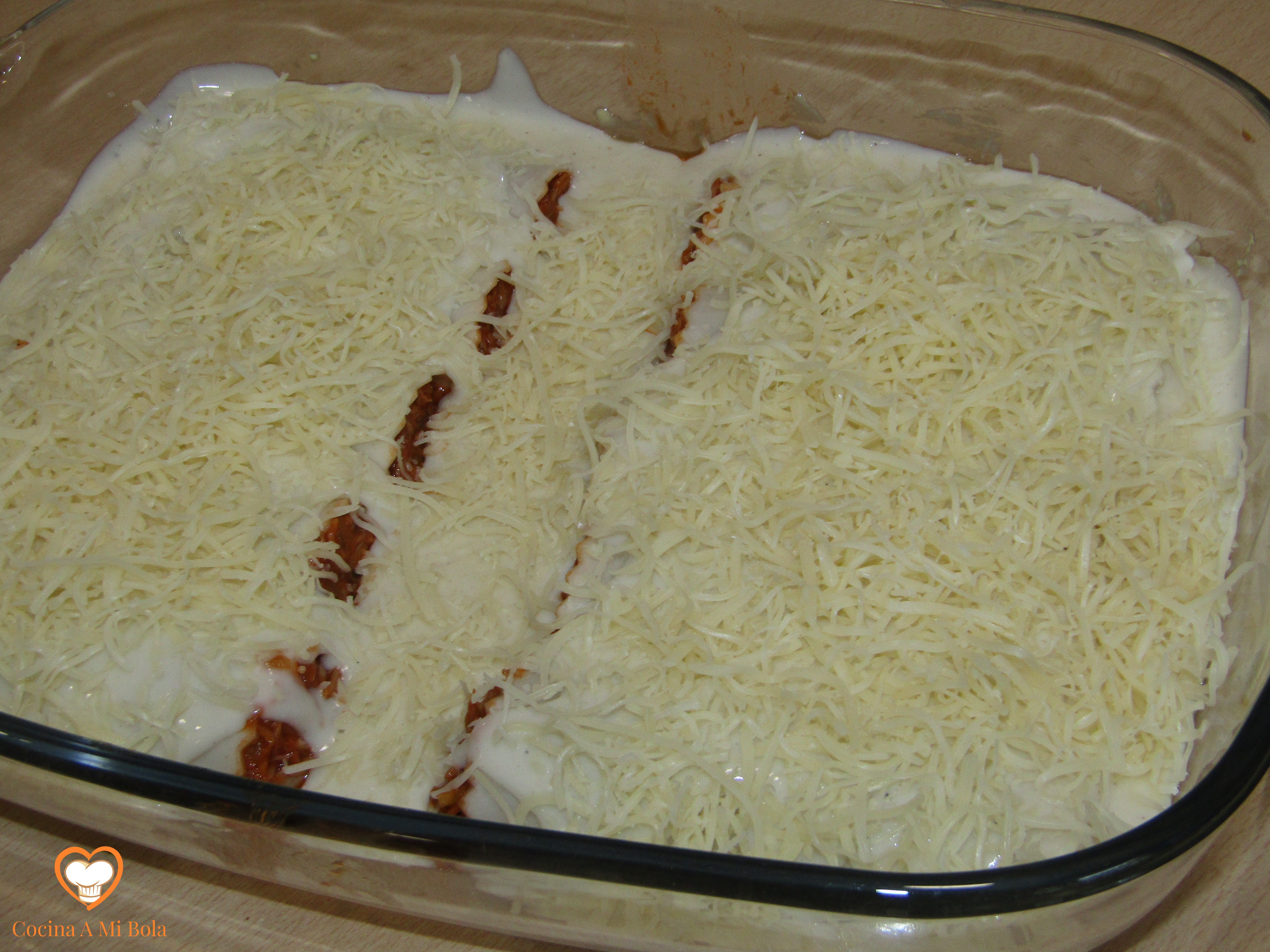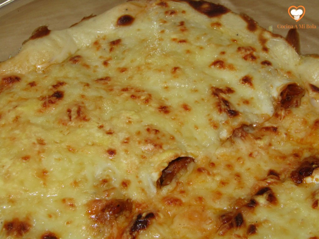 NOVENO.- Cubre con queso rallado la salsa bechamel y mete la fuente en el horno. Dado que el canelón estaba frío, tendrá que tomar temperatura así que no lo pongas al grill directamente o no cogerán calor bastante.