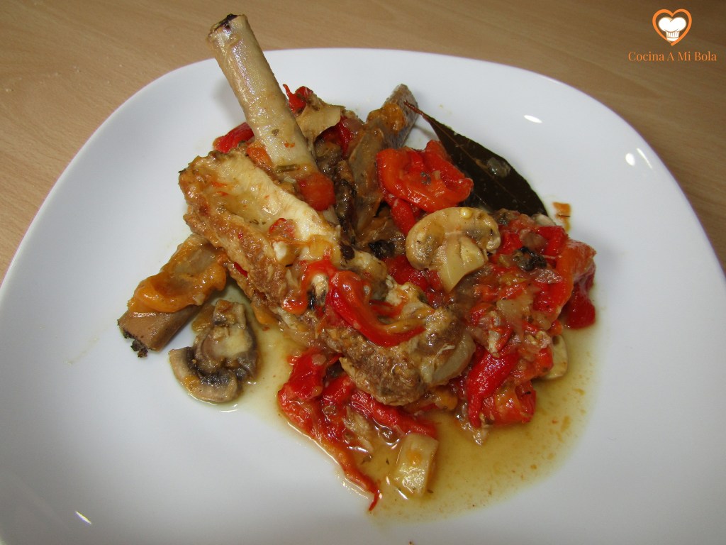 INGREDIENTES: Para 4/5 personas, 2 costillares de ibérico de unos 800 gr cada uno, 4 ó 5 pimientos rojos, 2 cebollas, 1 cabeza de ajos, 220 gr champiñón laminado, vino blanco, jugo de asar los pimientos, pimienta negra molida, perejil picado, 1 cucharadita de pimentón dulce, comino en grano, tomillo, orégano, dos hojas de laurel, sal.