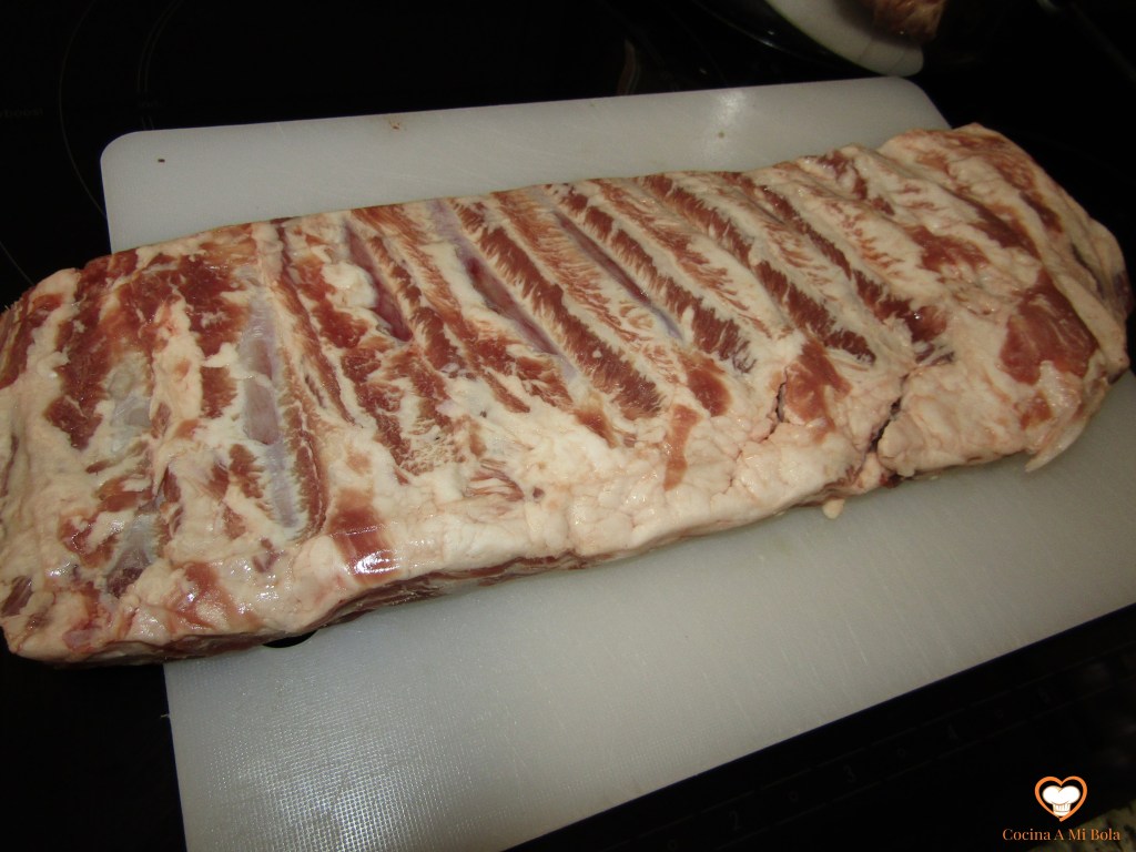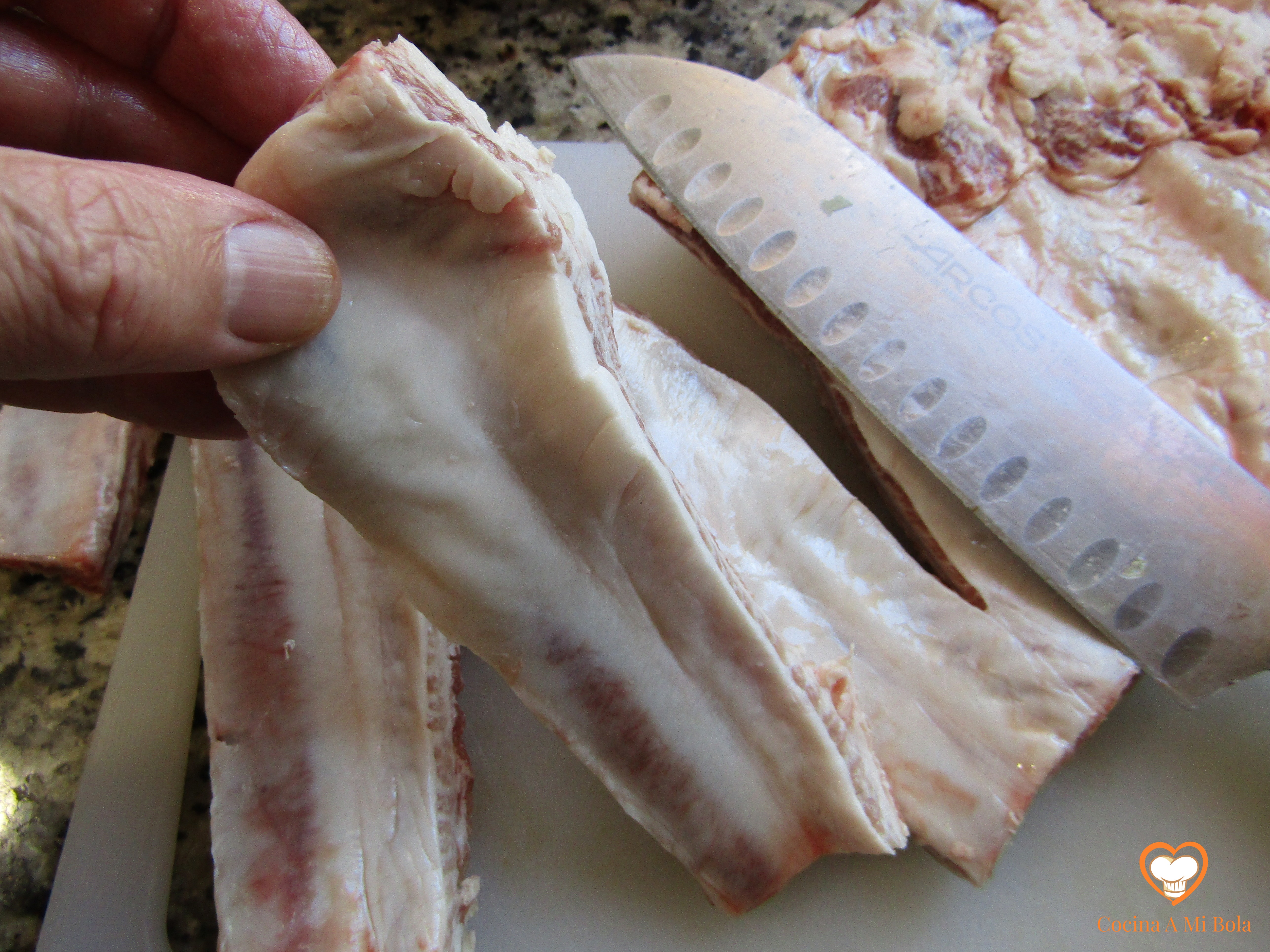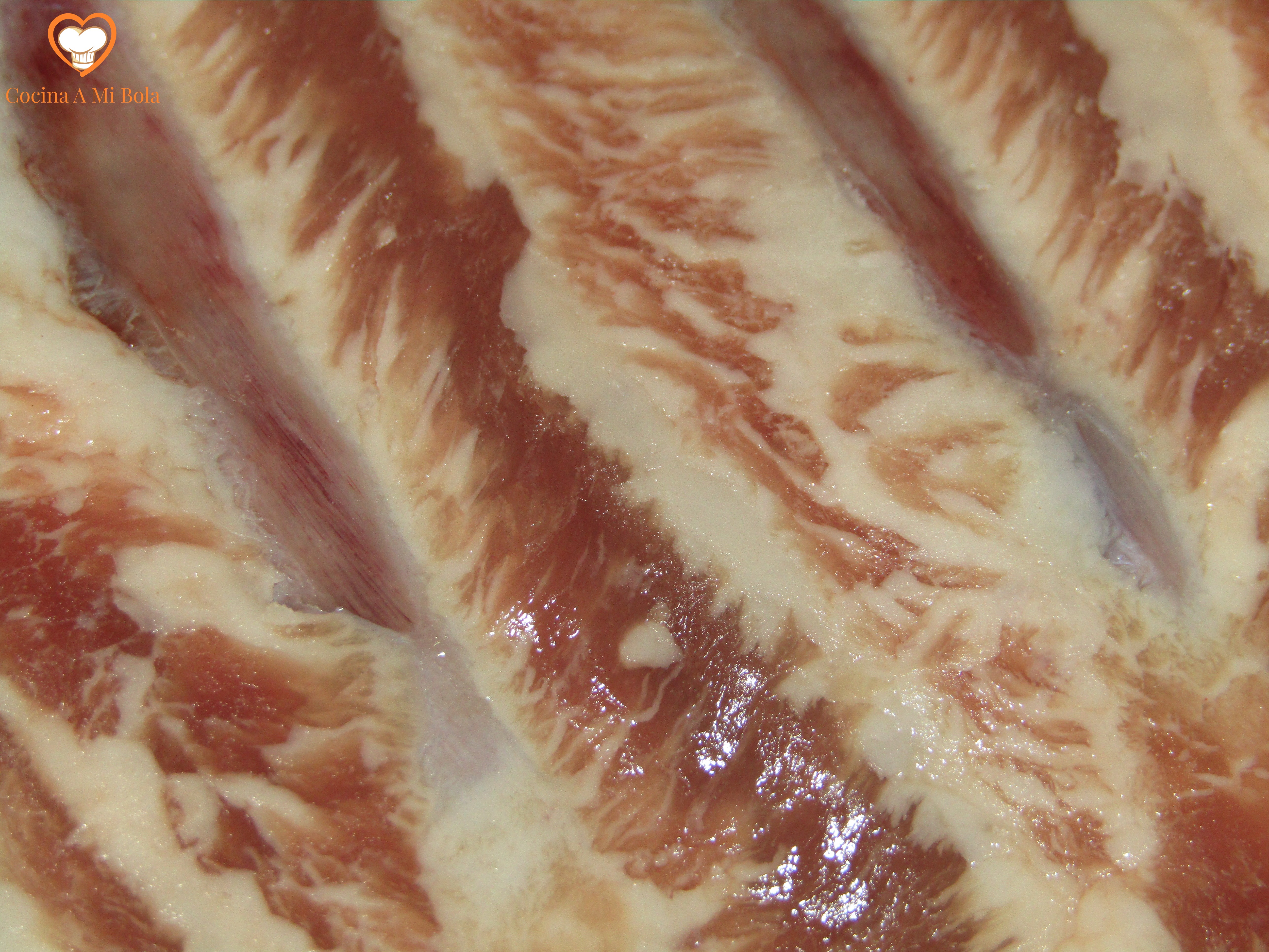 SEGUNDO.- Mientras se asan, quitaremos el exceso de grasa blanca que pueda haber acumulada en la parte interior del costillar. Para mí, es de suma importancia que hablemos de cerdo ibérico porque esta pieza suelta muchísima grasa y por mucho que intentemos eliminarla, el plato resultará contundente. La grasa ibérica entreverada (mira la foto) es algo más cardiosaludable.