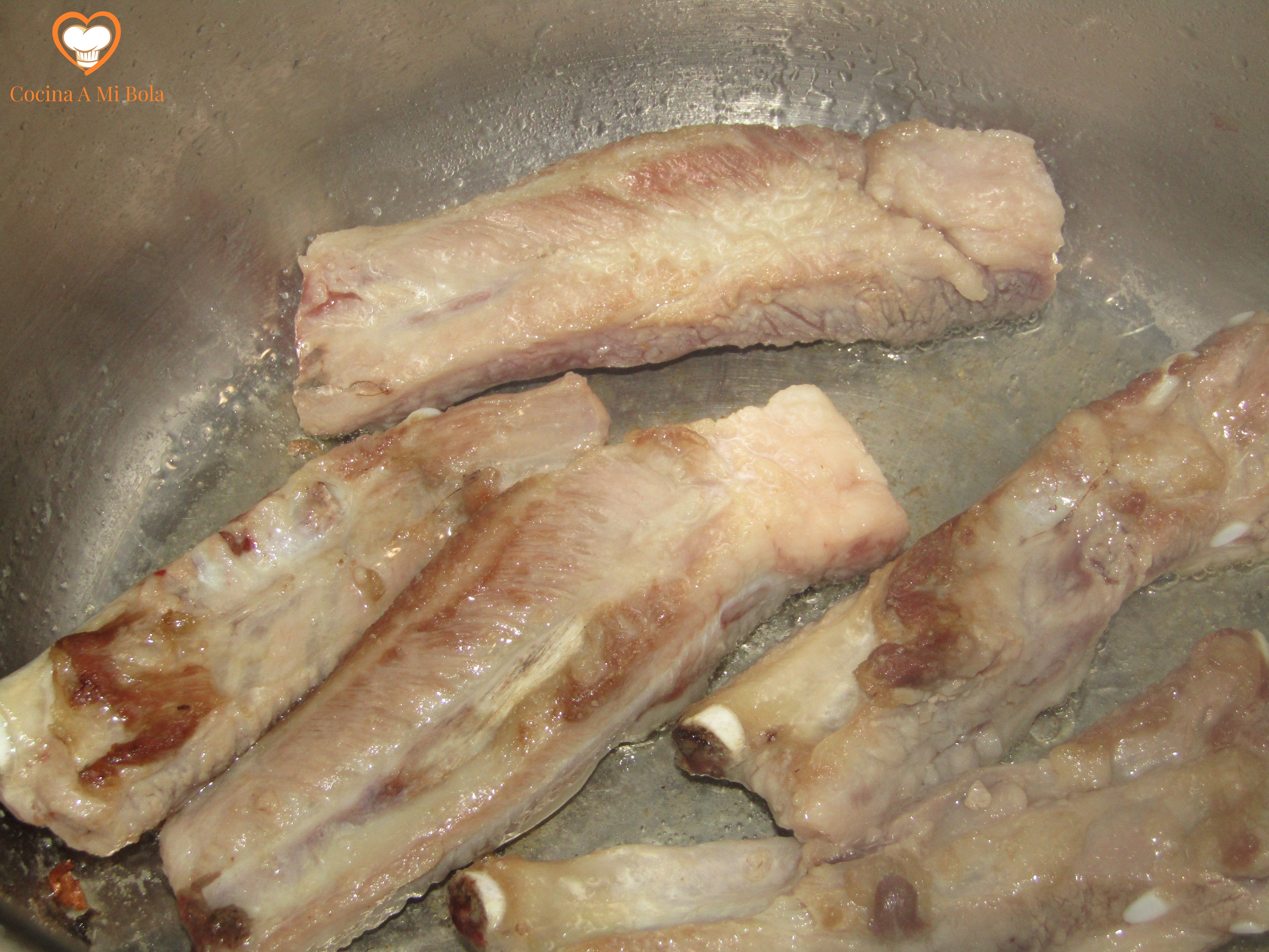 CUARTO.- Pon en el fondo de la olla express unas lágrimas de aceite. Lo suficiente para cubrir el fondo con una fina capa. Salpimenta las costillas y ponlas a dorar con fuego medio alto. No se trata ya de que tomen color y se selle el poro de la carne sino de que se licúe la grasa más densa y la suelte al fondo de la olla para poder eliminarla. La entreverada (la de la fotografía) quedará y dará un sabor exquisito a la carne. Una vez doradas, las sacamos a un bol y las reservamos.