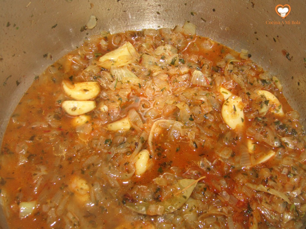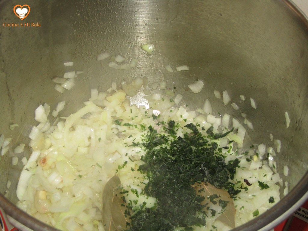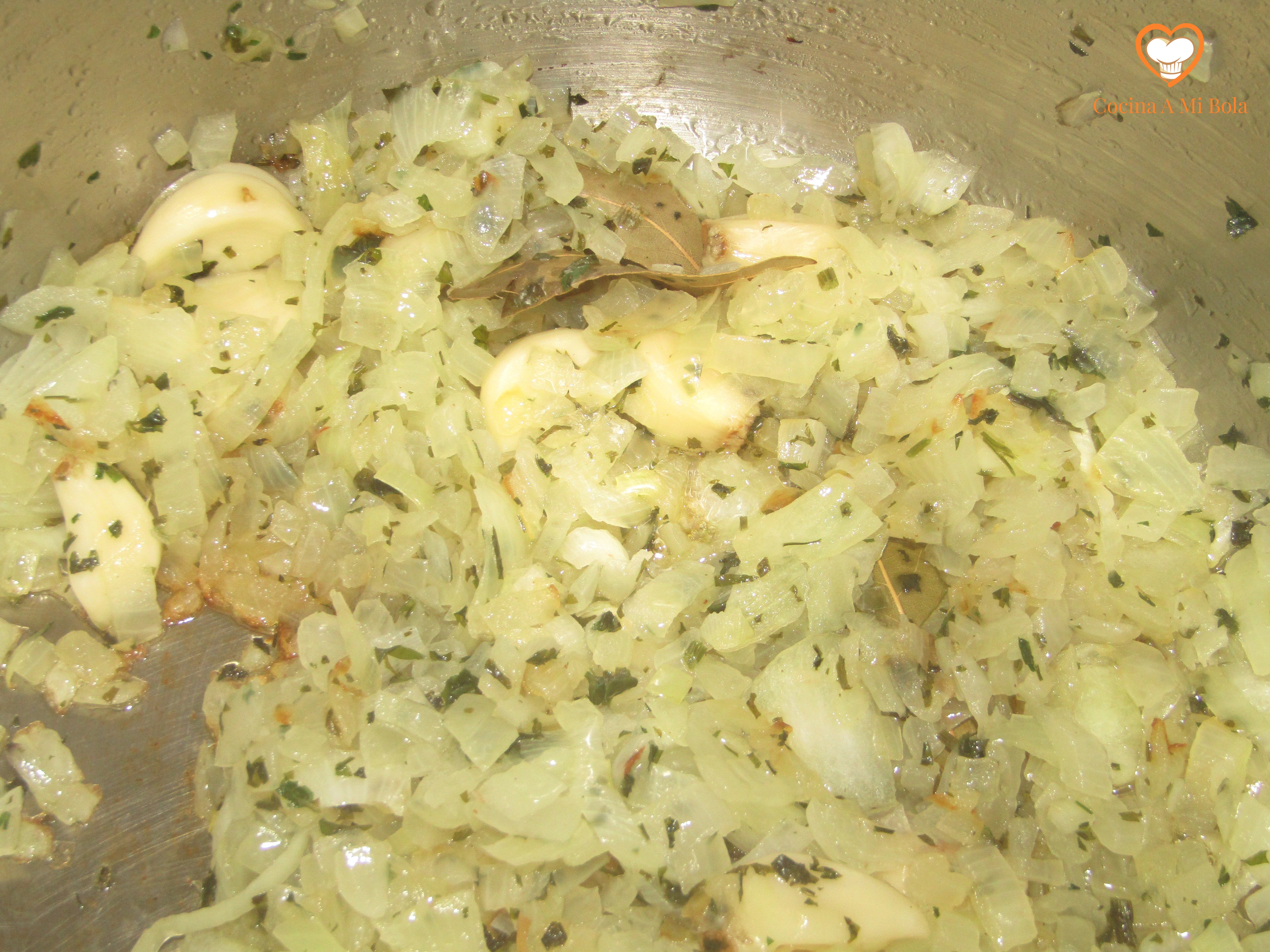 QUINTO.- Ahora picamos las cebollas. Lo que correspondería sería echarlas a pochar en esa abundante grasa que han soltado las costillas. Me consta que así se ha hecho siempre y se sigue haciendo en casi todos los bares, restaurantes rurales y ventas de España. El sabor que aporta esa grasa es inmejorable, pero ya hace mucho que la cultura (y el sentido común) entraron en la cocina. Es una barbaridad ingerir esa cantidad de grasa animal y además es muy indigesta, así que elimina toda la que hay en el fondo de la olla y pon un poco de aceite de oliva virgen extra. Ahora sí, pochamos la cebolla picada, los dientes de ajo pelados enteros y el perejil. Añade el laurel y salpimenta y sazona con cominos (pocos), orégano y tomillo. Esto no es un consejo de cocina pero procura deshacerte de esa grasa de un modo ecológico para que no acabe en el mar o en los ríos en forma de espumas y natas.