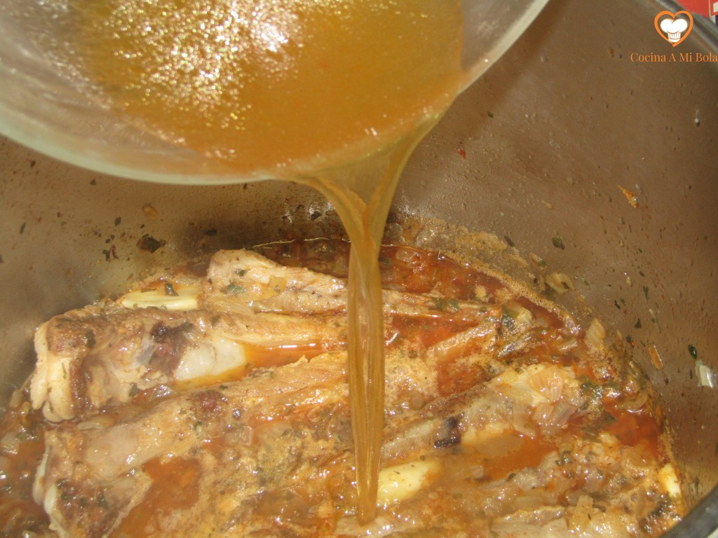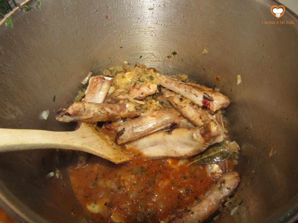 SEXTO.- Una vez que la cebolla esté tierna, retiramos del fuego momentáneamente, echamos el pimentón y removemos deprisa para que no se queme. Añade el vino blanco y vuelve a darle calor. Agregamos las costillas removiendo para que rehogue todo un par de minutos y evapore el alcohol, tras lo cual, añadimos jugo del asado de los pimientos hasta que llegue a 2/3 del nivel que alcancen las costillas. No hace falta que las cubra.