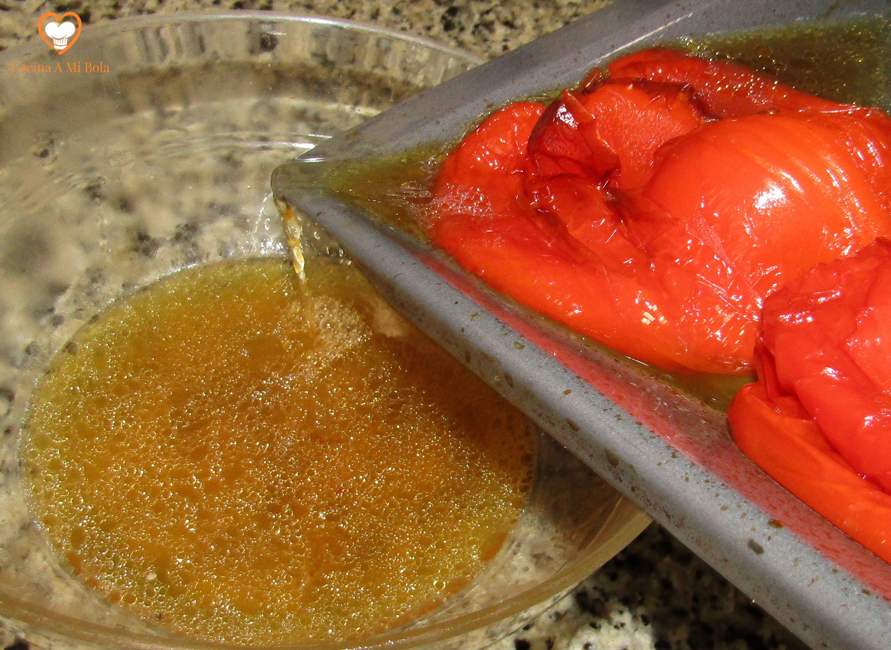 PRIMERO.- Lavaremos los pimientos y los pondremos a asar en el horno a 170ºC, ventilación y calor arriba y abajo, durante unos 25 minutos. Sigue las instrucciones de la receta “pote de pimientos” y no te olvides de reservar el jugo que han dejado tras su asado.