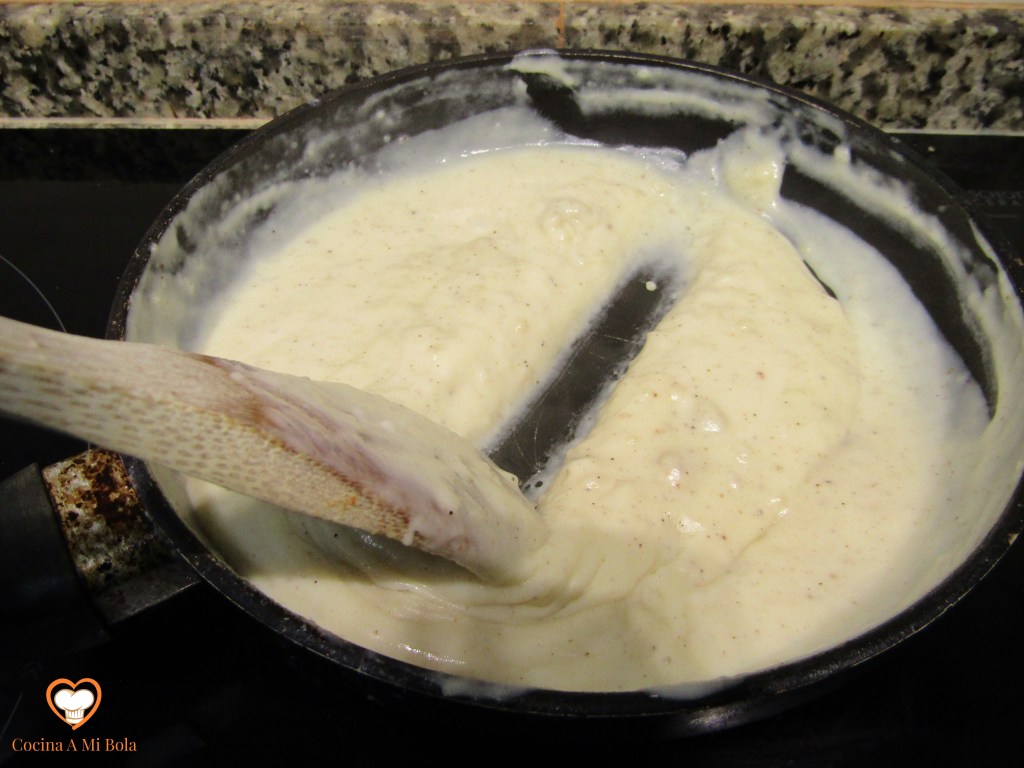 PRIMERO.- El primer paso es hacer una salsa bechamel como te explico aquí y que puedes darle más sabor si utilizas aceite de oliva virgen extra en el que hayas frito bastante ajo en láminas a baja temperatura. Ojo con las cantidades porque si es para 1 sandwich no debes poner más de 20 gramos de harina por cada 100 cc de leche. No olvides la nuez moscada, la sal y la pimienta, pero no abuses de las especias porque taparás el sabor del jamón. Una vez hecha, tápala para que no se reseque la superficie y déjala templar.