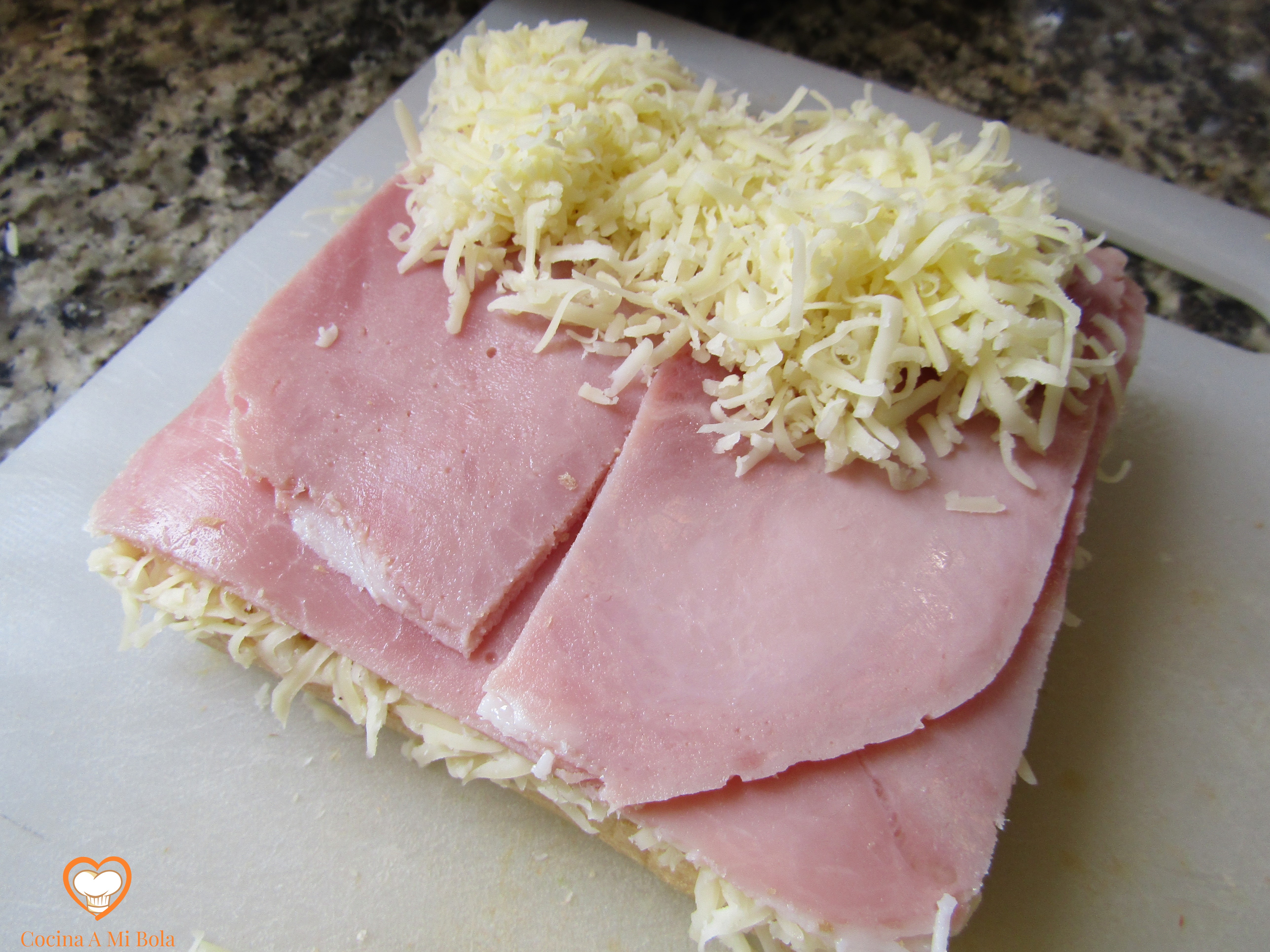 CUARTO.- Pon sobre el queso una buena capa de jamón. Ya he comentado que si es ahumado o braseado es mucho mejor porque es el ingrediente con sabor “más débil” y de este modo lo potenciamos un poco. Procura cortarlo al tamaño de la rebanada para que no sobresalga de ésta y como te digo… sé generoso.